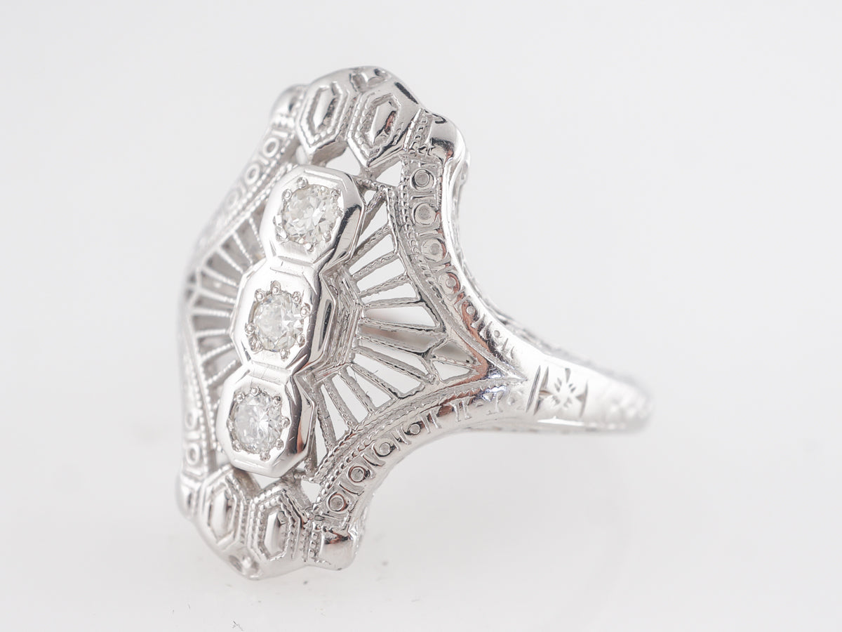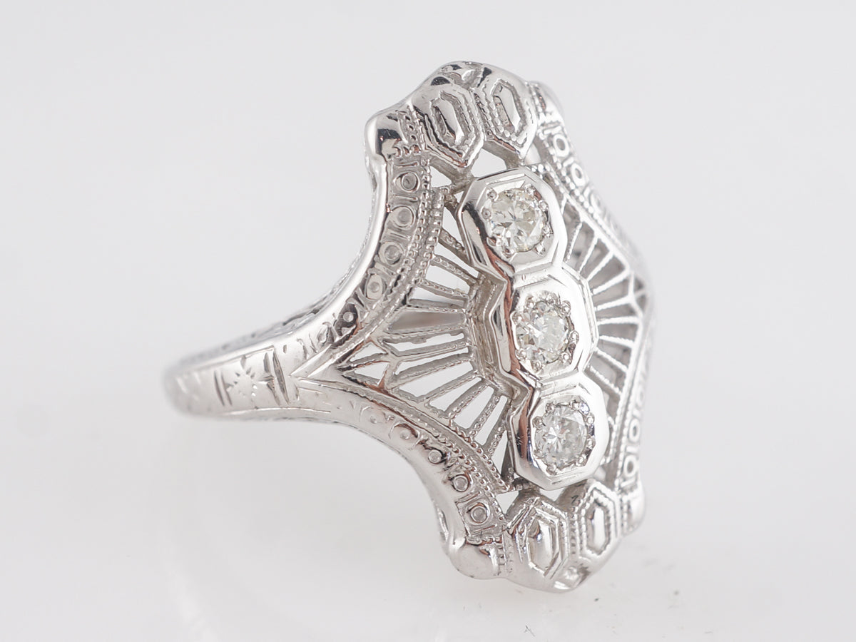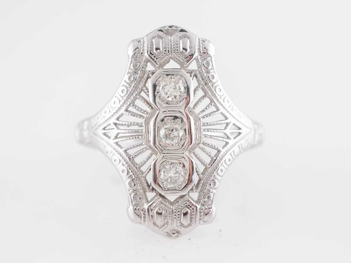 Art Deco Filigree Three Stone Diamond Ring in 18K