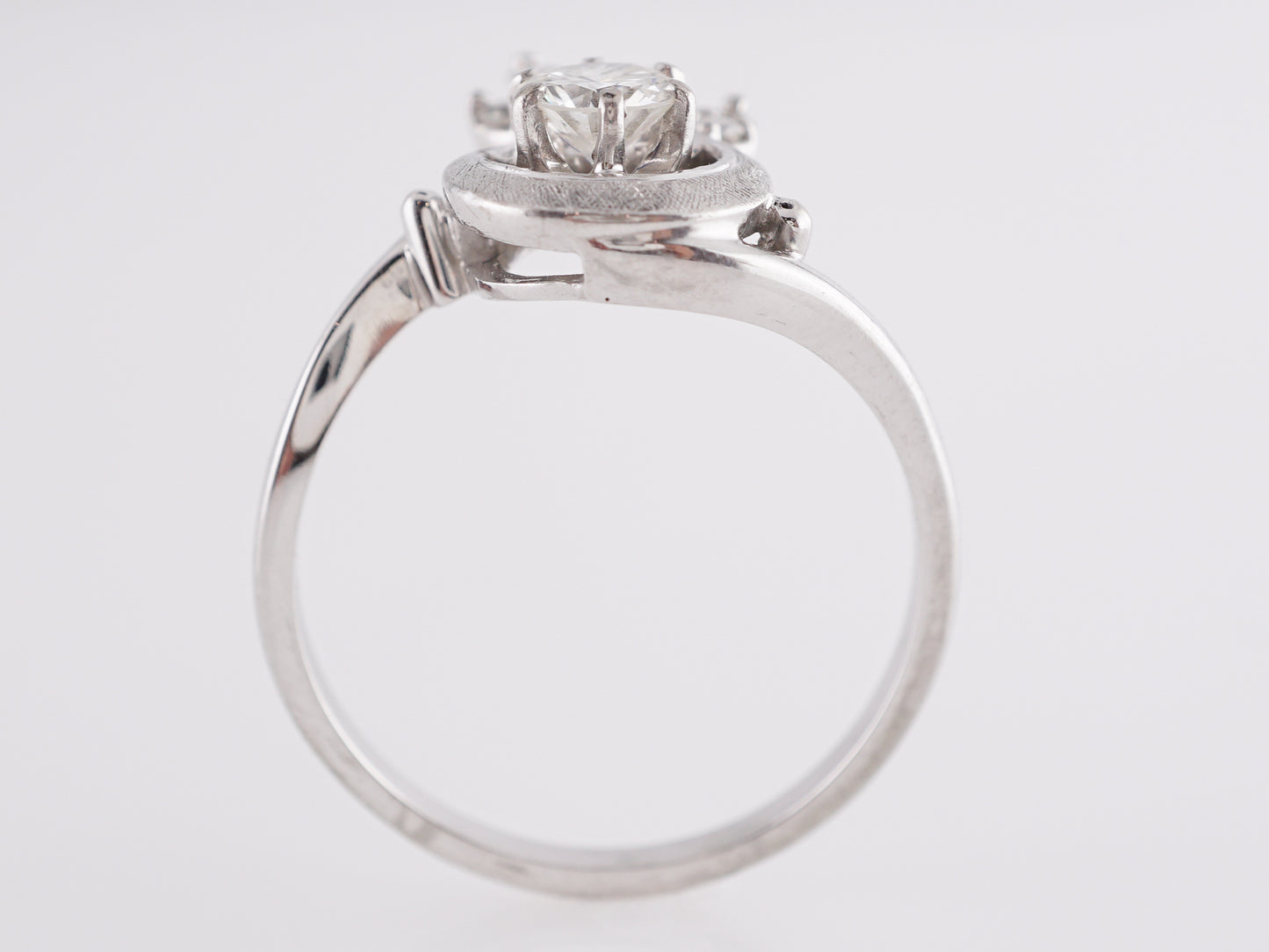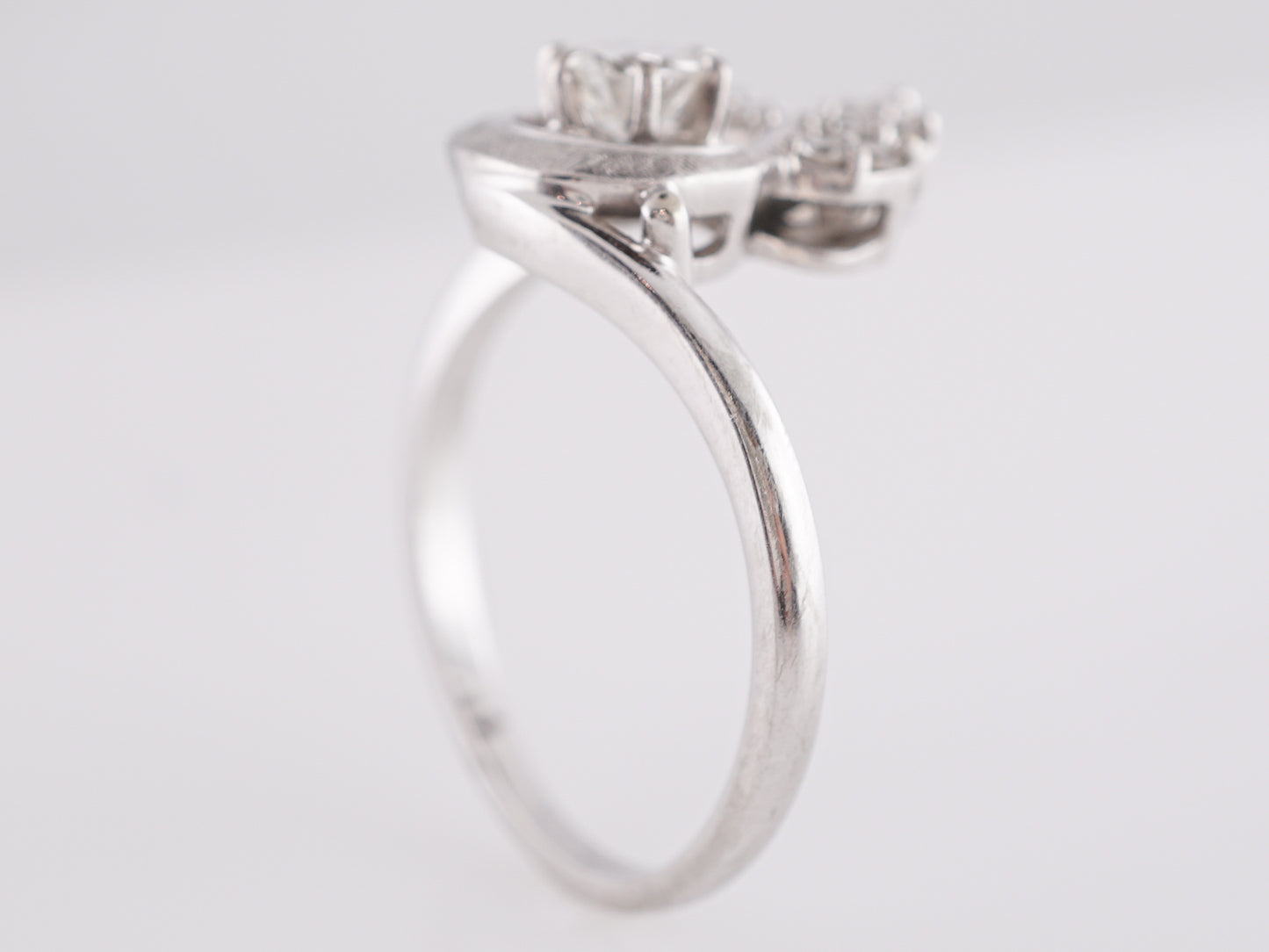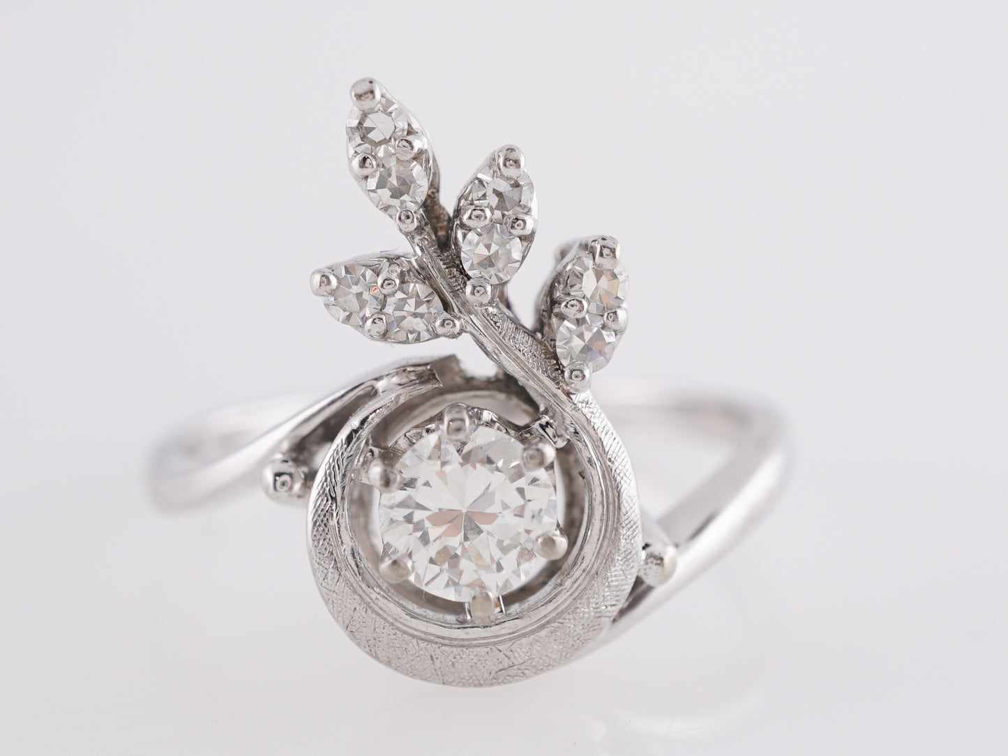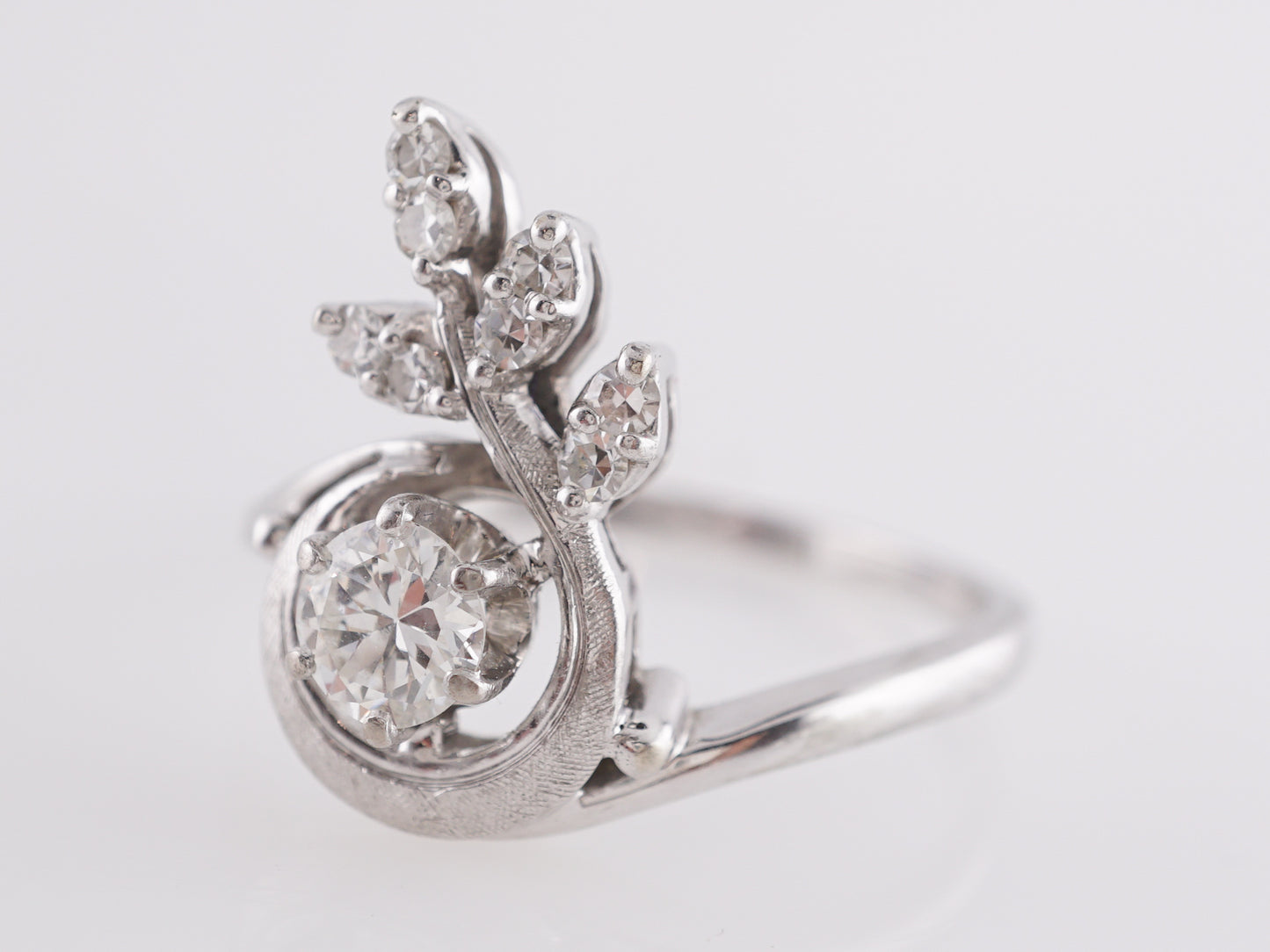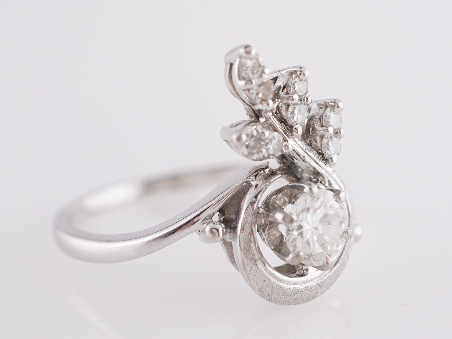 Art Deco Floral Cluster Diamond Ring in 18K White Gold. This gorgeous, ornate Art Deco ring features a .38 carat Old European cut diamond in 18k white gold. The primary natural diamond has a color grade H is prong set on a floral designed mounting. A cluster of accent diamonds, each weighing 1.9 carats, form the leaves that protrude from the center stone. The bypass band style in 18k white gold gives this ring a sultry movement that showcases the precision and craftsmanship of Art Deco era jewelers. This ring reaches 5.3mm above the finger and can be resized upon request.