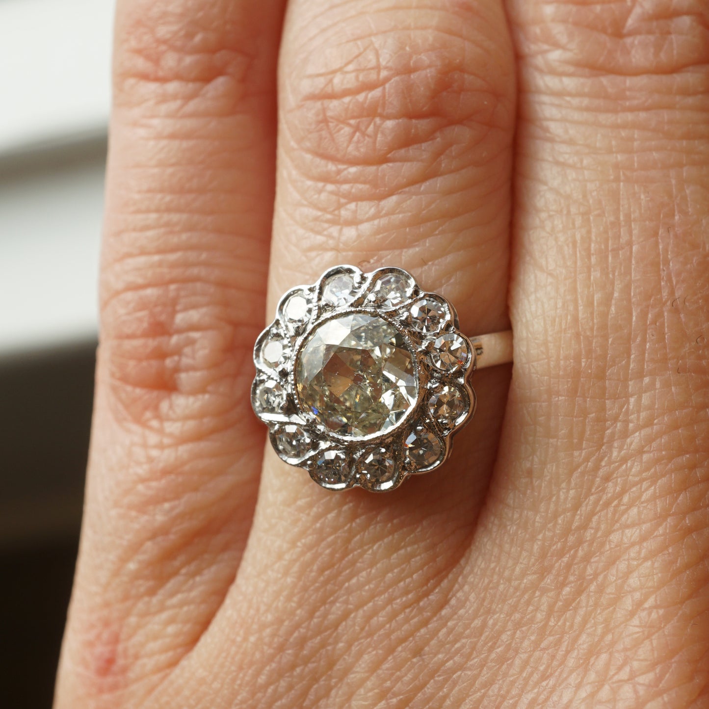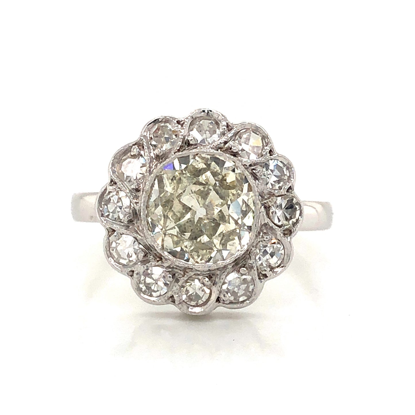 This beautiful Art Deco engagement ring features a 1.12 carat old European cut diamond and diamond accents in 14 karat white gold. The center diamond has a glittering, soft champagne hue. A floral cluster ring with elegant shape. Twelve (12) .03 carat single cut diamonds halo the center stone. The accent diamonds reflect a brighter, near colorless color rating that adds soft dimension of tone and a collective sparkle. From the profile, the diamonds are mounted in a classic basket and finished on a polished 14K white gold band.
