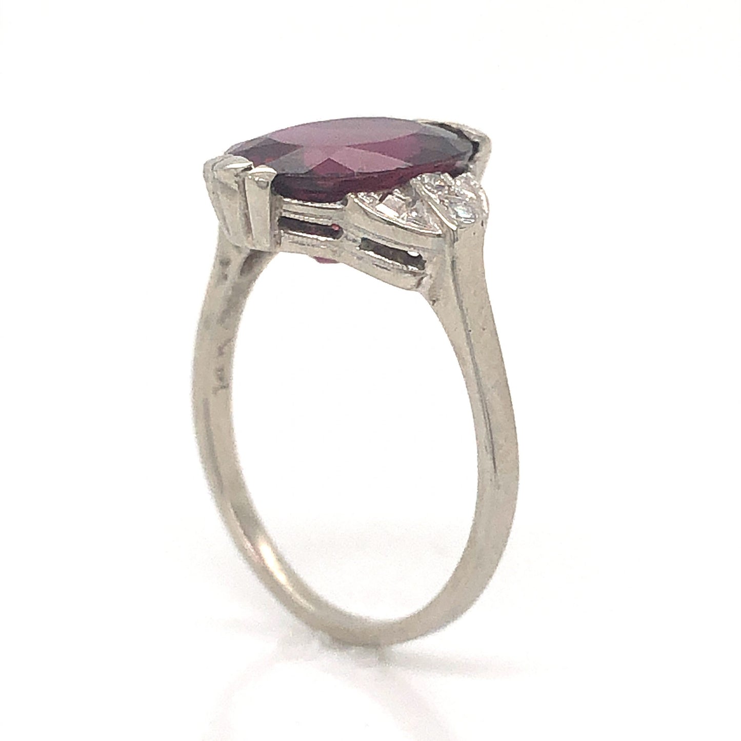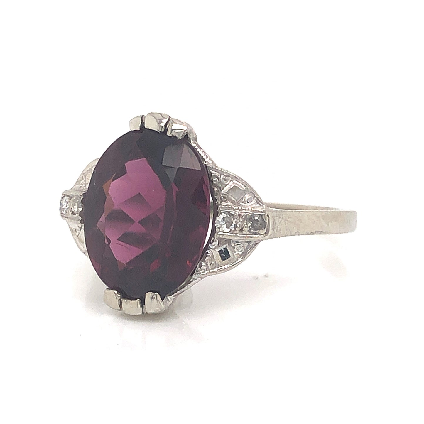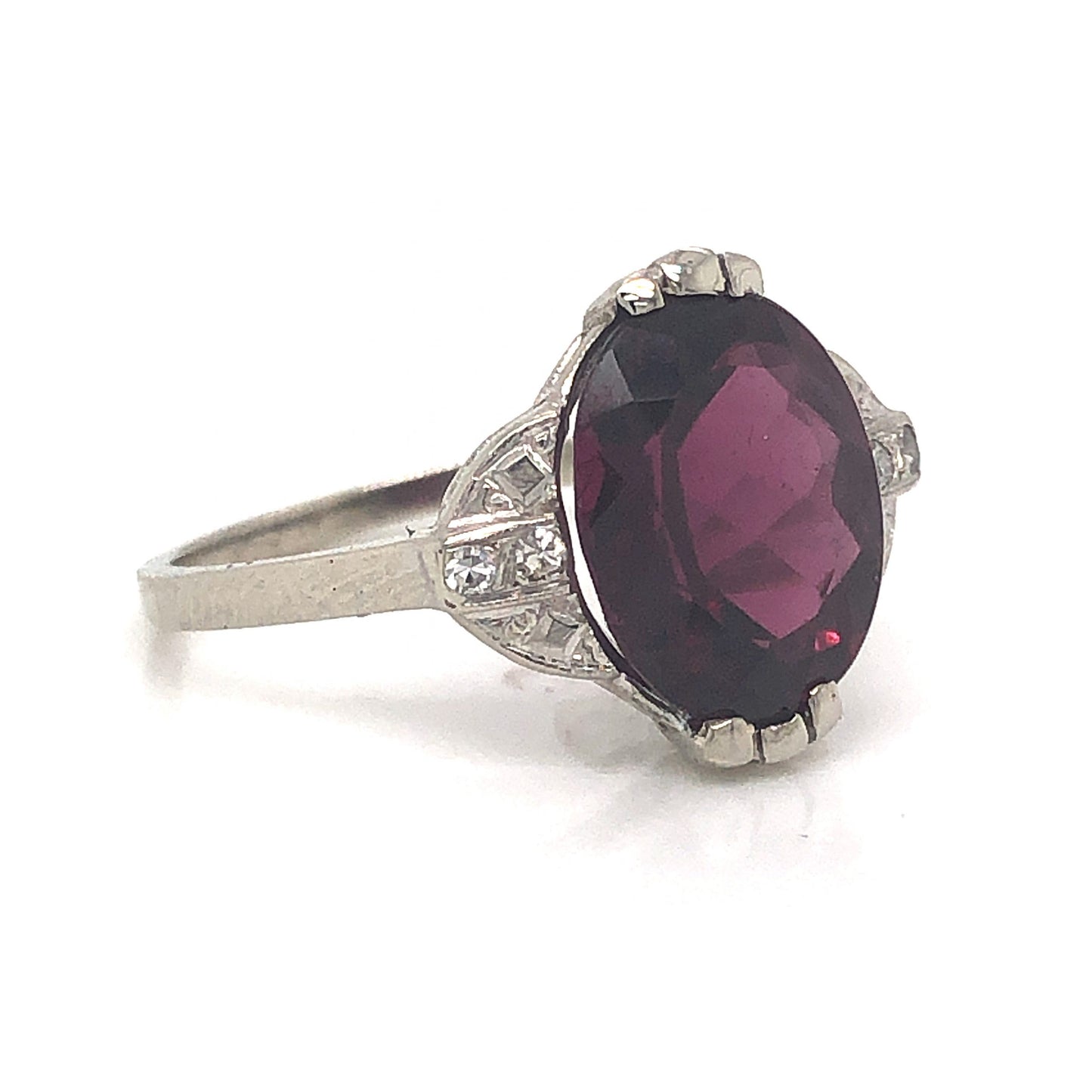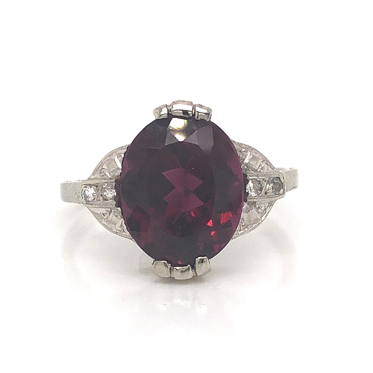 Art Deco Garnet Cocktail Ring w/ Diamonds in 14k White Gold. This elegant Art Deco cocktail ring features a 4.35 carat red garnet and accent diamonds in 14 karat white gold. The center garnet has a highly saturated, burgundy red hue. The garnet is set in claw prongs and accented by four (4) .01 carat single cut diamonds on the shoulders of the band. The geometric shoulders and basket of the ring showcase iconic Art Deco details, finished on a polished 14 karat white gold band.