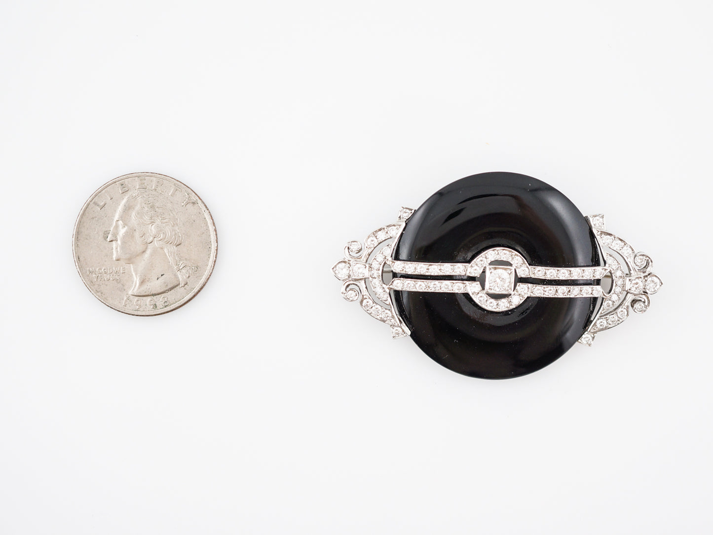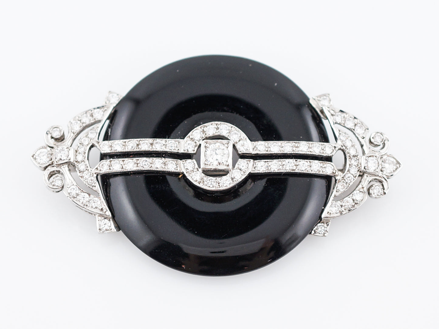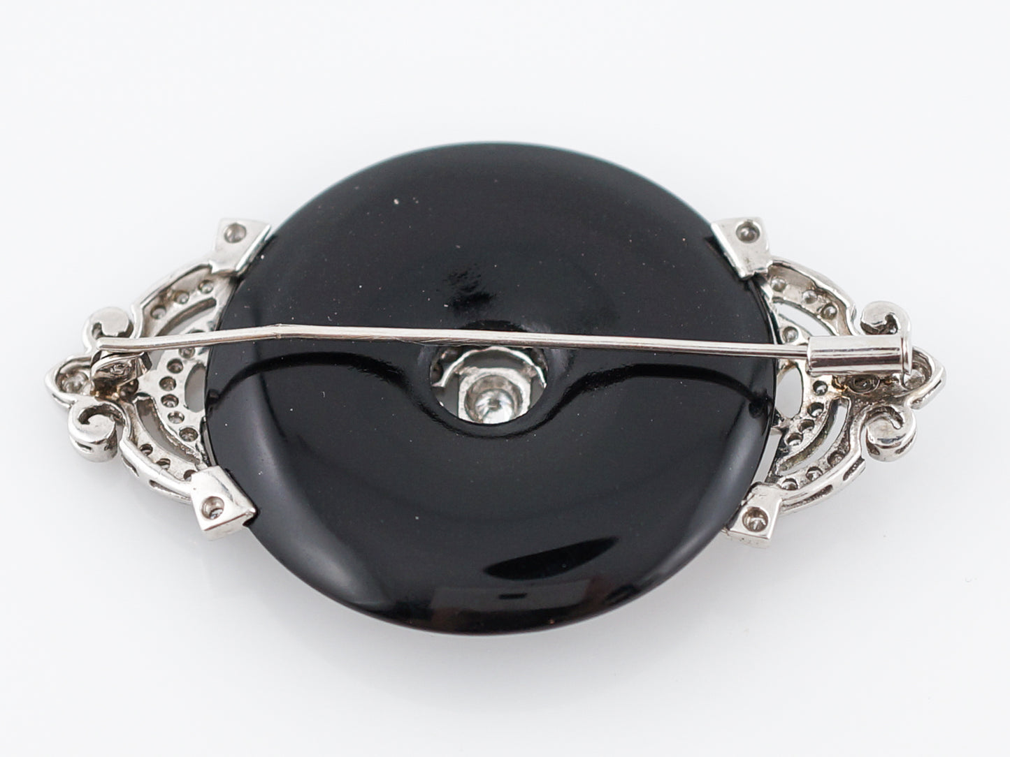 We are happy to recommend all the places you can wear this incredible Art Deco Inspired, Modern Era Brooch on your scarf, a bag, in your hair, the possibilities are endless. Made with a cabochon cut Onyx and adorned with .16 carats total weight of diamonds and set in 18 karat white gold, this brooch has all charm of an Era long ago.