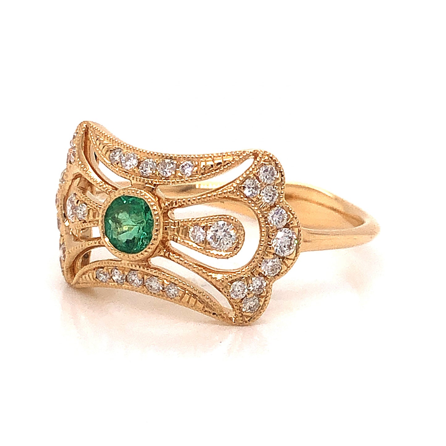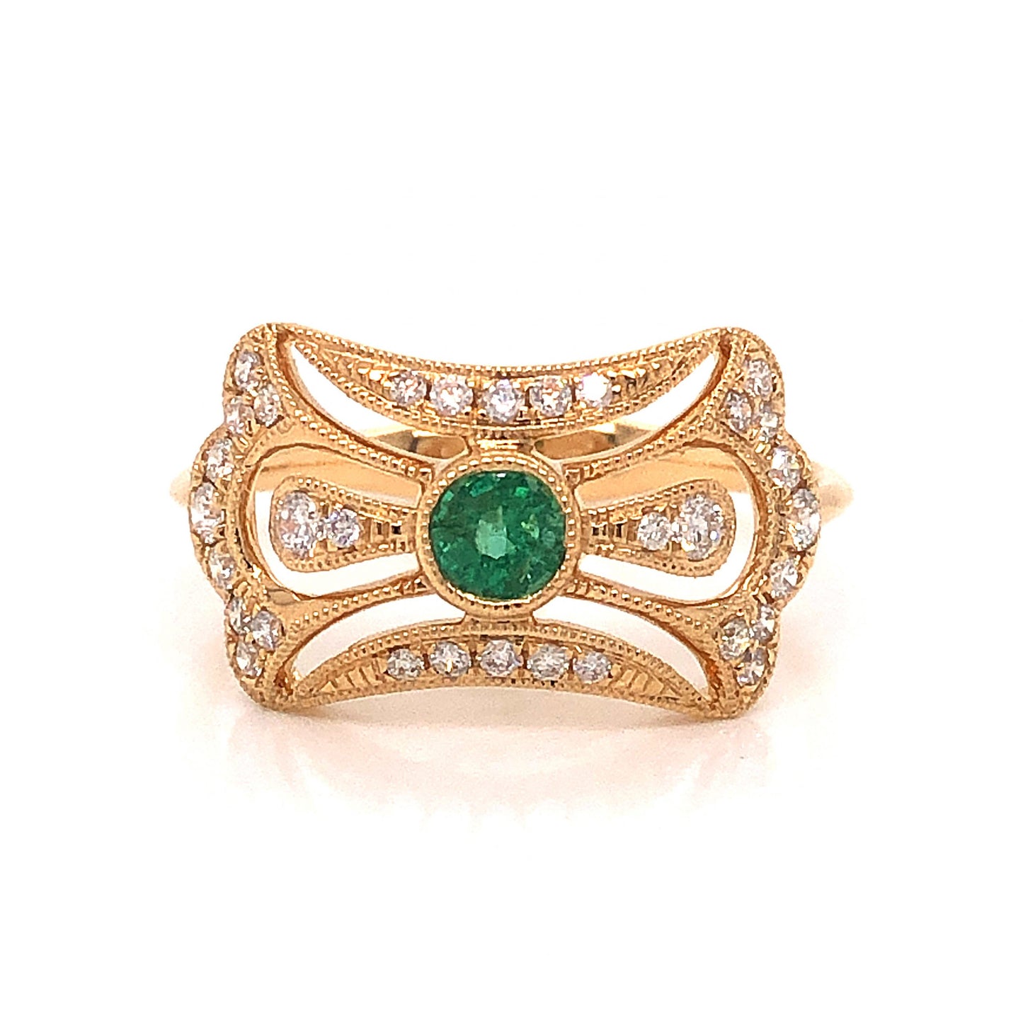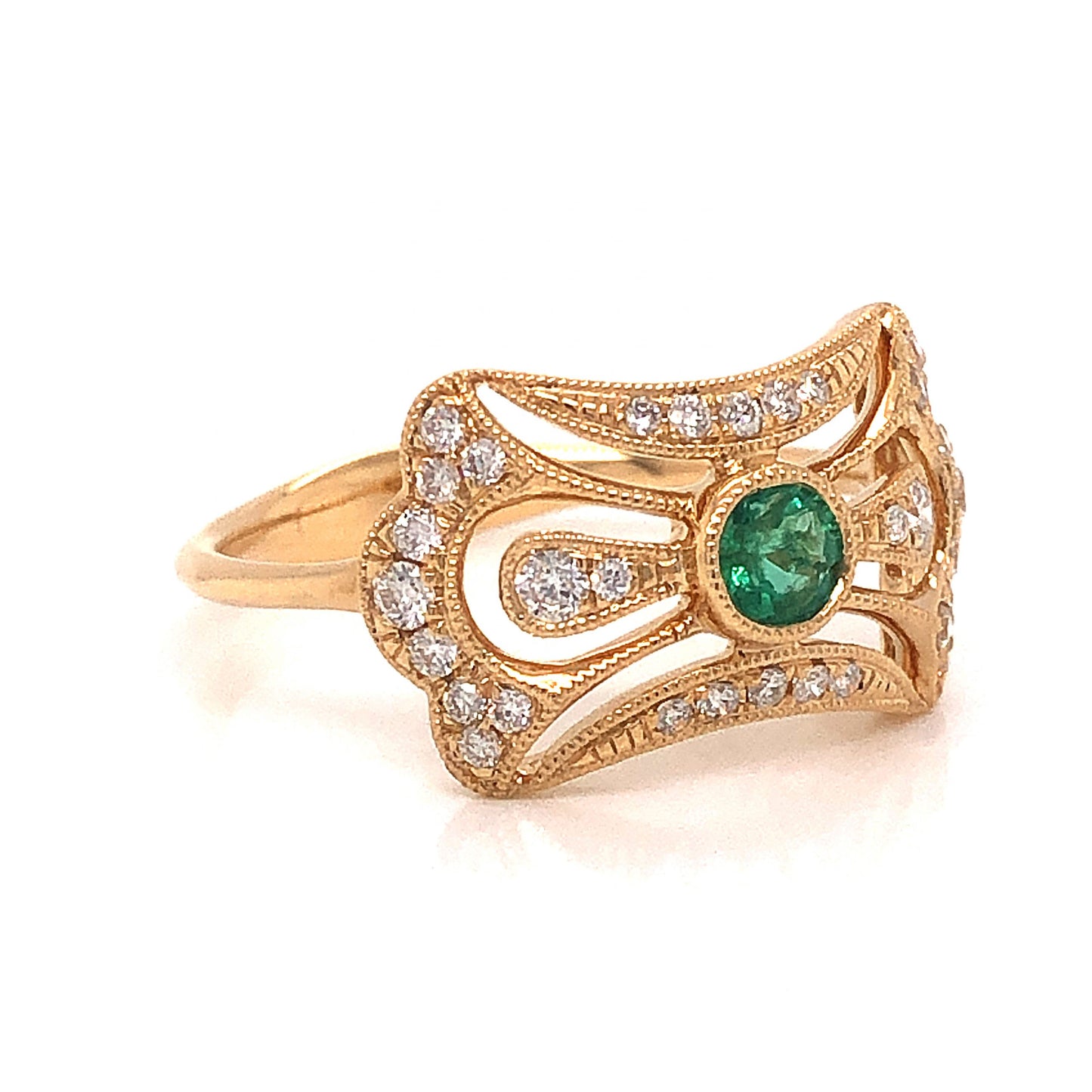 Eye-catching unforgettable! This stunning Art Deco-inspired statement ring features a .19 carat round cut emerald and accent diamonds in 18 karat yellow gold. Modern openwork in 18K yellow gold houses a collection of thirty-two (32) white diamonds. At the center, the green emerald is bezel set and radiant. The face of the ring has a pinched rectangle shape, finished in milgrain engraved 18 karat yellow gold. Shop more Rings.