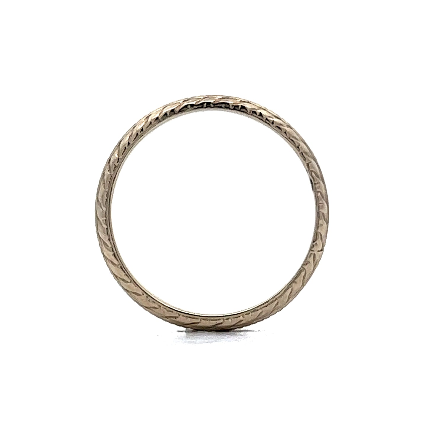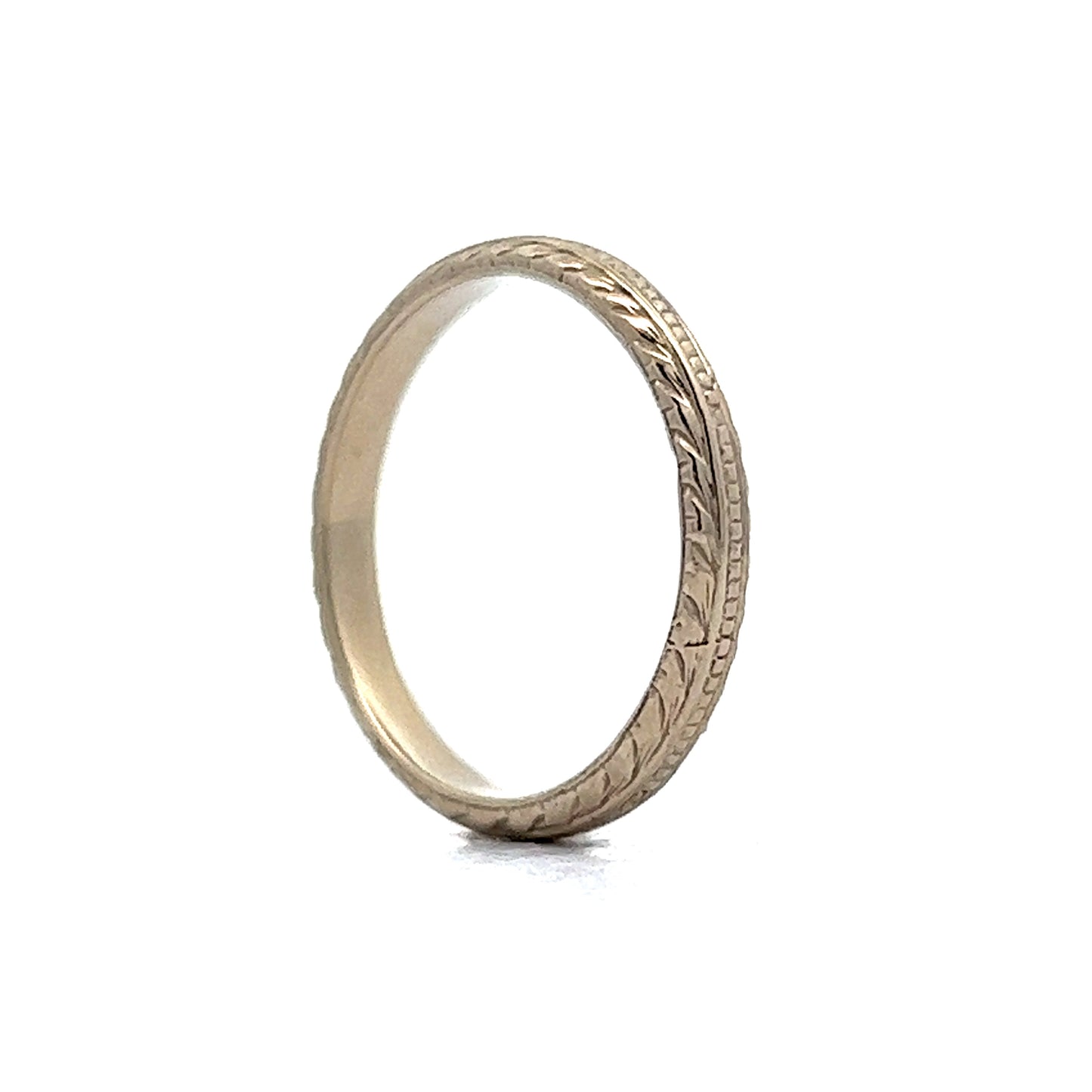 Art Deco Wedding Band w/ Wheat Pattern. This ring has an ornate repeating wheat pattern on the outward facing edges that runs the full length of the band. The repeating pattern was often used to symbolize eternal love. It was a popular design motif in Art Deco wedding bands. This unique wedding band is composed of 14k white gold.