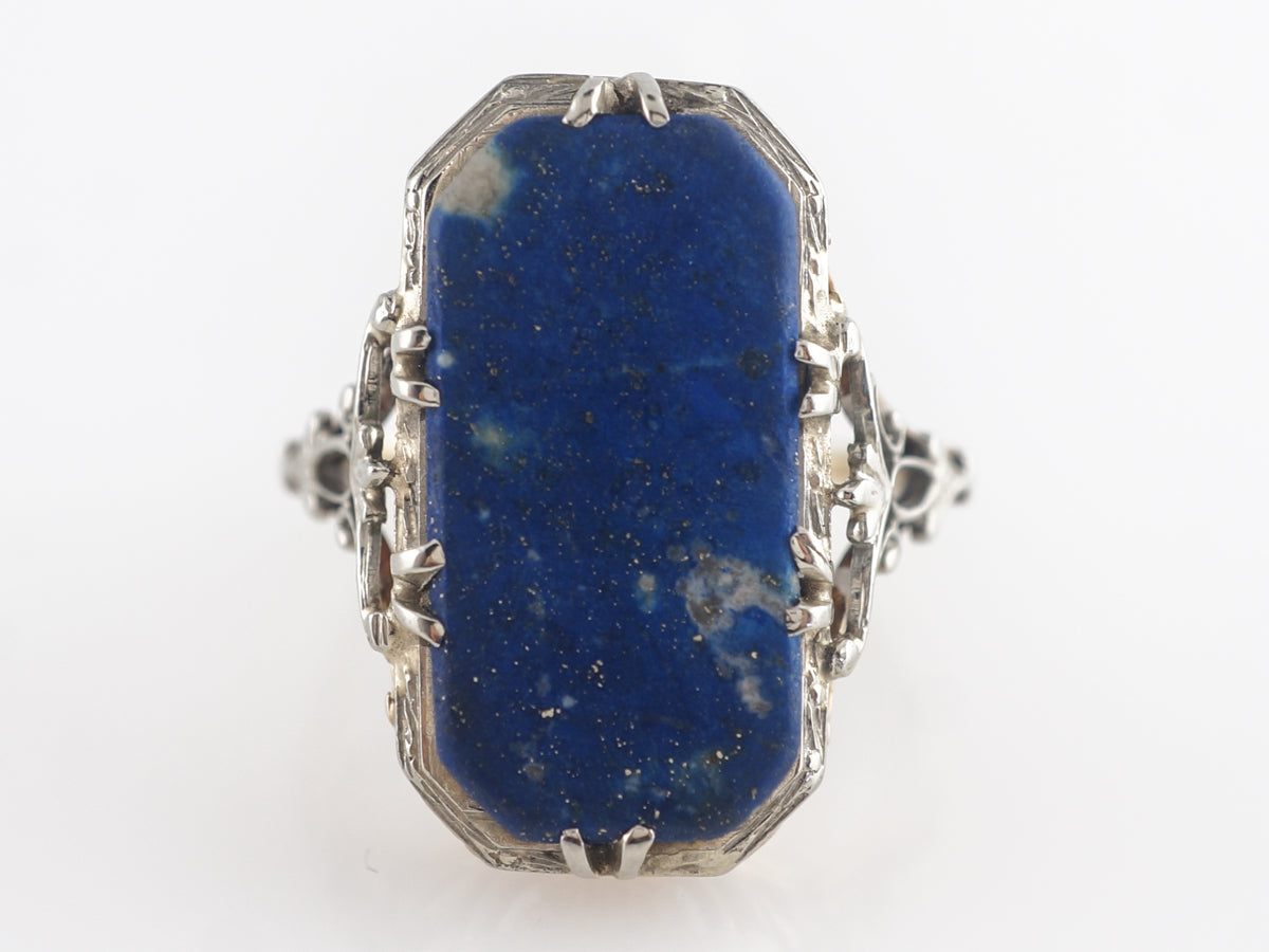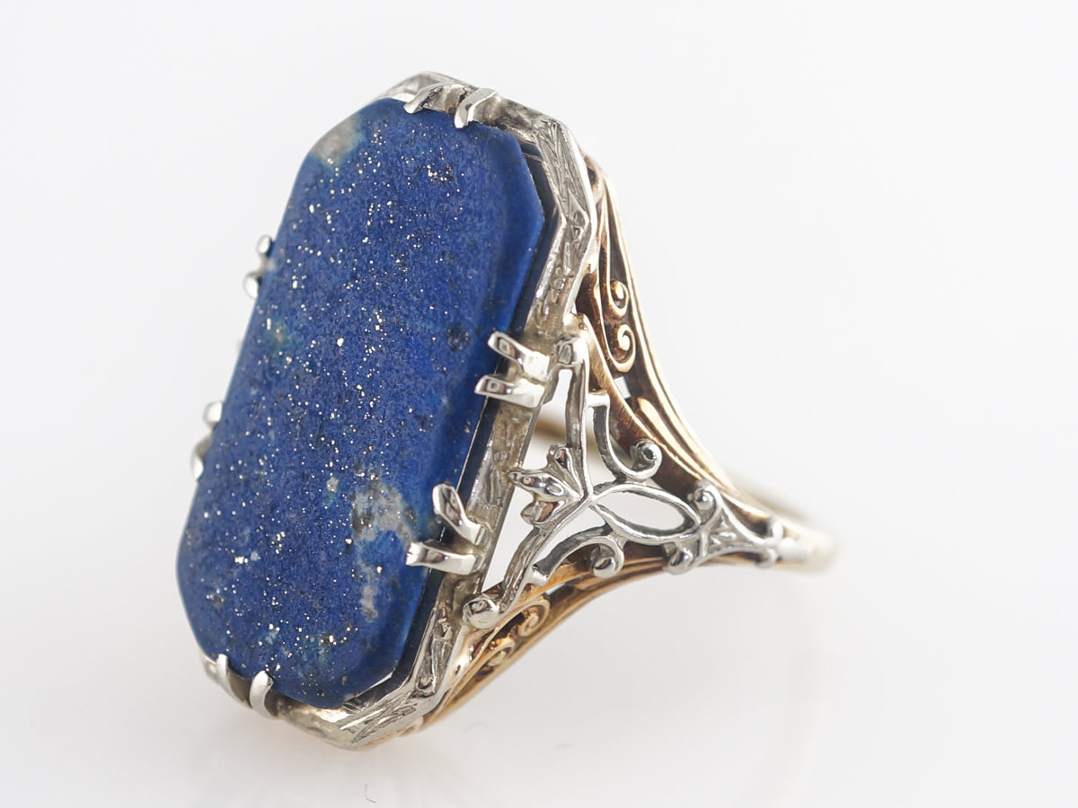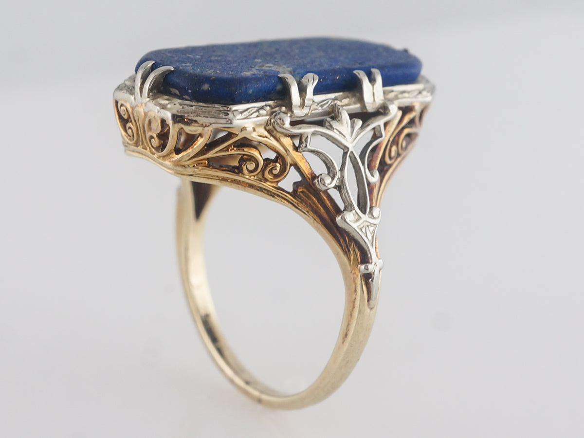 Art Deco Lapis Lazuli Ring in Yellow White Gold.  This Art Deco cocktail ring features a 2.94 carat piece of cabochon cut lapis lazuli set in 14 karat white and yellow gold. The mounting is a beautiful example of filigree wire work, with gorgeous twisting wires in the contrasting metal colors. The small details like claw style prongs and open spaces add a bit more to this bold vintage ring.
