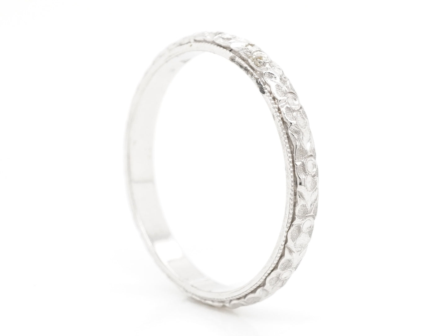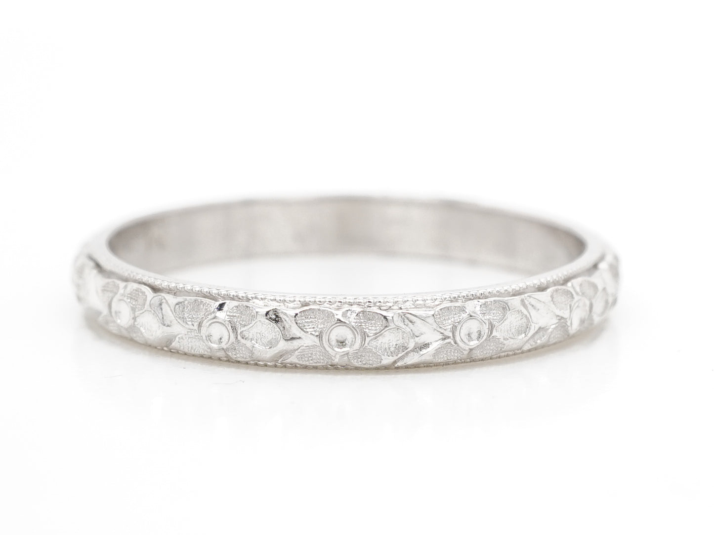 Art Deco Milgrain Engraved Wedding Band in Platinum. This Art Deco wedding band features a rippled floral design and milgrain trim set in shimmering platinum. The texture of this wedding band is both subtle and thoughtful. If you are looking for a ring with style that is durable and comfortable to wear, this wedding band would be the perfect choice!