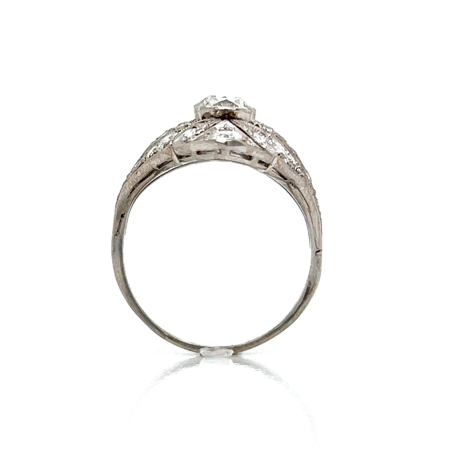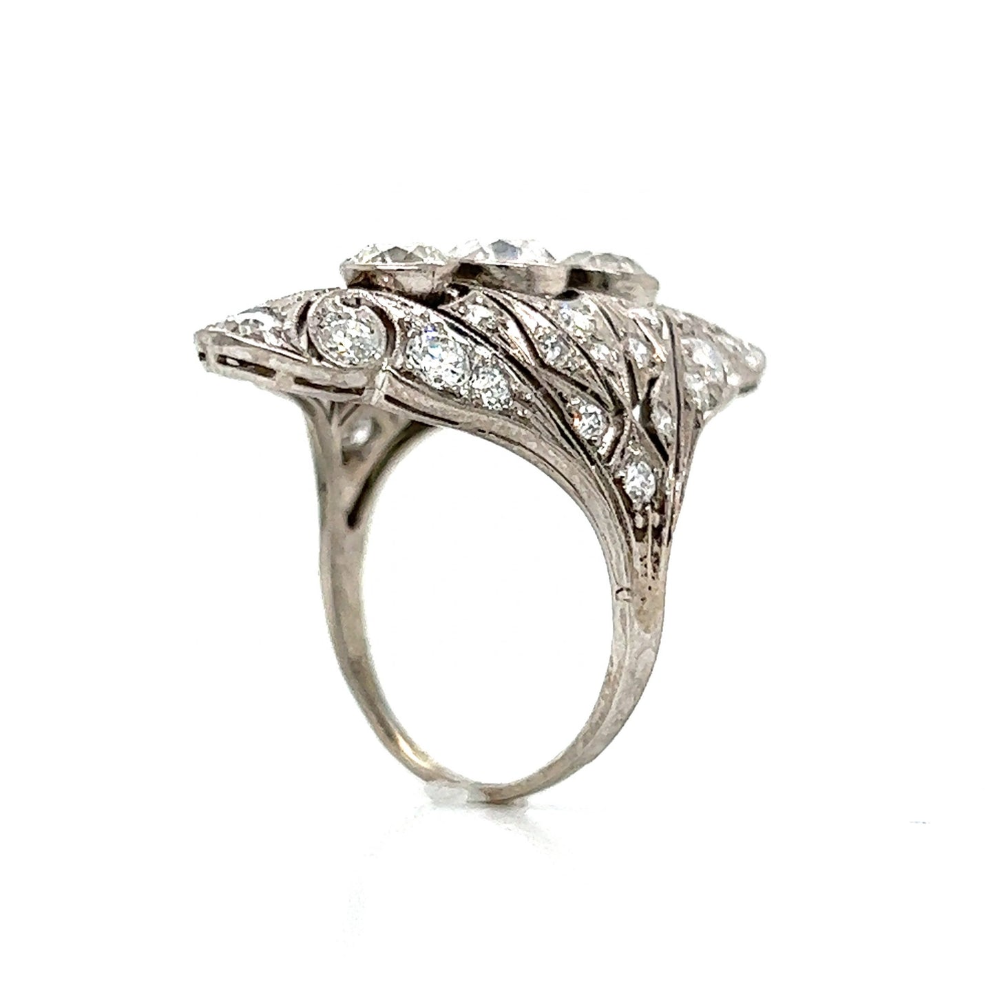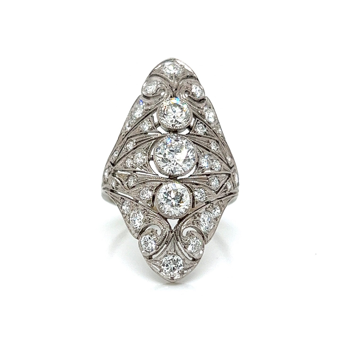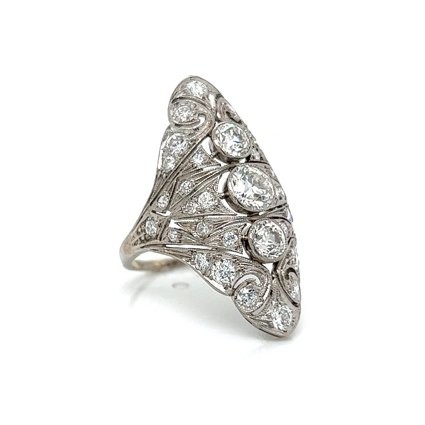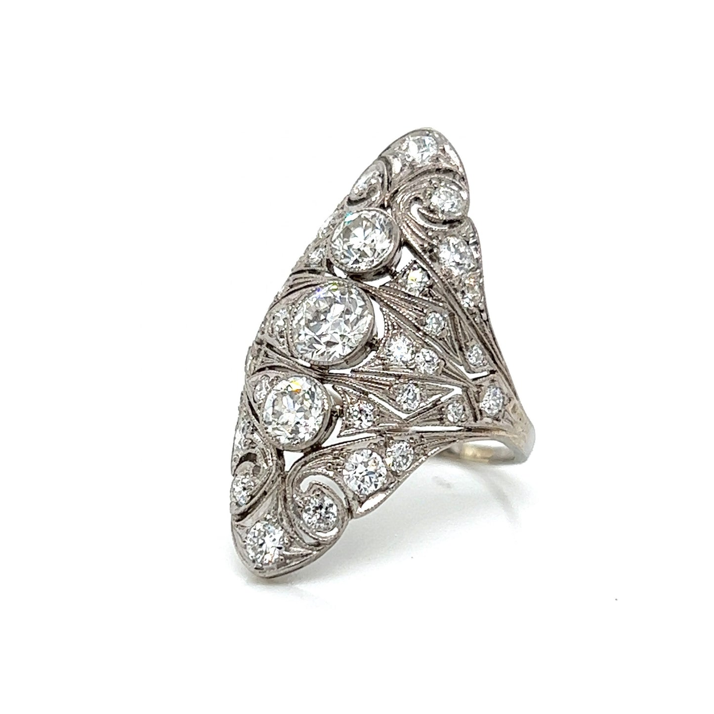 This fabulous Art Deco cocktail ring features 2.20 total carats of diamonds in shimmering platinum. The classic navette style features beautiful baroque-inspired swirls and plenty of milgrain detail to add dimension to the “little ship” shape. Three (3) old European cut diamonds line the center of the ring. A collection of accent diamonds are bead set throughout, so that this right hand ring sparkles from every angle. A treasure from the Art Deco era!