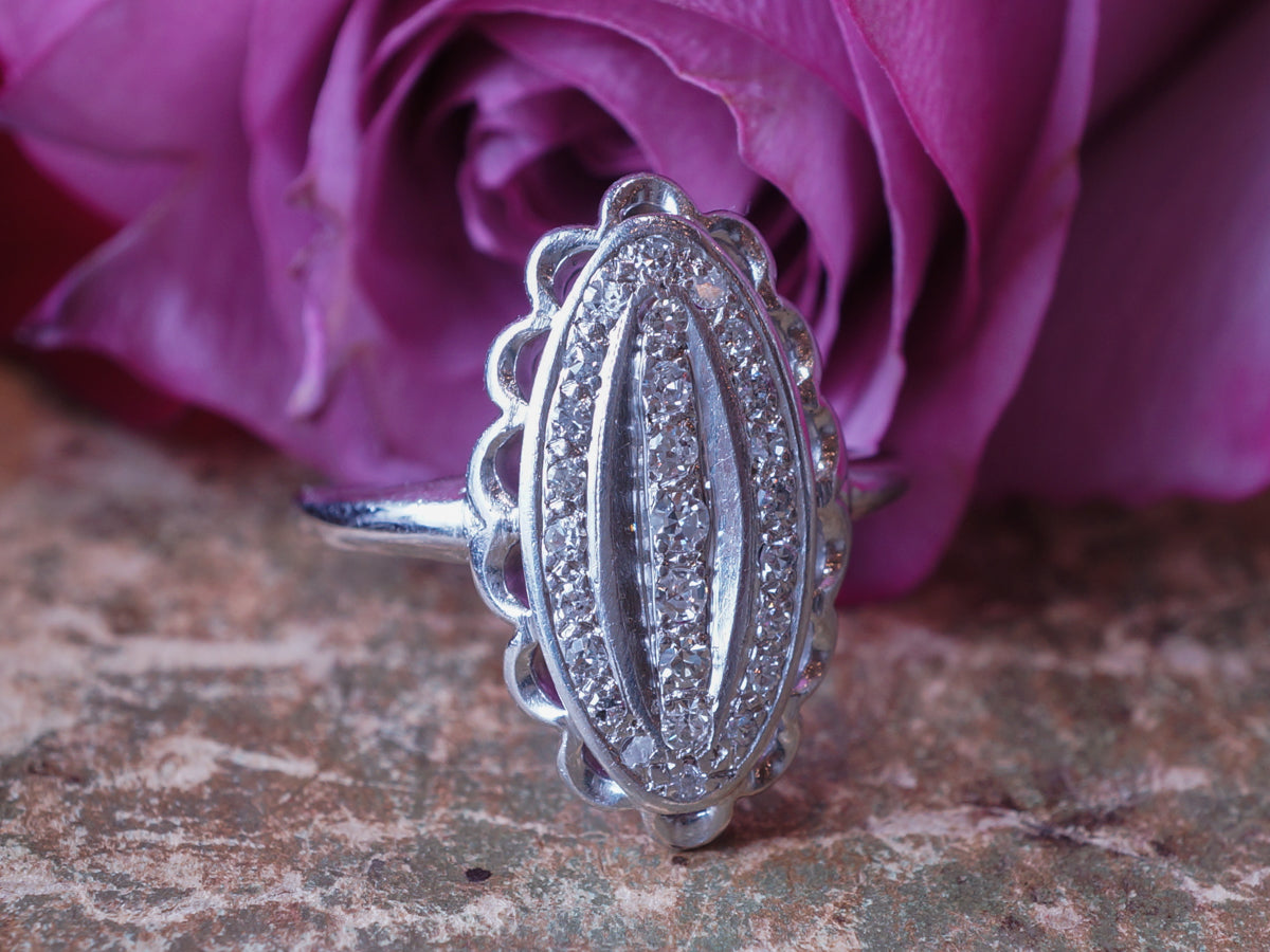 Art Deco Navette Ring w/ Diamonds 14k White Gold. This dazzling Art Deco navette ring features .285 carats of single cut diamonds and is finished in 14 karat white gold. The mounting has a lovely design with slight open spaces separating a central line of diamonds from the outer ring, and all enclosed in a fluted repetition of polished white gold. This is an amazing Art Deco ring at a great price point for a gift to someone very special.