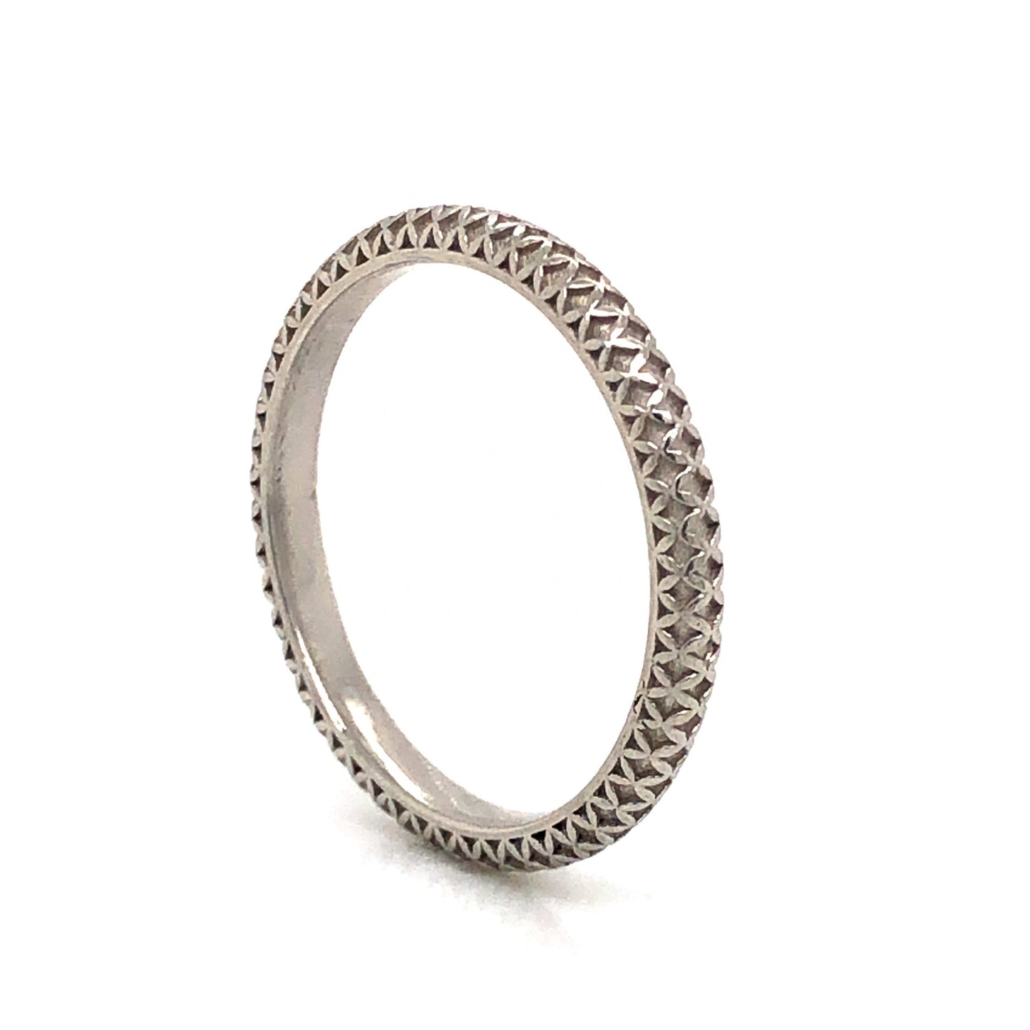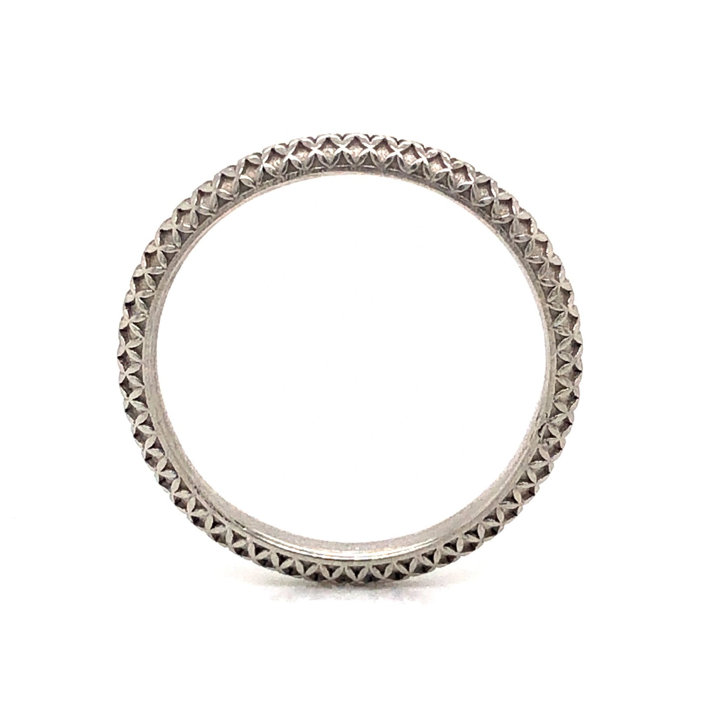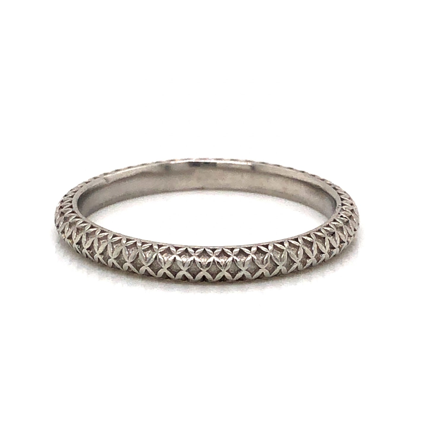 This stunning Art Deco wedding band features an ornate pattern engraved in polished platinum. A pattern of symmetrical X shapes are imprinted on the rounded shank. The inside of the band is smooth and polished, comfortable for daily wear. Strong chic. This streamlined vintage wedding band is truly one of a kind.
