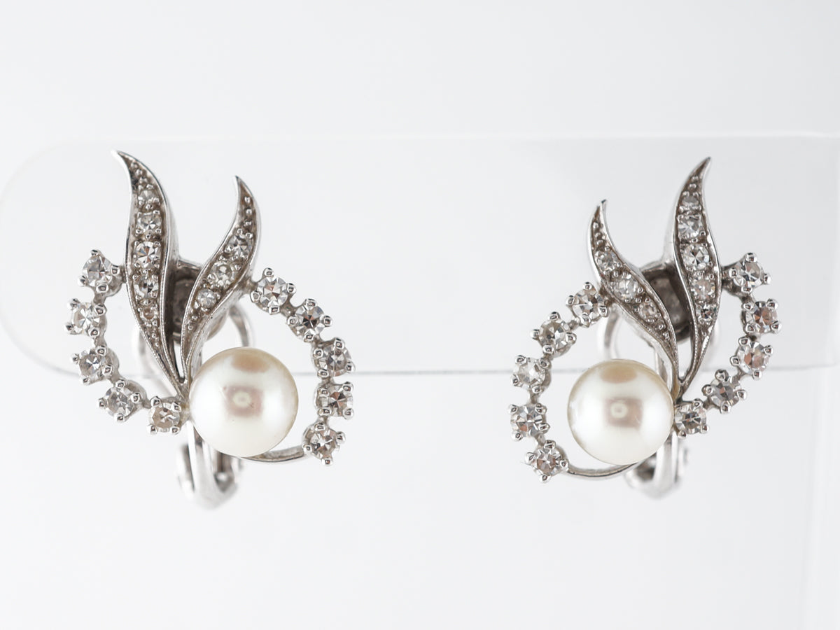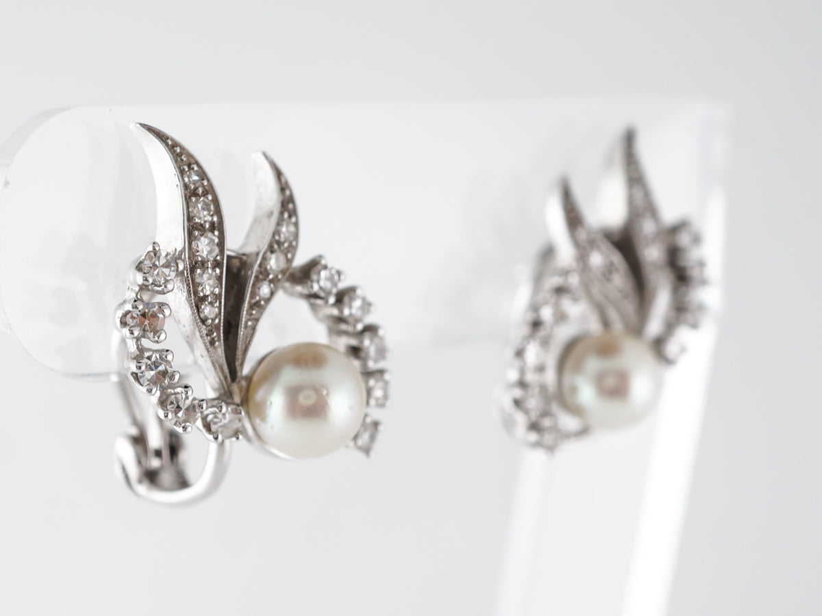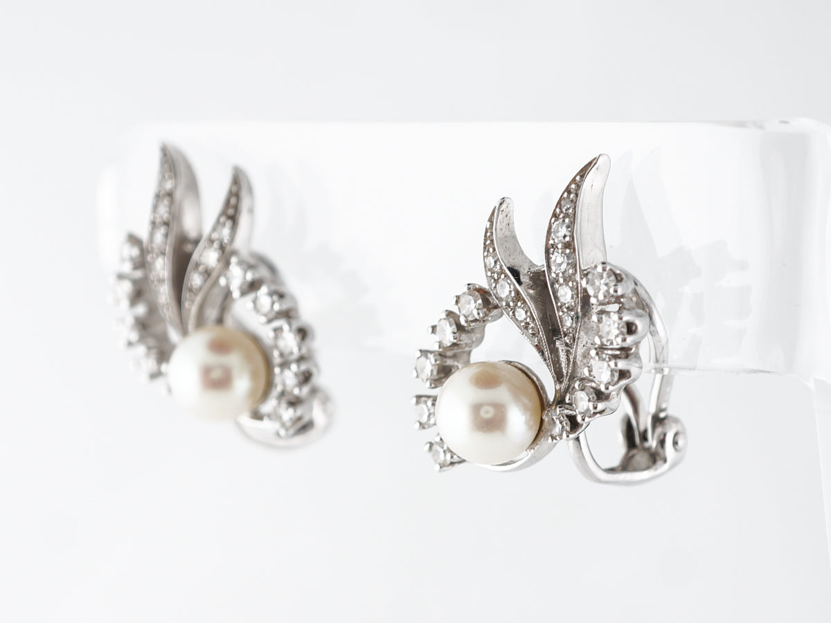 Art Deco Pearl Earrings w/ Diamonds in 14k White Gold