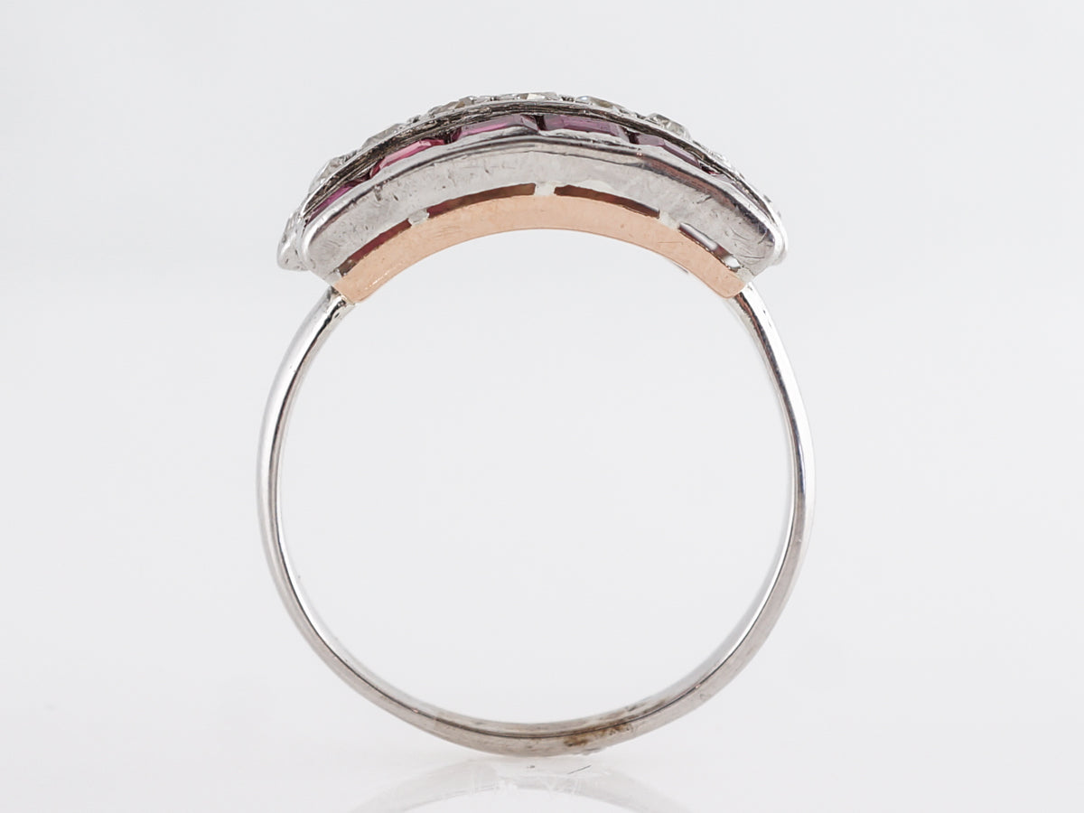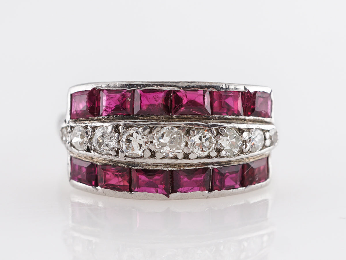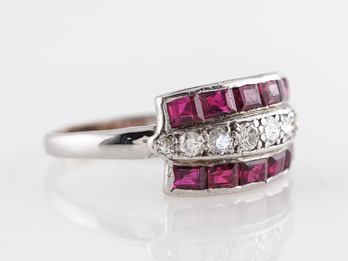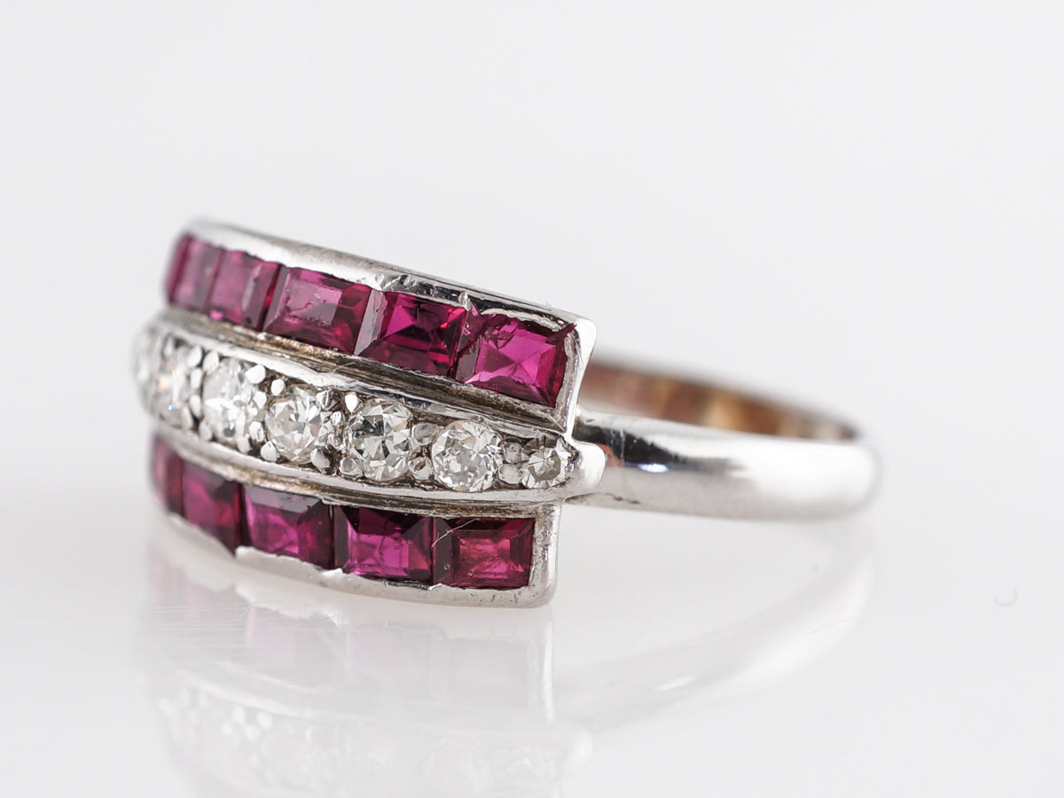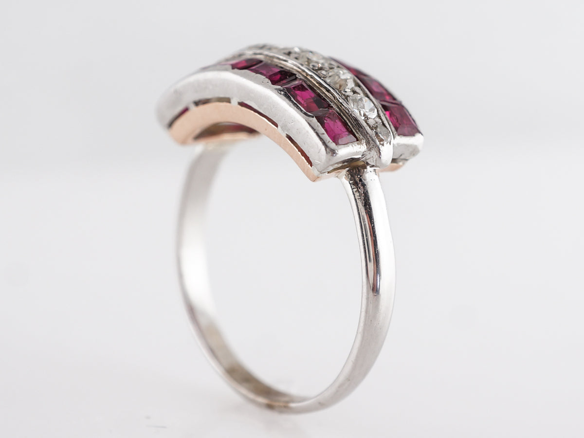 Art Deco Ruby and Diamond Cocktail Ring in 14k White Gold. This fabulous Art Deco cocktail ring features 1.32 carats of emerald cut rubies and .19 carats of single cut diamonds set in 14 karat white gold. The neat symmetry of the design allows the wonderful contrast of colors to take center stage. The rubies are channel set above and below the diamonds, which are prong set down along the center of the ring. If you are after a bit of flashy color in a great vintage mounting, this is the ring for you.