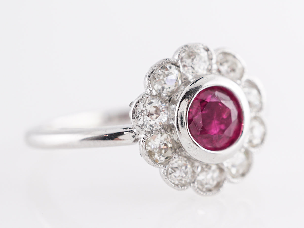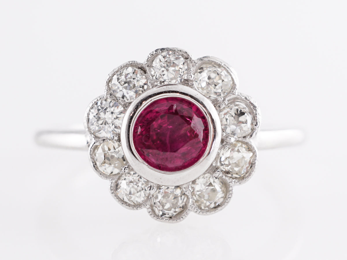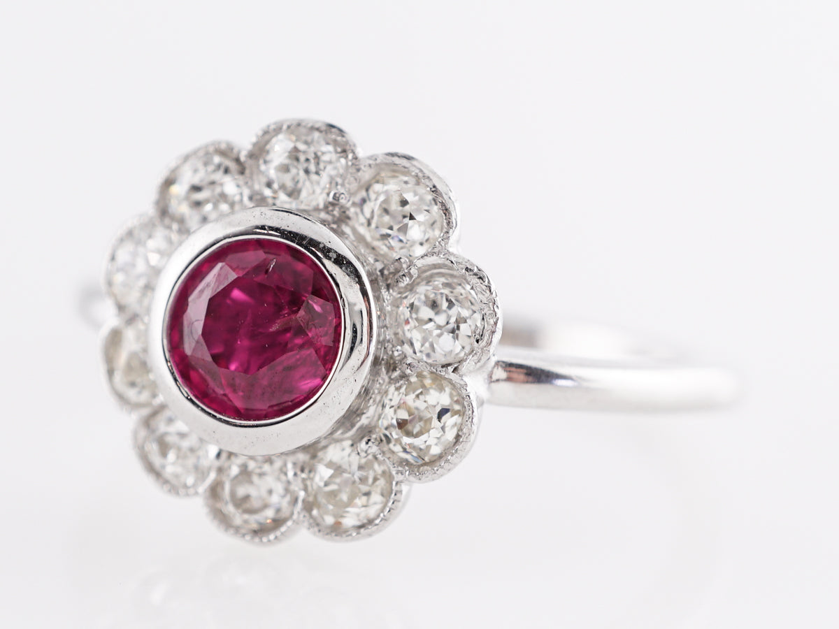 Art Deco Ruby Engagement Ring in 18k White Gold. This engagement ring features a .89 carat Round Brilliant cut, natural red ruby accented by old mine cut diamonds. Each of the .10ct old mine cut diamonds are as beautiful as the center ruby and the polished 18k white gold band gives this engagement ring a mystic beauty. Born of the Art Deco period between 1915 1939, this lovely ruby engagement ring is an antique from another world.