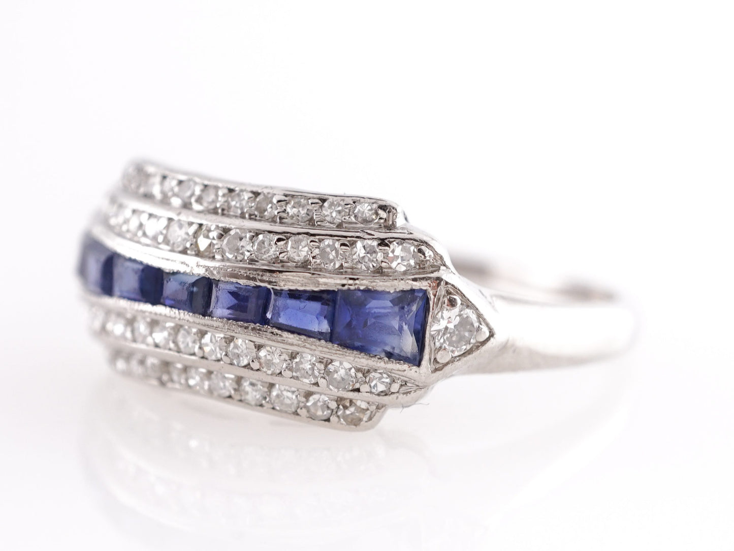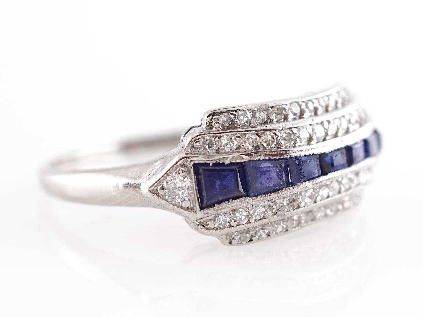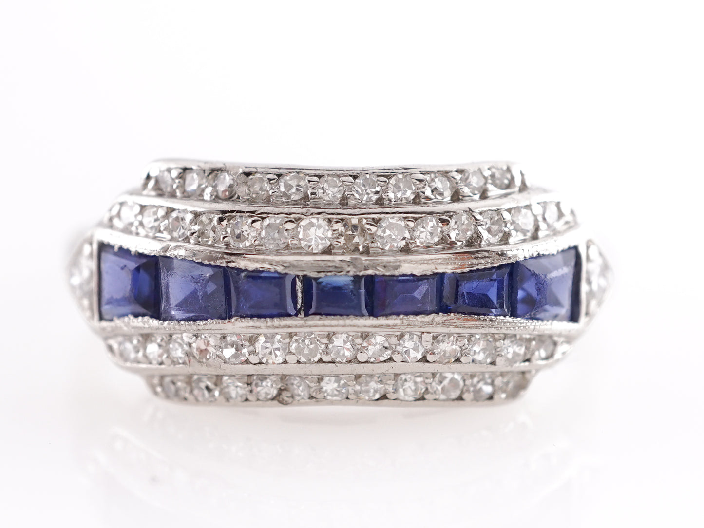 This antique Art Deco engagement ring features .65 cttw of natural blue sapphires and .50 carats of natural diamonds in platinum. The dark blue sapphires are set between four rows of channel set diamonds. Each gem has a soft brilliance and geometric structure that showcase the definitive style of Art Deco jewelry makers. Finished in polished platinum in a comfort wear band, this vintage engagement ring will surely stand out in the crowd!