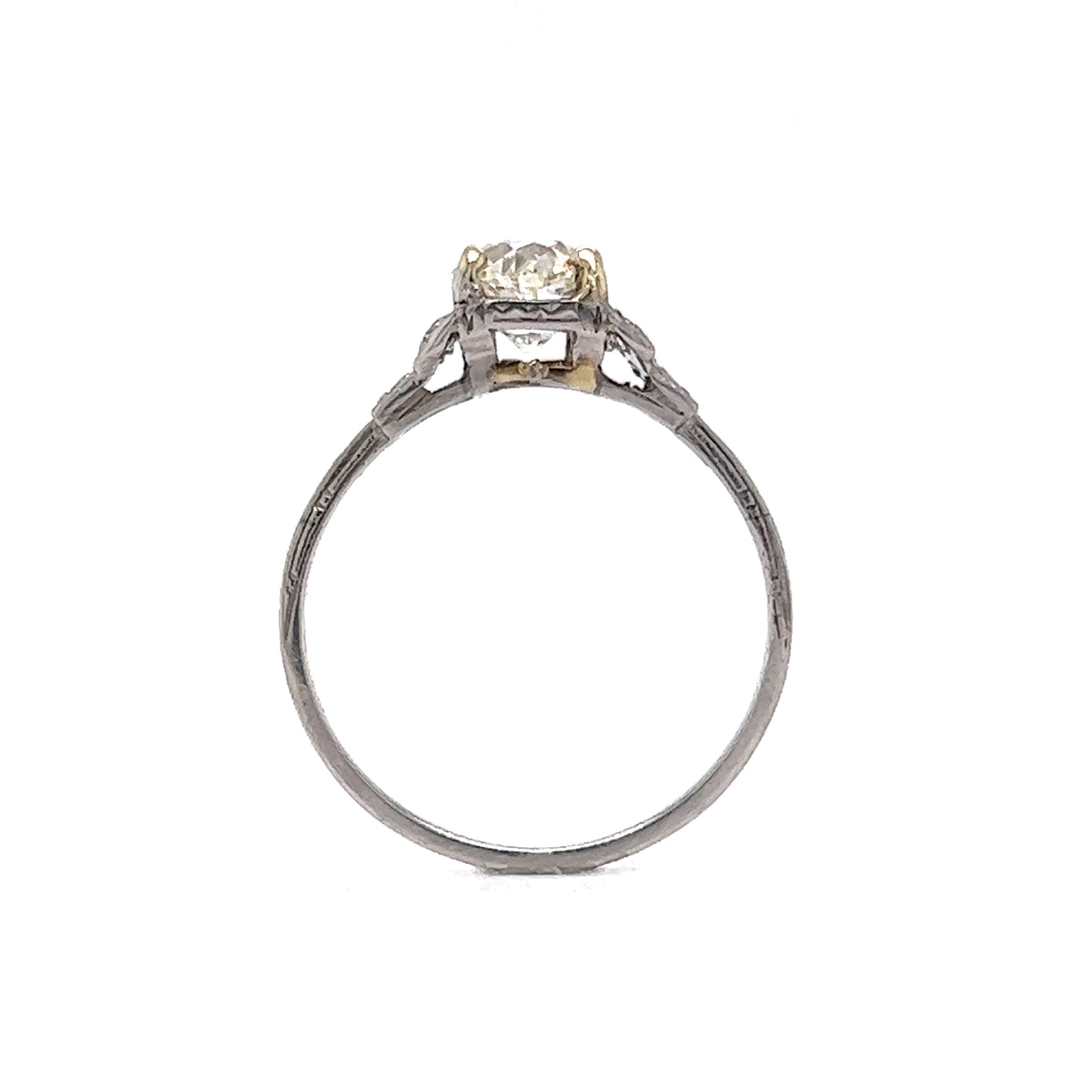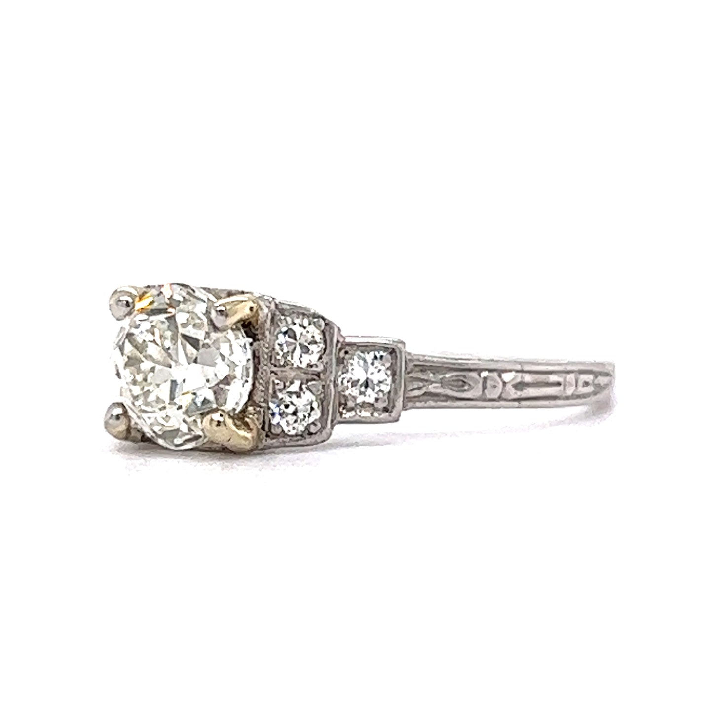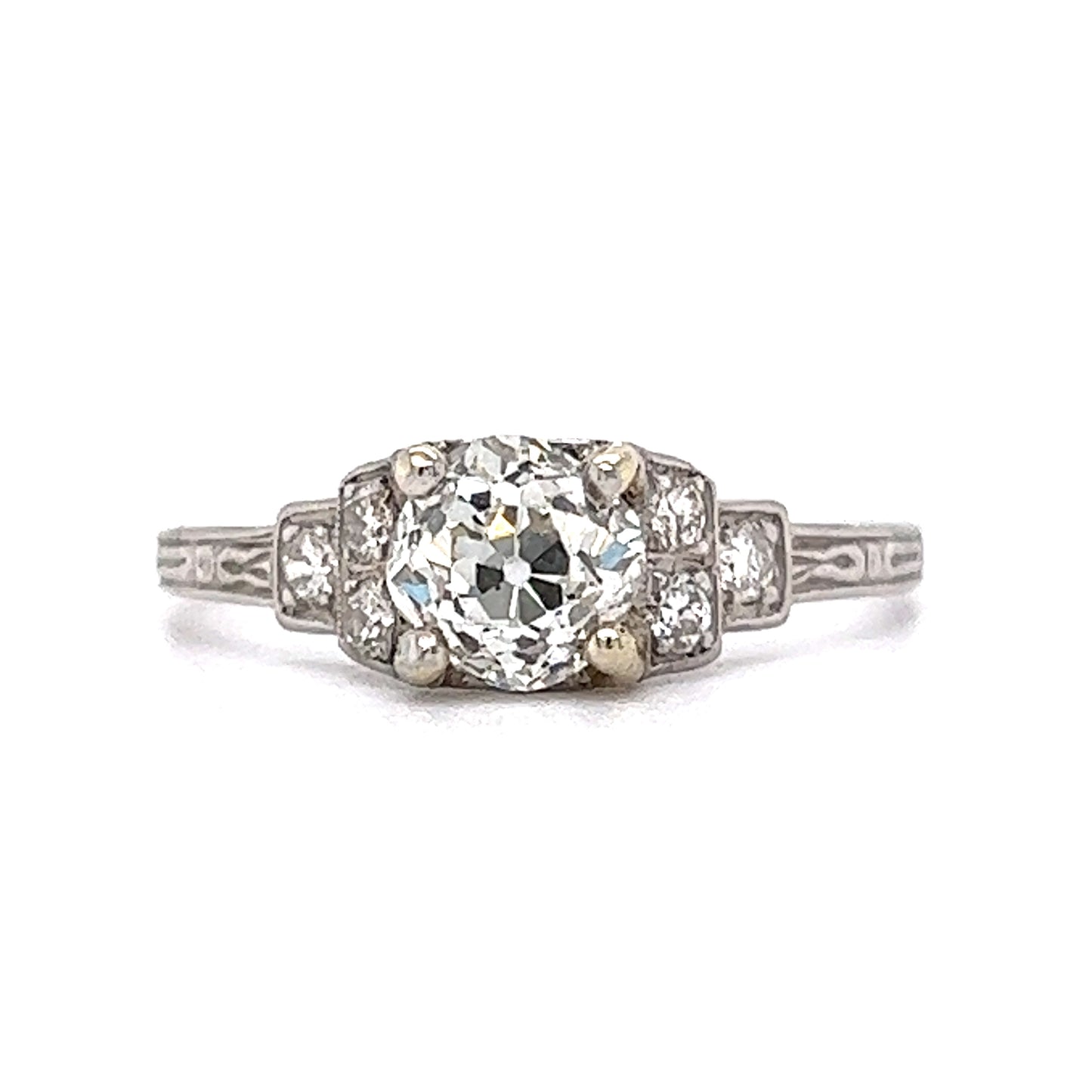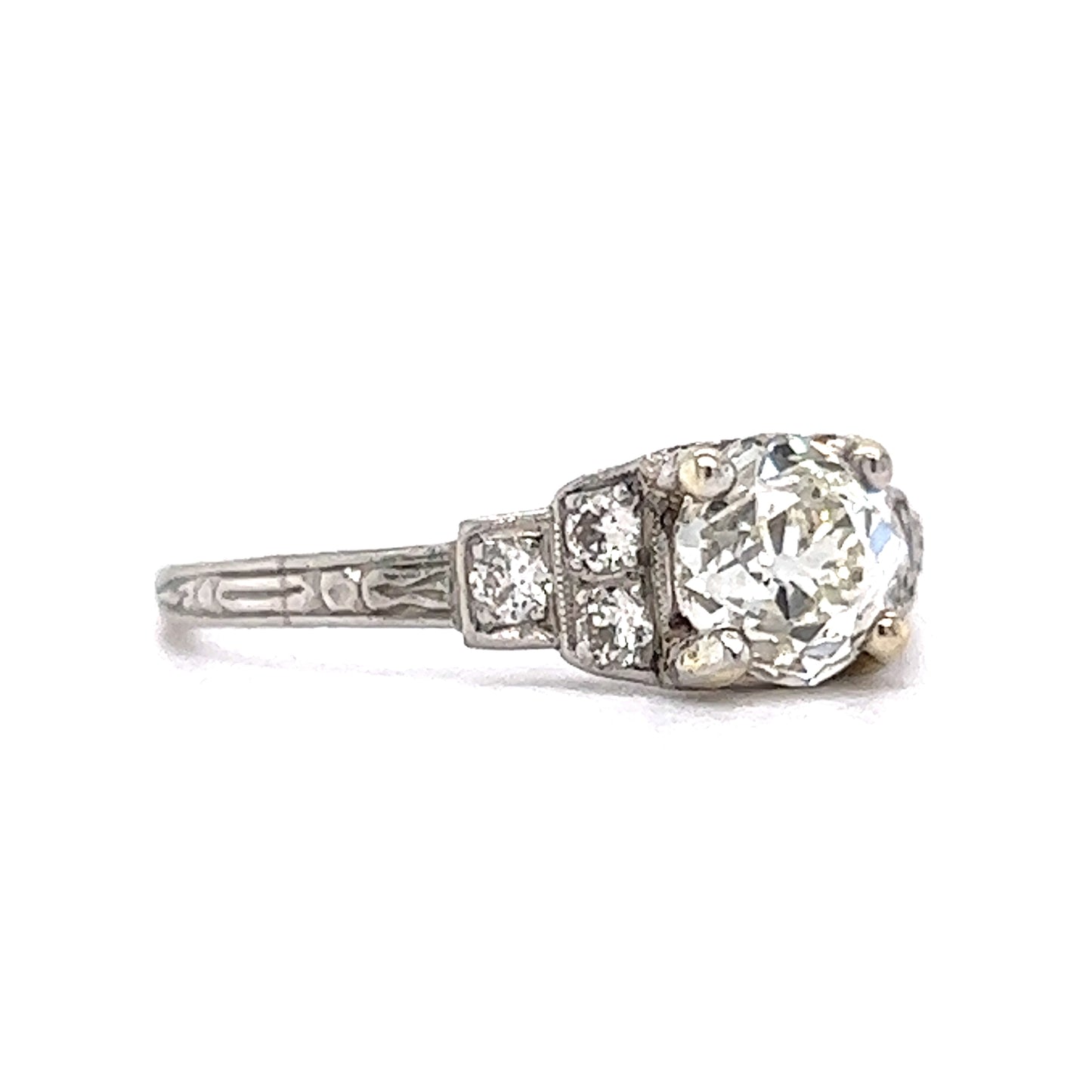 This Art Deco engagement ring features a .95 carat Old European cut diamond set in platinum. This remarkable ring has such a bright diamond look as the primary stone is surrounded by a gently tapered and stepped down series of accent stones. The center stone is also prominently set above the shank, which can be easily seen from the side profile. A wonderful ring that will be cherished for a lifetime.