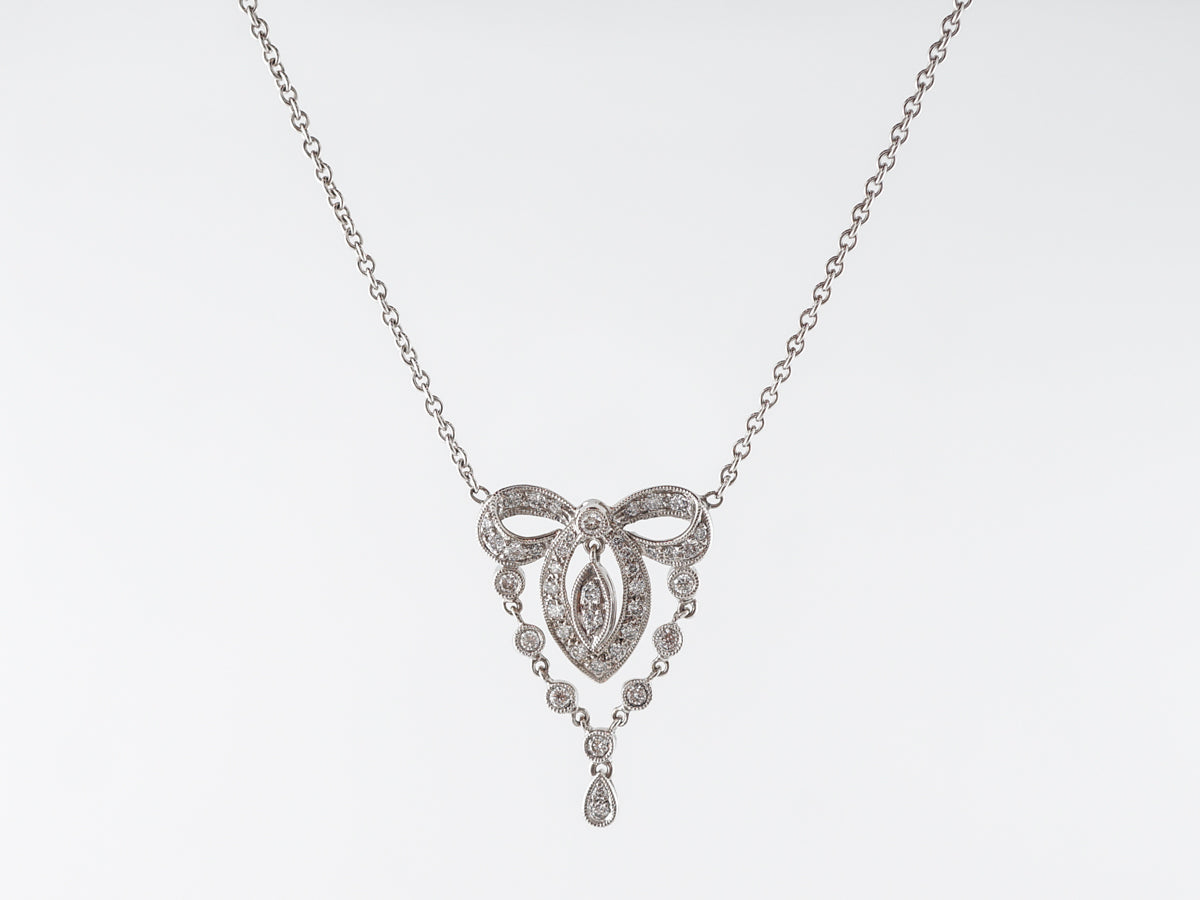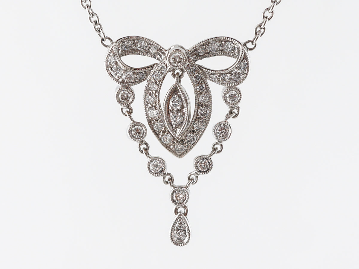 Art Deco Style Diamond Necklace in 18k White Gold. This darling modern diamond pendant necklace is finished in 18 karat white gold and features .74 carats of diamonds. The overall design of the pendant is pointed with a string of diamonds below a clever bow tie containing separate hanging diamonds inside that provide additional movement. The chain, which is also 18 karat white gold, is 25 inches in length.