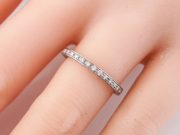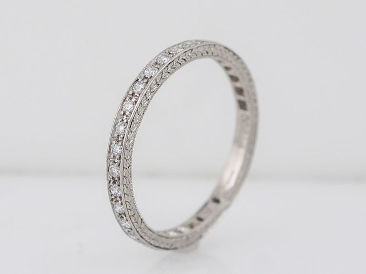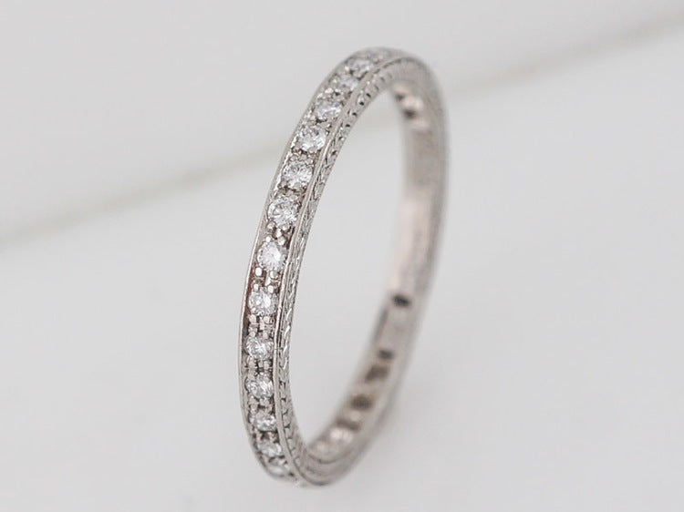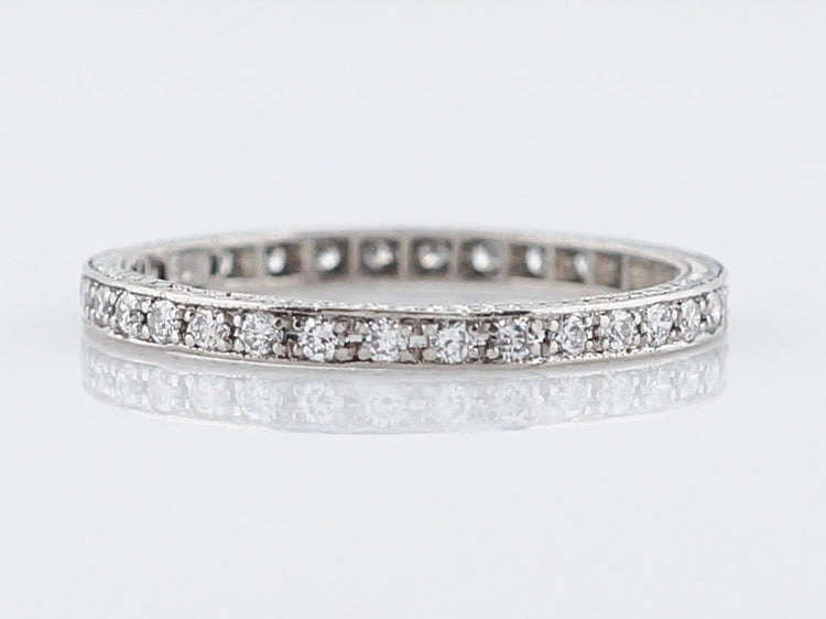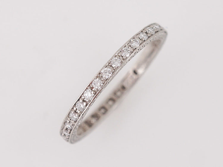 This modern eternity band is made in the Art Deco style with its characteristic milgrain details. The ring is made of platinum and has thirty two (32) round brilliant diamonds weighing .32 ct total.