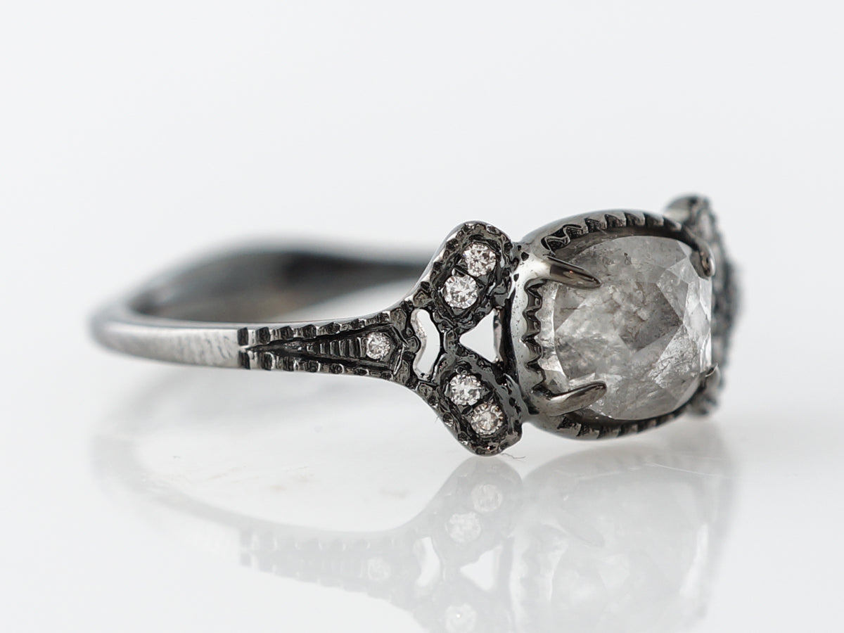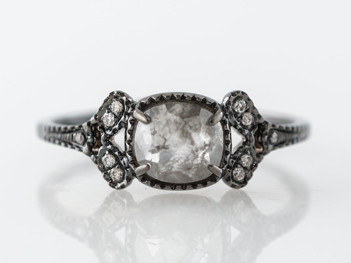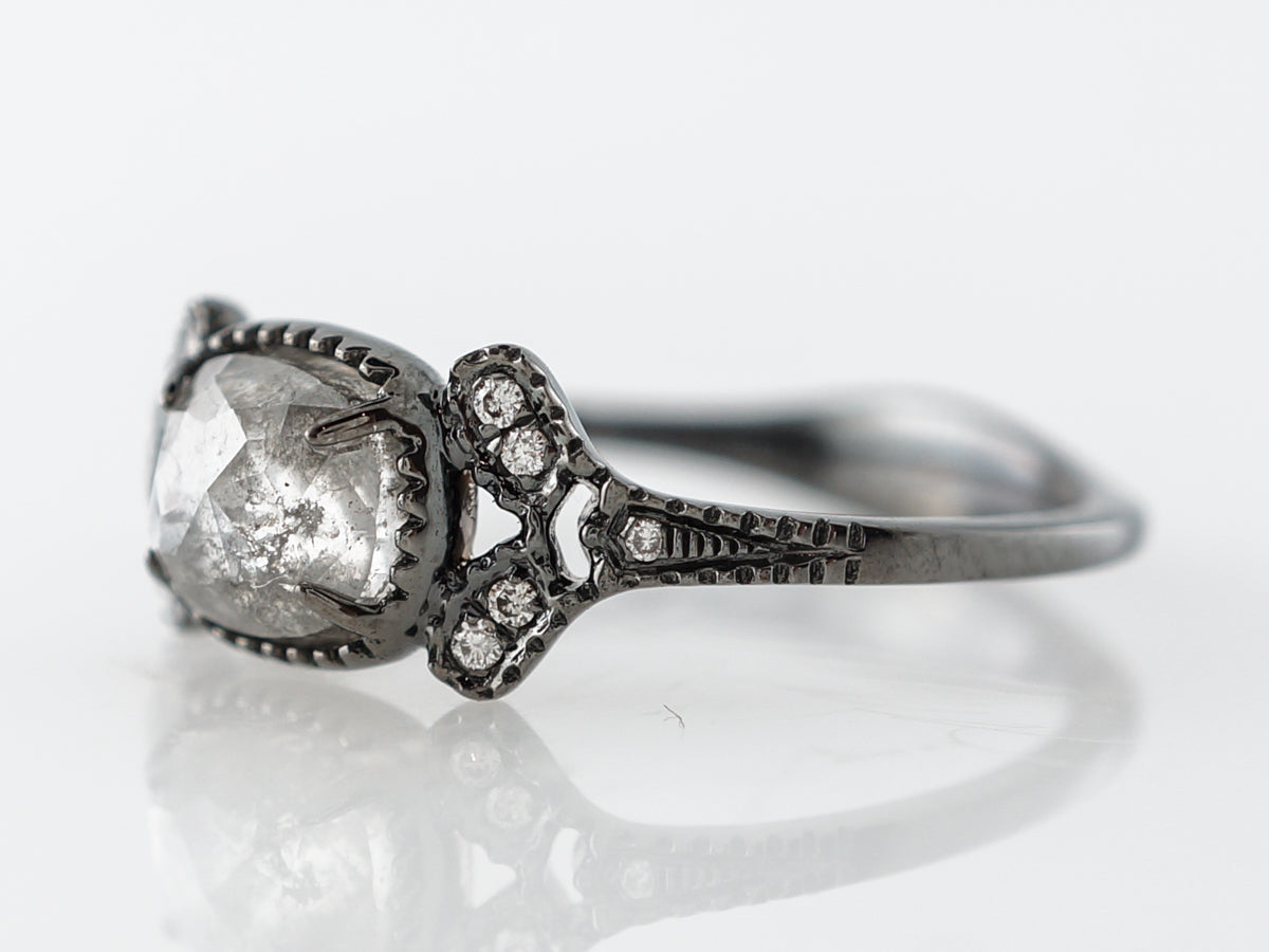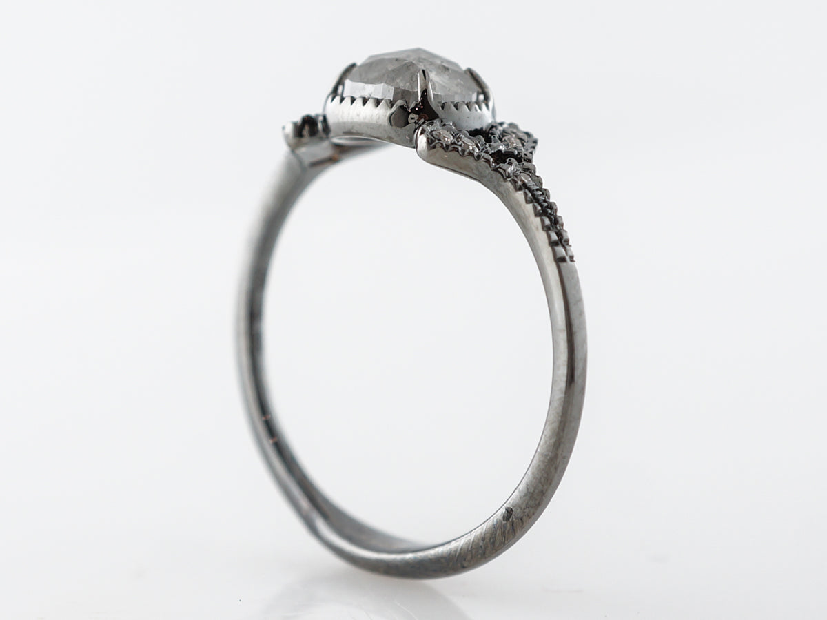Grey Diamond Engagement Ring in 18k White Gold. This striking engagement ring features a .86 carat cloudy gray rose cut diamond that is set in 18 karat white gold with black rhodium plating. The black rhodium couples very nicely with the swirling gray diamond, creating a dark and dramatic look. The split shoulders create some open space in the design and the large milgrain detail creates a nice space for the accent stones.