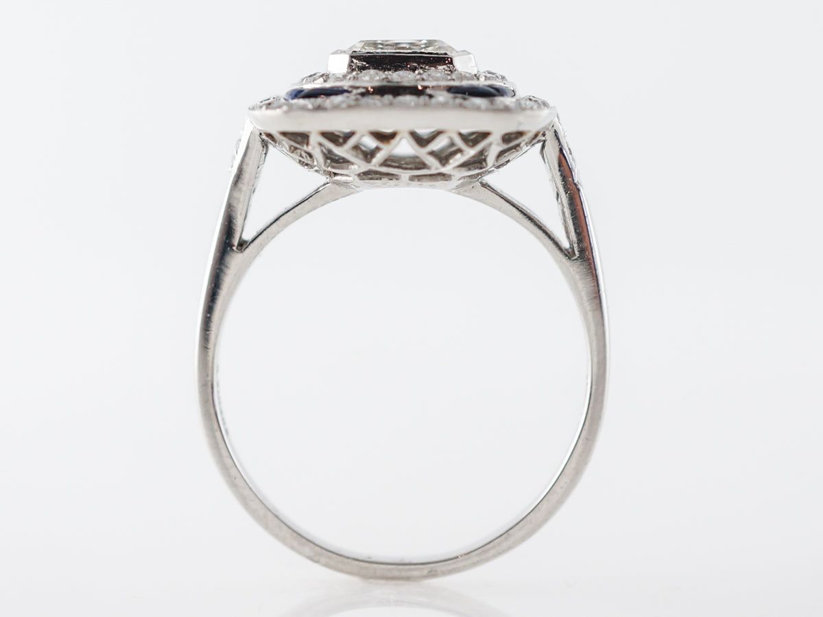 Asscher Cut Diamond Engagement Ring w/ Sapphire Accents. This Asscher cut diamond engagement ring features a 1.01 carat primary stone and is a stunning example of modern craftsmanship. The amount of fine detail in this ring is exquisite. Outside of the bezel set Asscher cut sits an inner halo of bead set round diamonds with very fine milgrain edging. Further outside filling the corner space between the inner halo and the outer ring of accent diamonds are eight (8) perfectly fit and custom sized cabochon cut sapphires that add such a wonderful and unique accent while creating space for the eye to separate the two diamond halos. Finally, the open work on the shoulders of this ring is just exceptional, set with a round diamond inside a delicate rose cutout with milgrain edges.