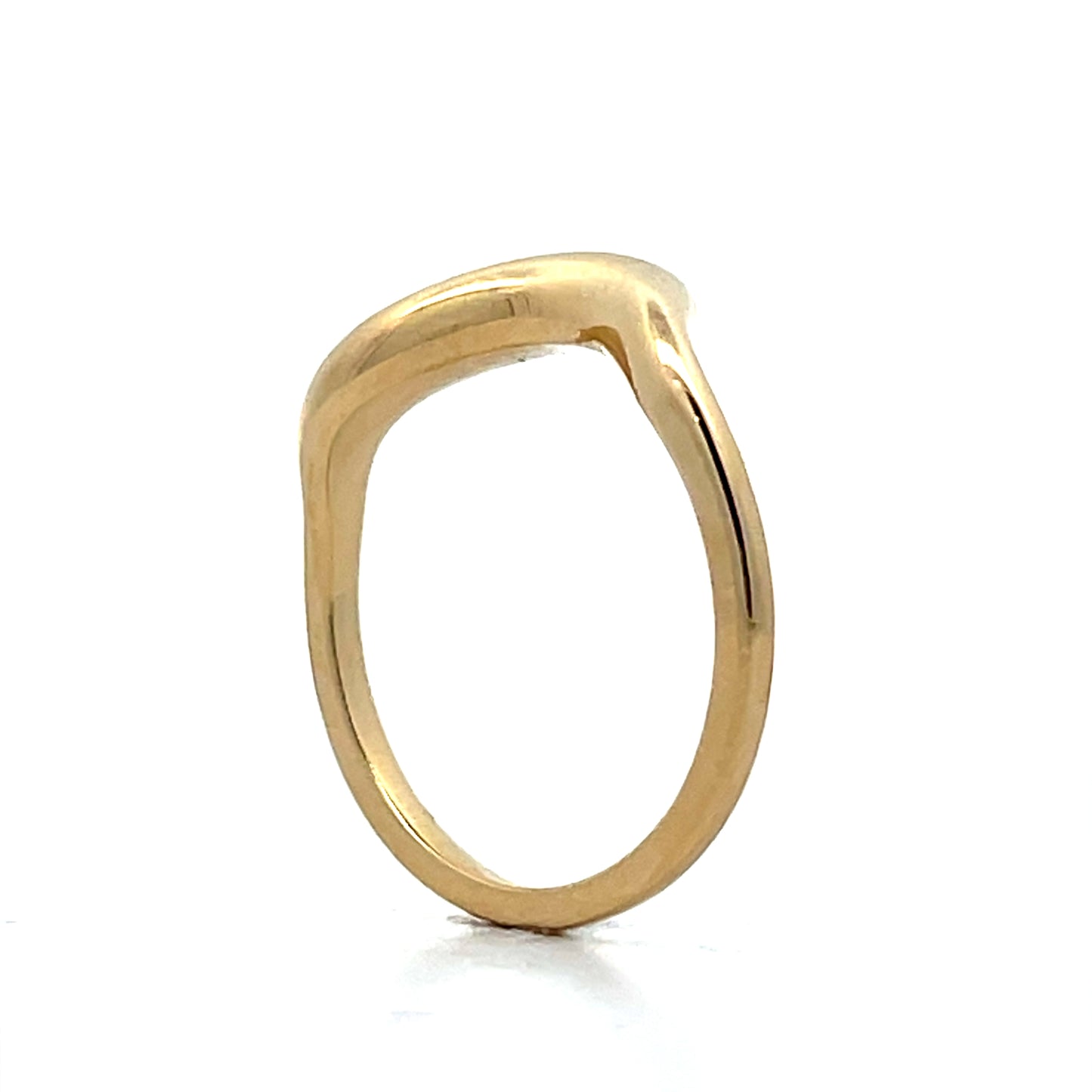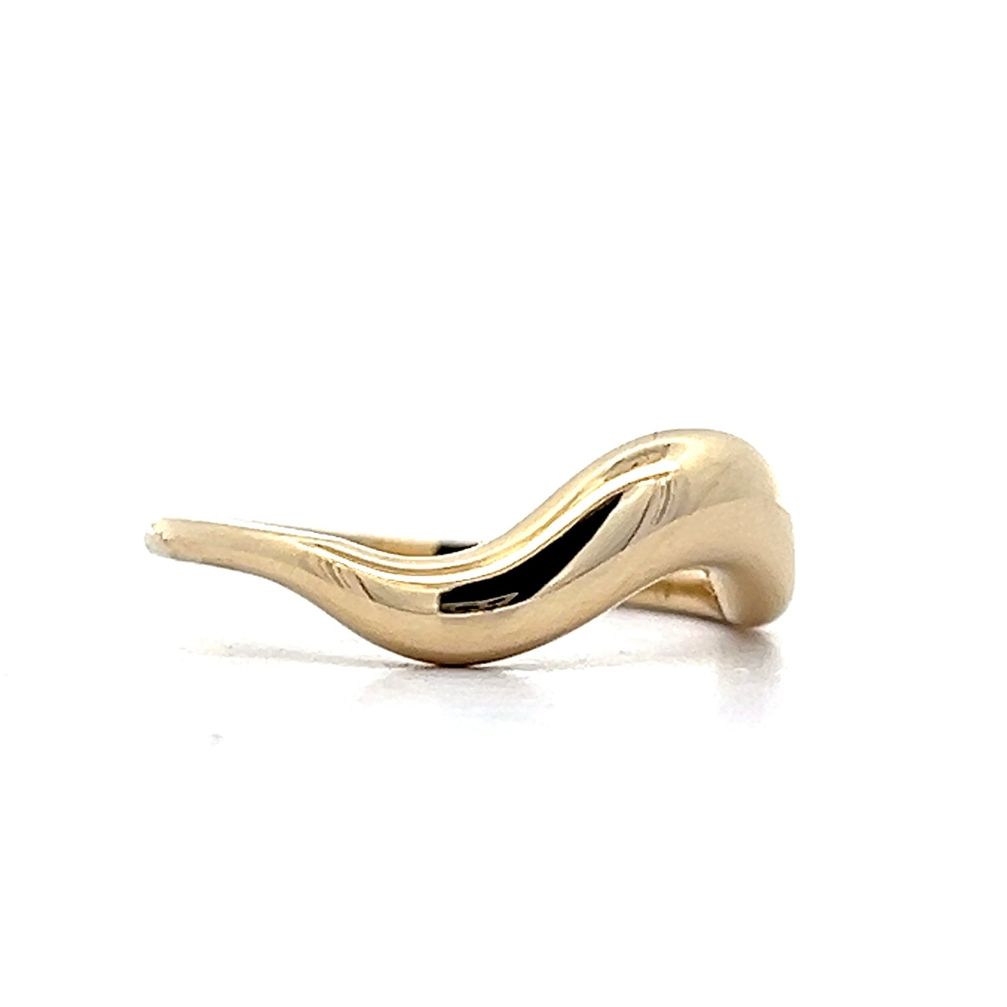This wedding band is made from 14 karat yellow gold with a unique contoured design that creates a bubble-like appearance. The asymmetrical curves give the ring a modern look that stands out from more traditional flat bands. The flowing, curved shape makes the ring feel light and playful while still being a substantial piece of gold jewelry.