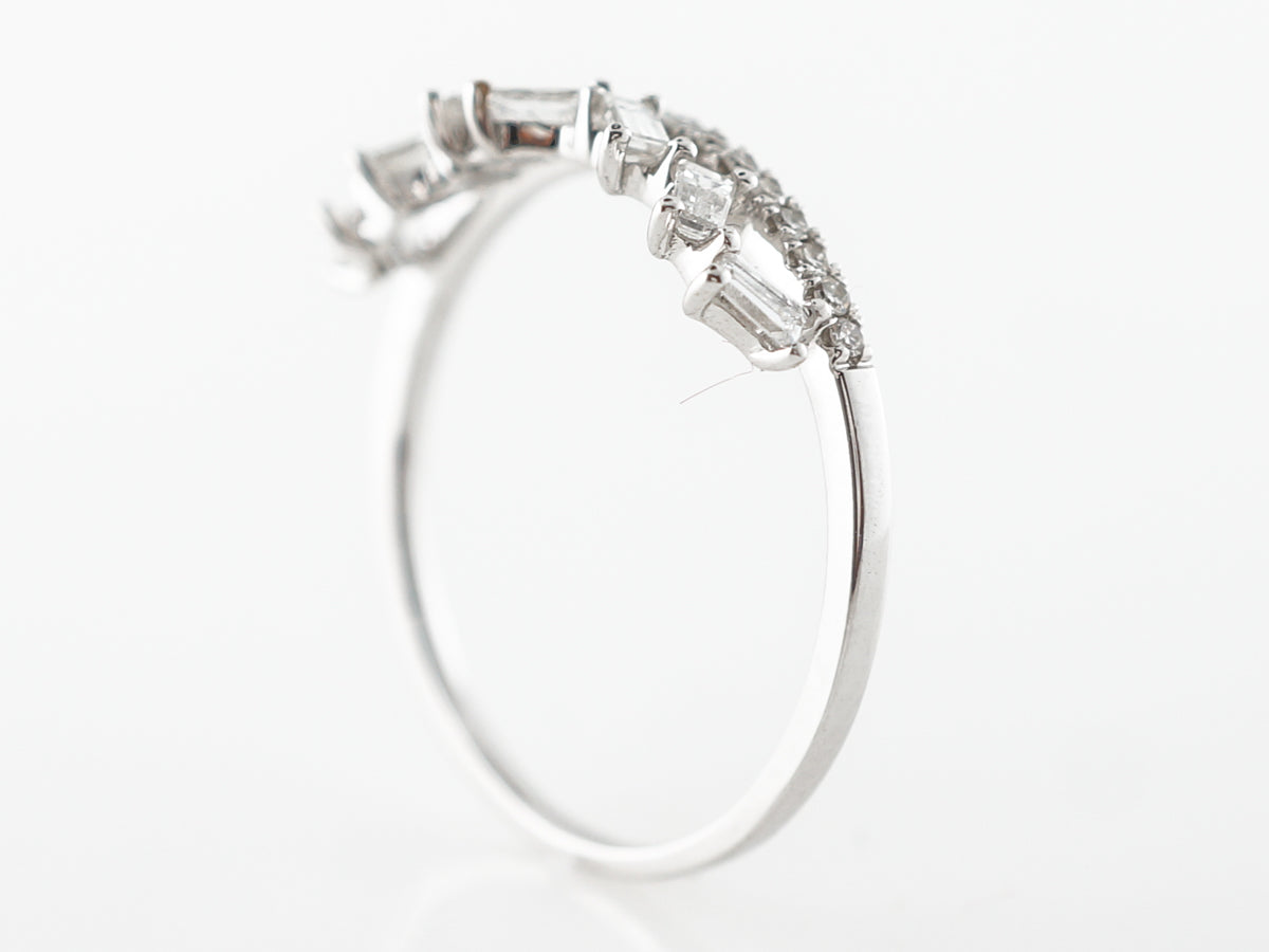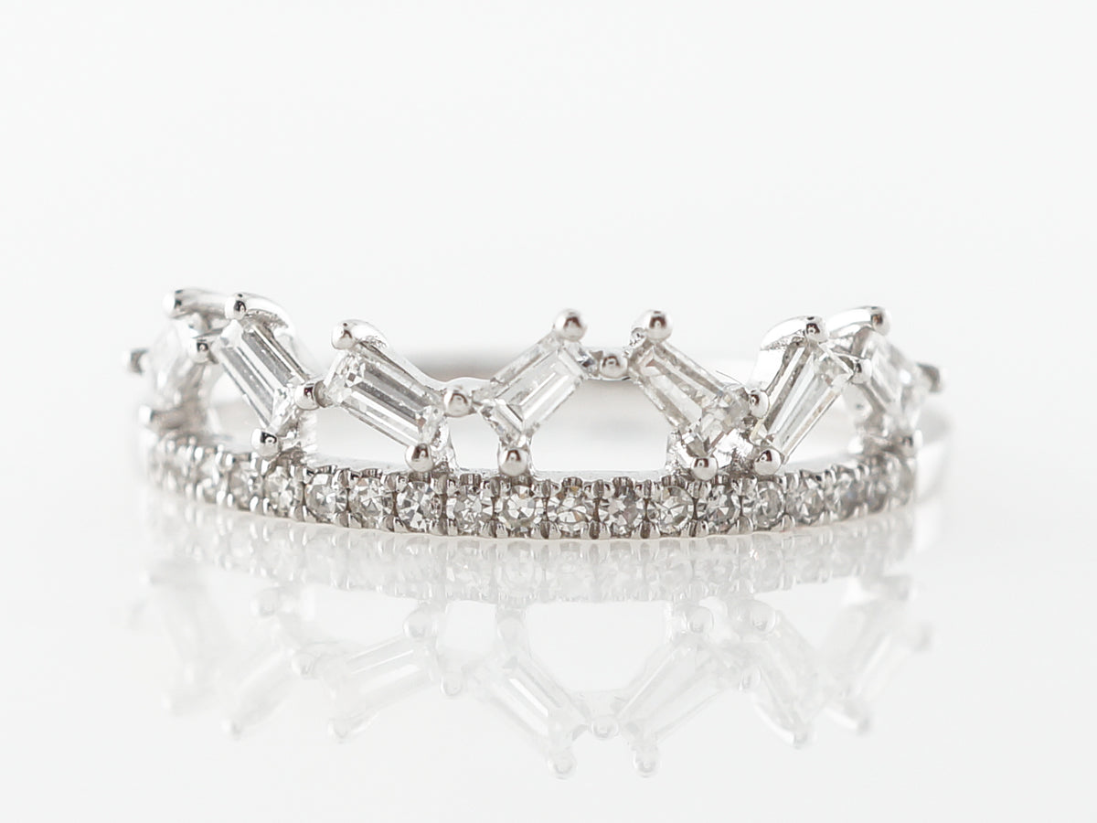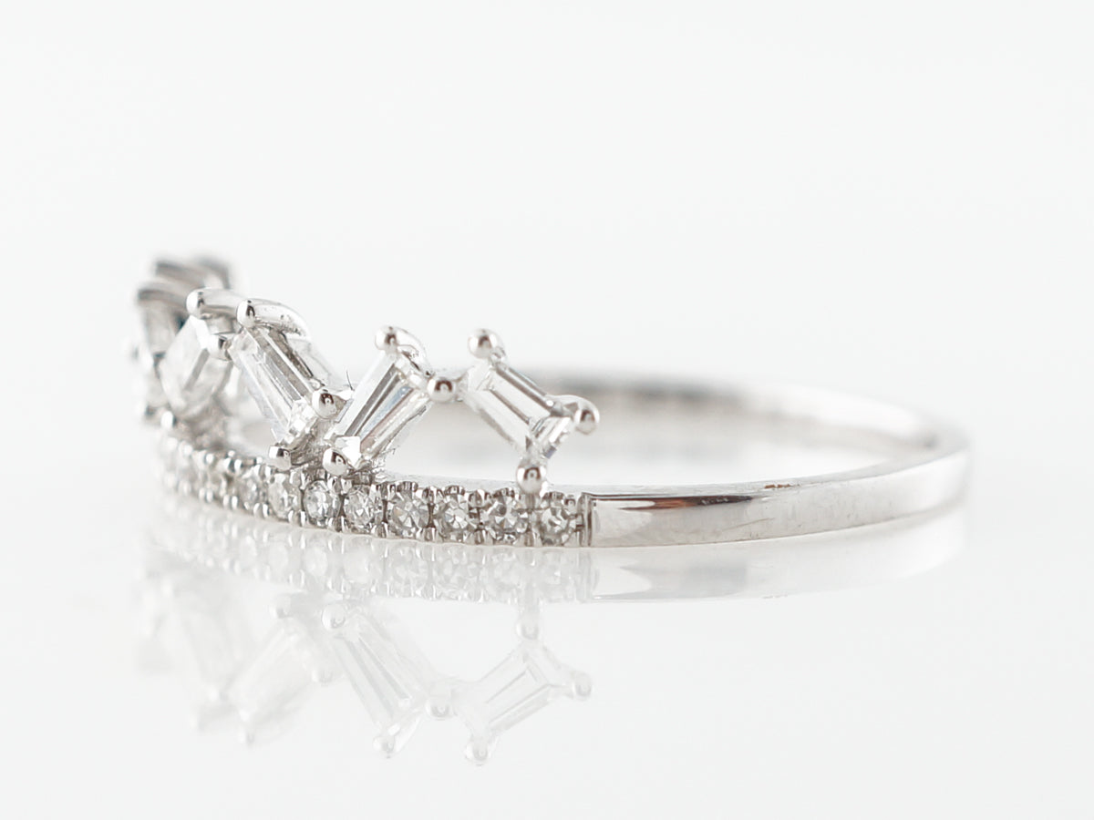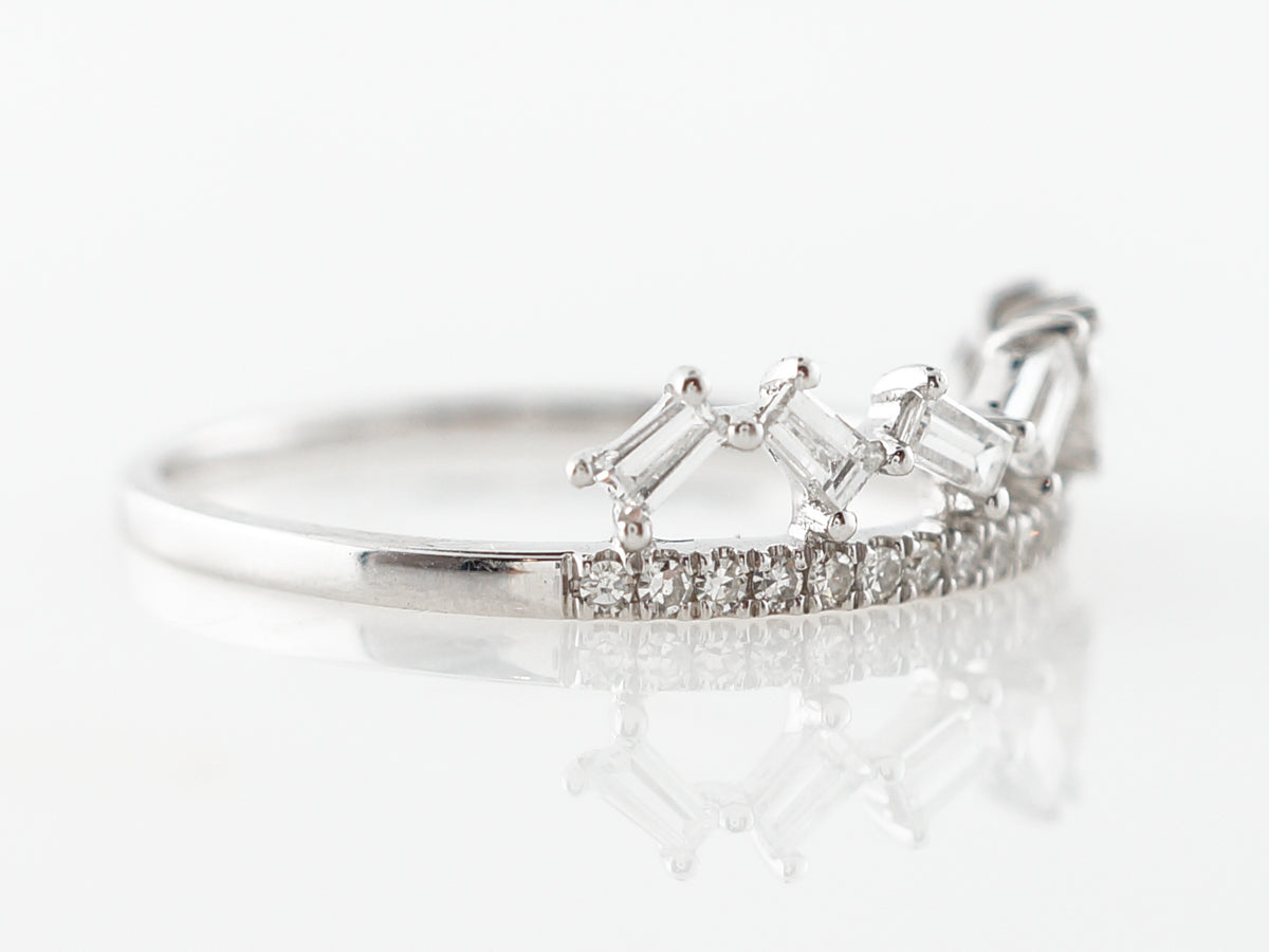 Baguette Cut Diamond Band in 18k White Gold. This unique modern diamond wedding band features .35 carats of diamonds and is set in 18 karat white gold. The unique design feature is the jagged setting of the baguettes above the half eternity band. The shape is reminiscent of a tiara and would be wonderful to wear on its own.