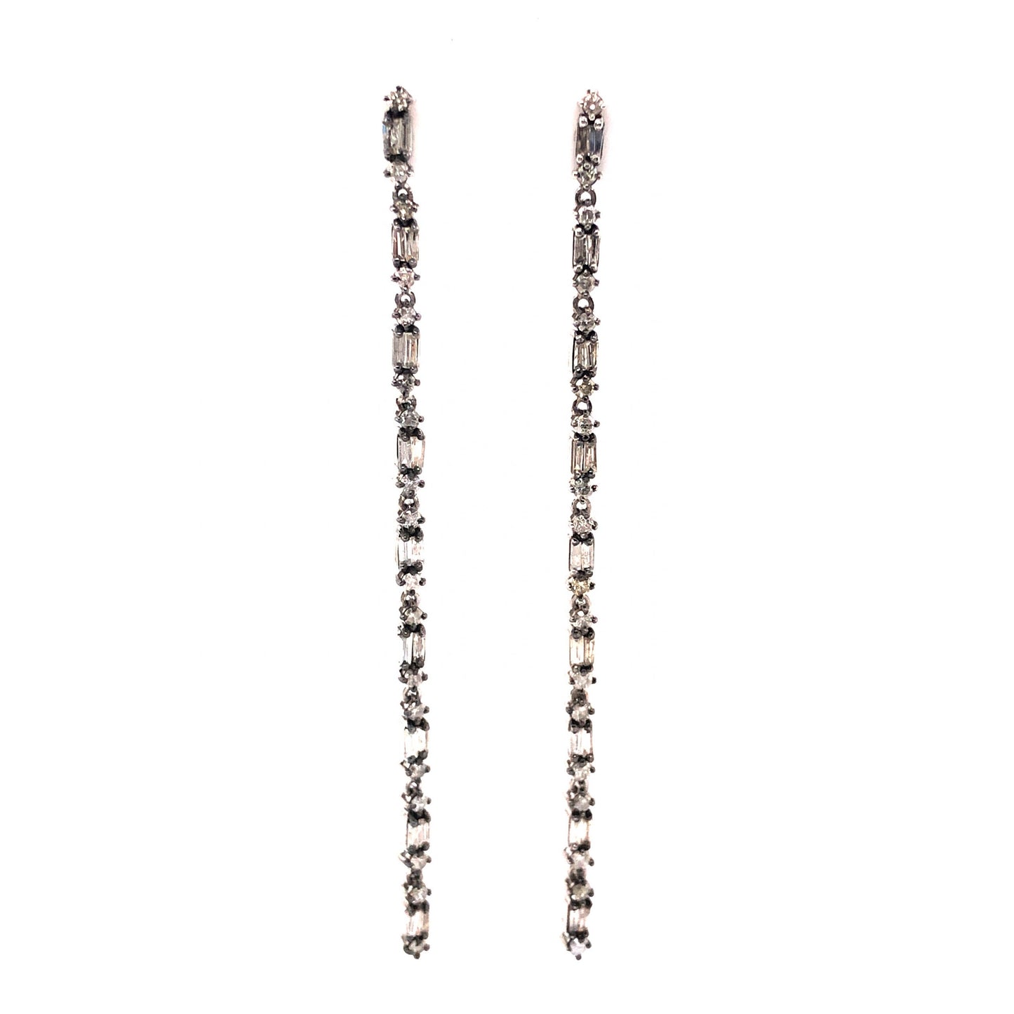 These luxurious drop earrings feature 2.52 carats of diamonds in sterling silver. Thirty-six (36) .05 carat baguette and thirty-six (36) .02 carat round cut diamonds dangle from the 14K yellow gold stud backings. The diamonds are set in sterling silver, bringing a shimmering and cool-toned look to the dangles. Set in an alternating diamond fashion, these long drop earrings are the perfect set for a special night out.