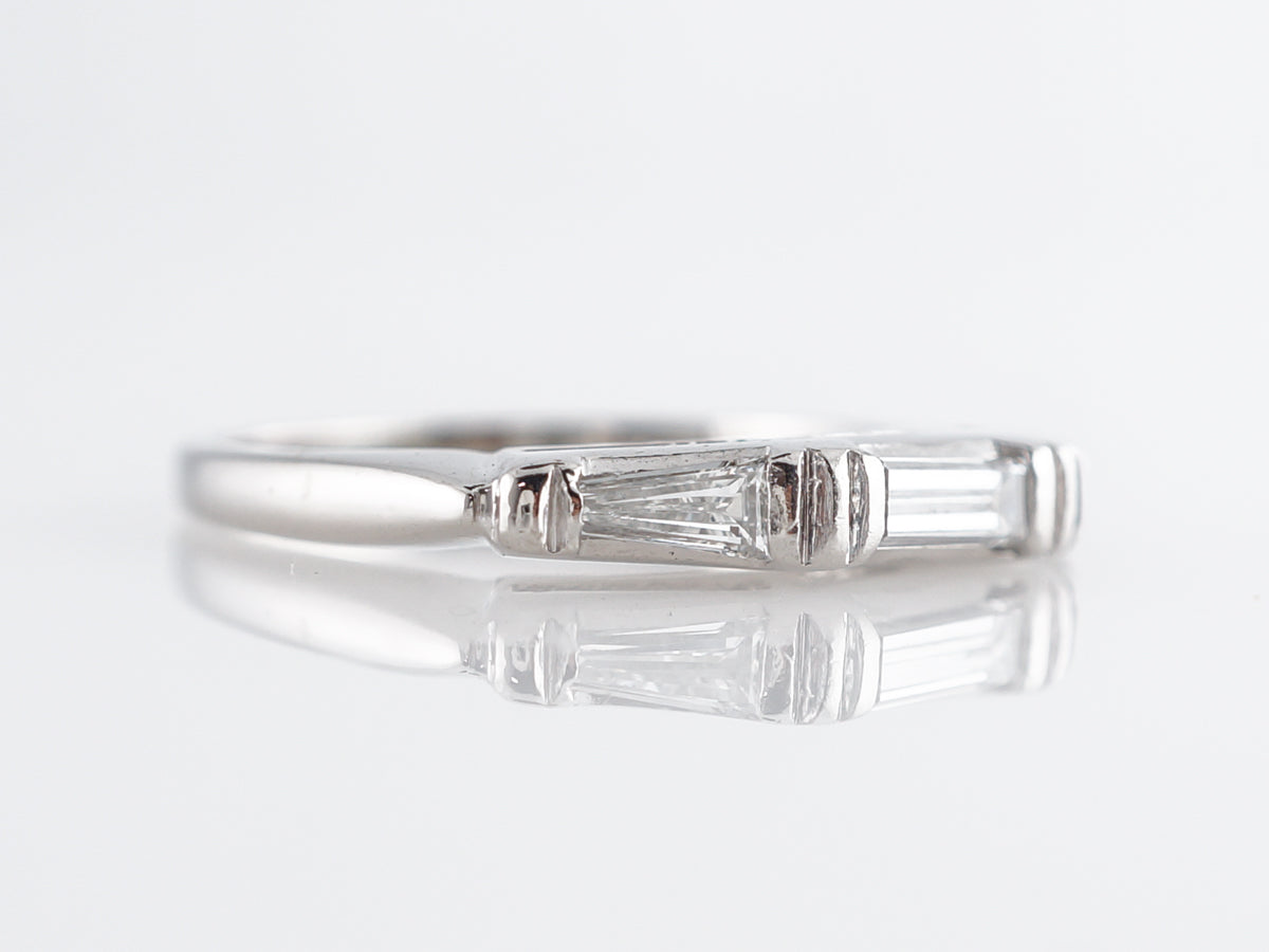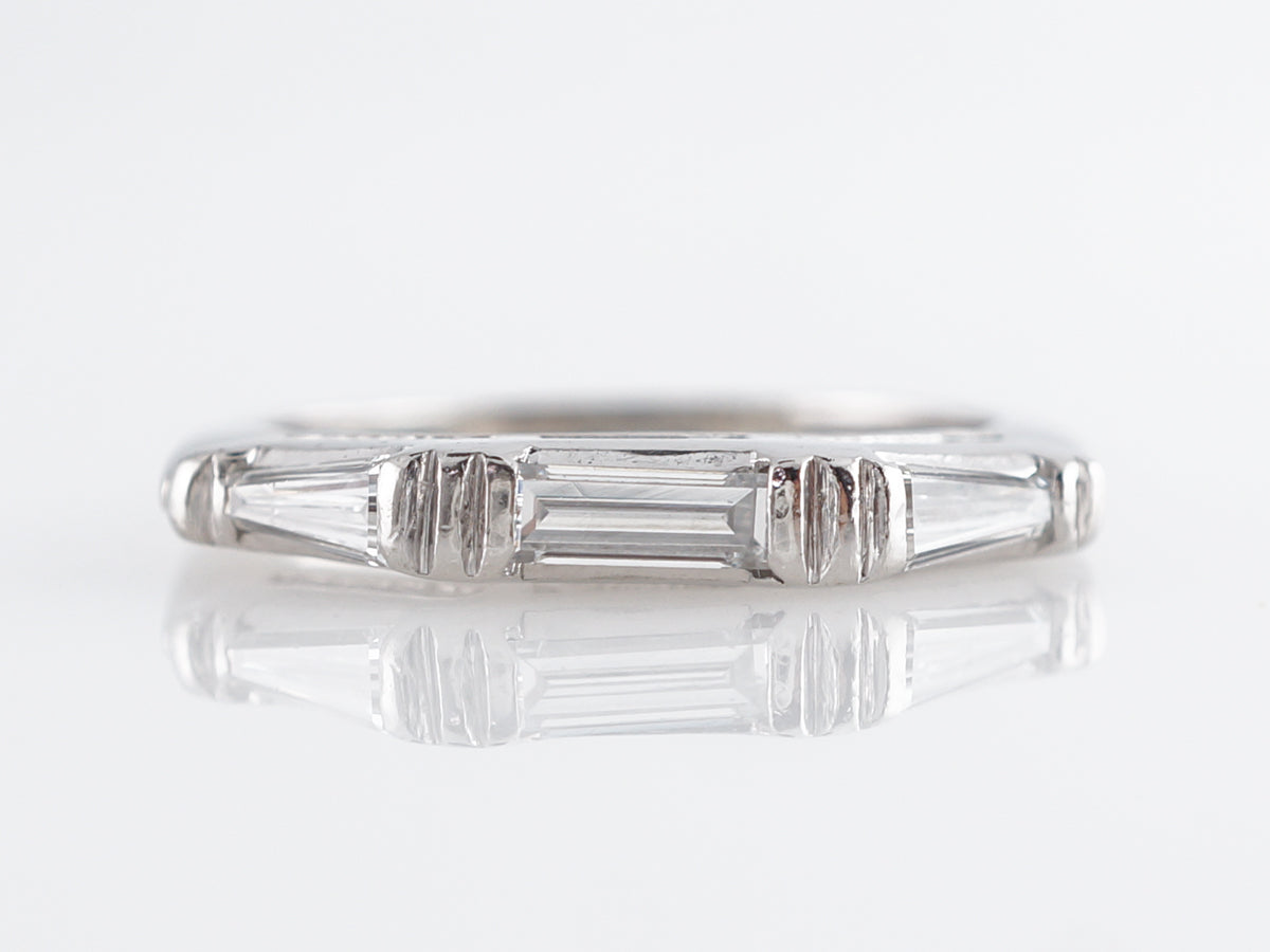 Baguette Cut Diamond Wedding Band Mid Century in Platinum. This platinum Mid-Century baguette diamond band features a straight baguette in the center flanked by a tapered baguette on each side. The baguettes are set with platinum bars across the bridge of the finger. The slightly raise platinum gallery allows the diamonds to sit at bit higher which compliments an engagement ring with a raised height. The total diamond weight is .46 carats. The platinum band is finished in a high polish.