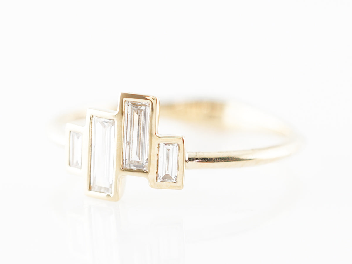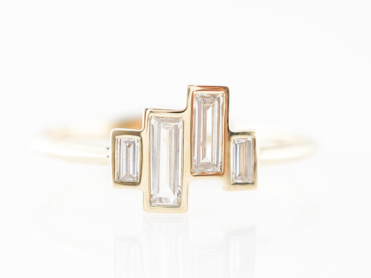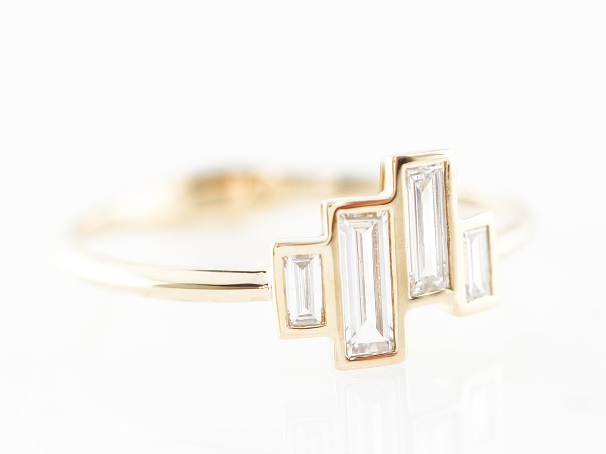 Baguette Diamond Right Hand Ring 18k Yellow Gold. This fine right hand ring features .39 carats of baguette cut diamonds set across an 18 karat yellow gold band. The baguettes are each bezel set in an asymmetrical layout, allowing for a gorgeous interplay with the color of the golden border. This would make a wonderful gift for a loved one to wear on their right hand!