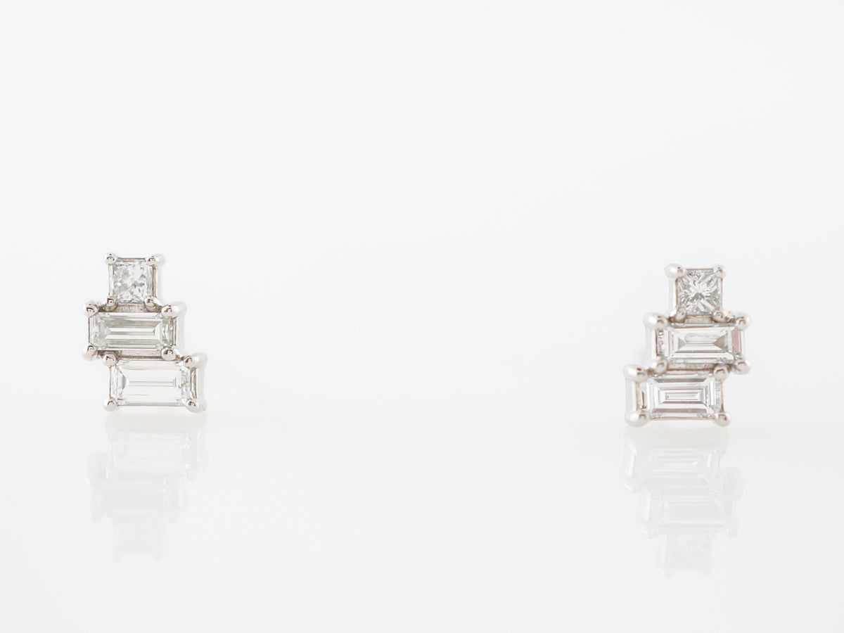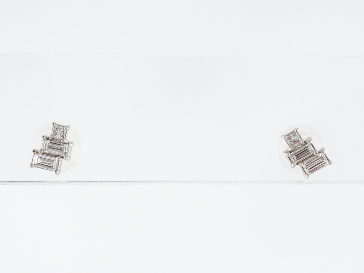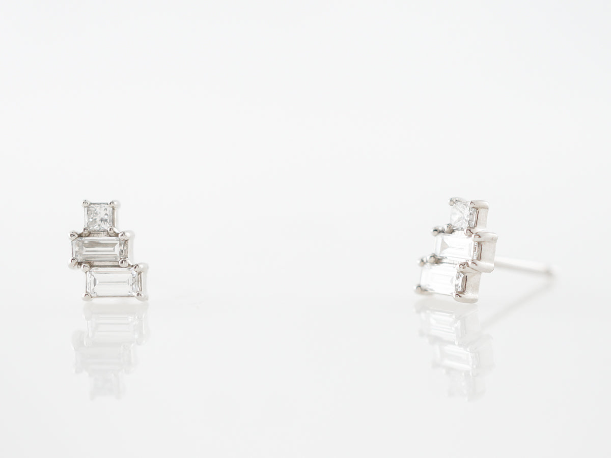 Baguette Diamond Stud Earrings in 14k White Gold. These beautiful earrings feature a baguette cut diamonds with a total weight of .50 carats. The diamonds are bezel set in an off center fashion, giving them a unique and fun look.