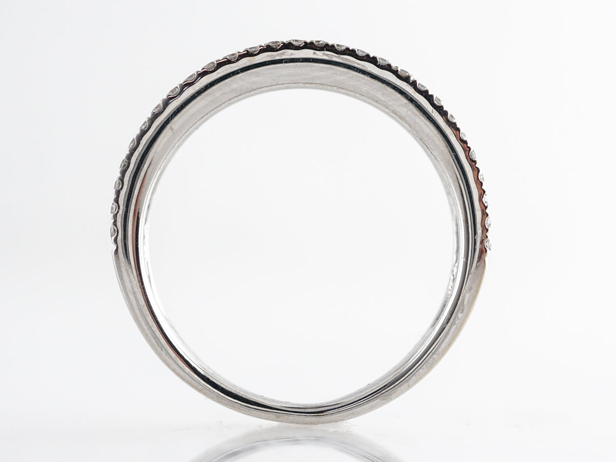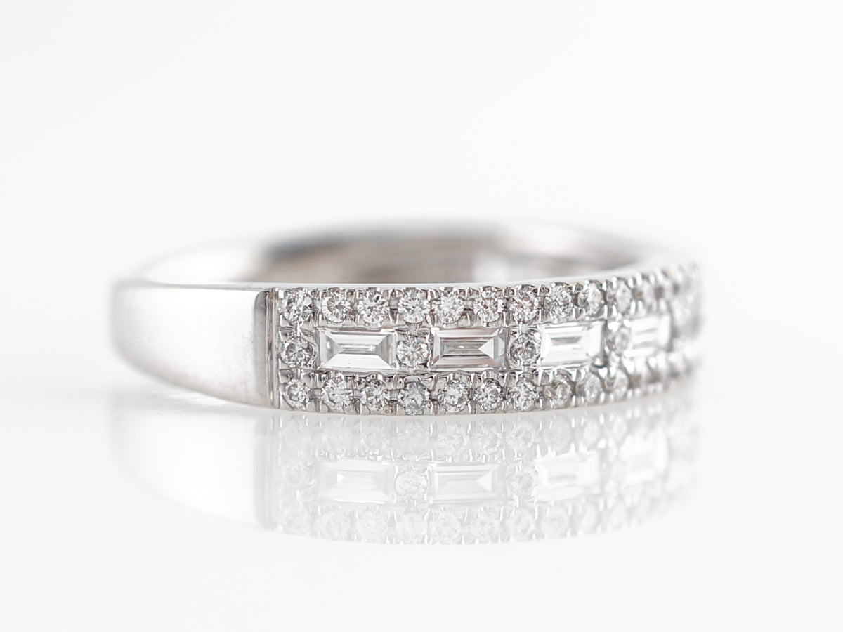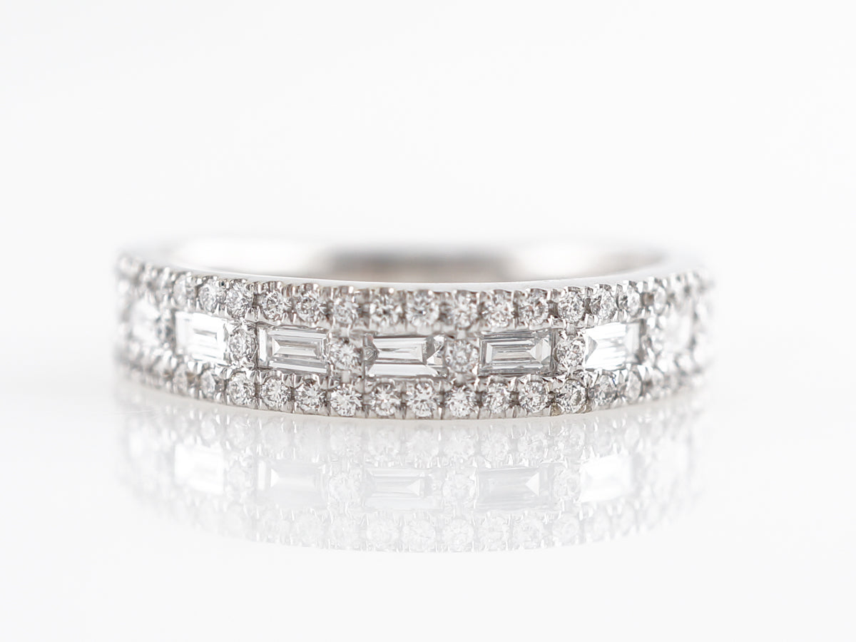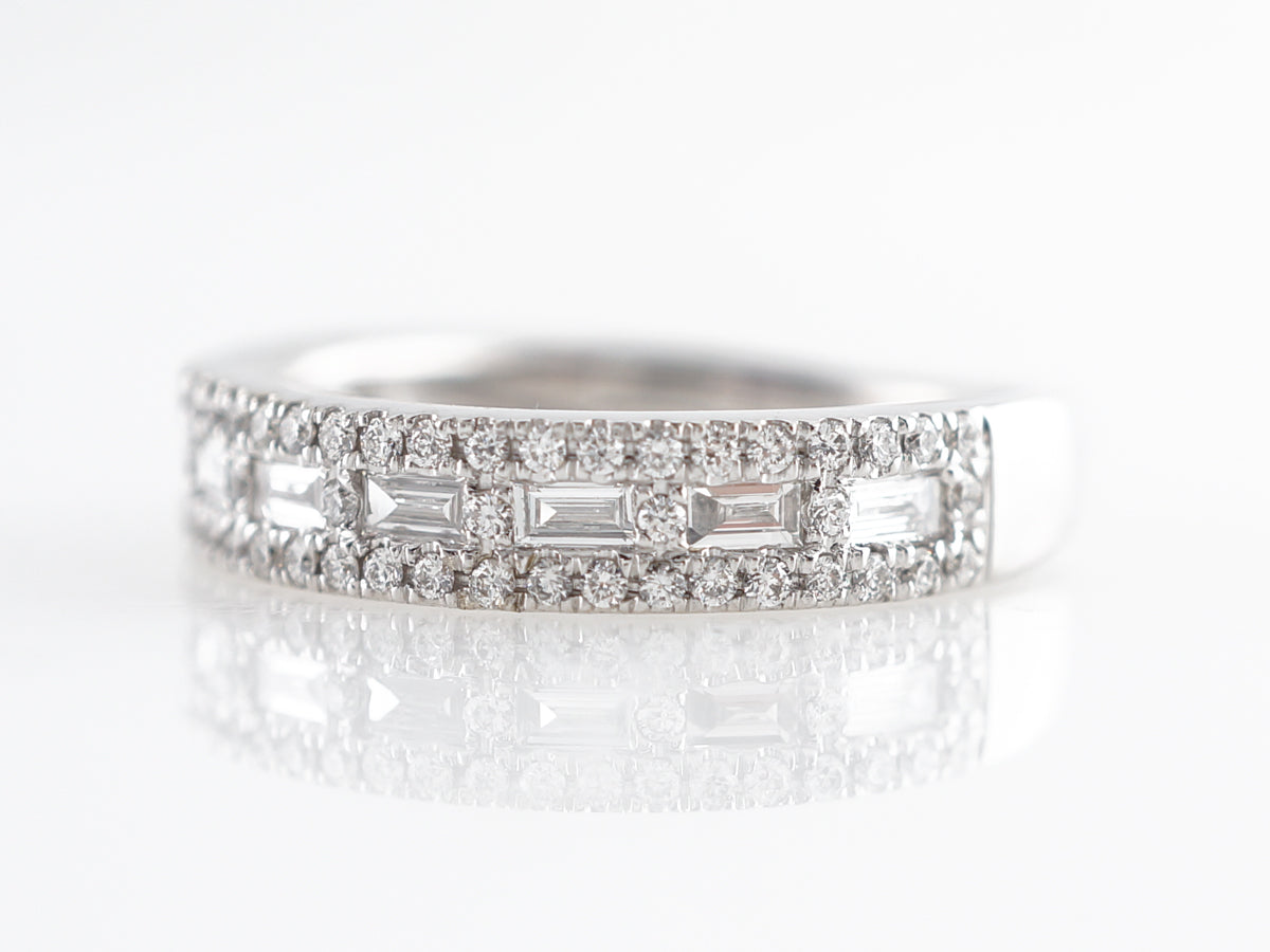 Baguette Round Cut Diamond Wedding Band in 18K. This shining wedding band features .51 carats of baguette and round brilliant cut diamonds set in 18 karat white gold. Another band that could be perfect on the right hand or paired with an engagement ring to dramatically increase the sparkle. The baguettes run neatly down the center of the band with round diamonds bordering them for a dynamic look.