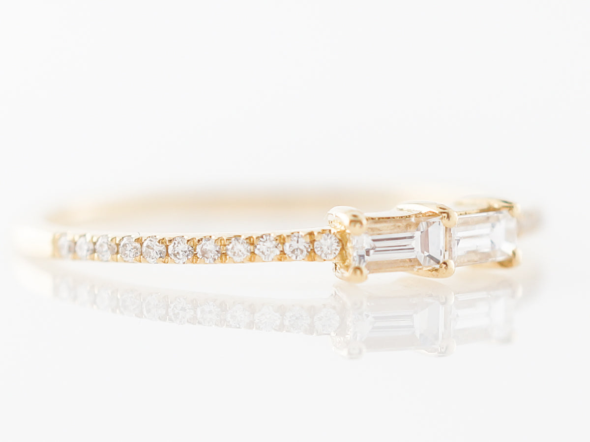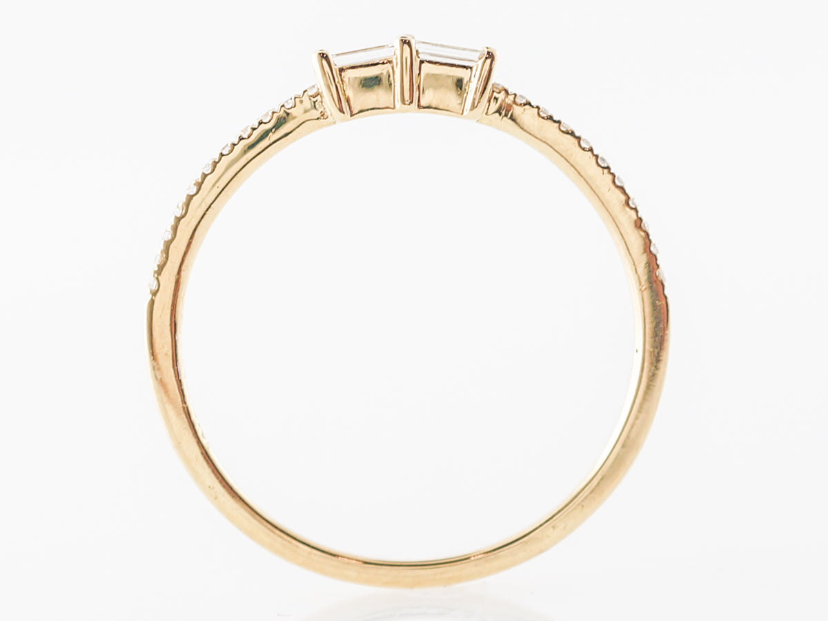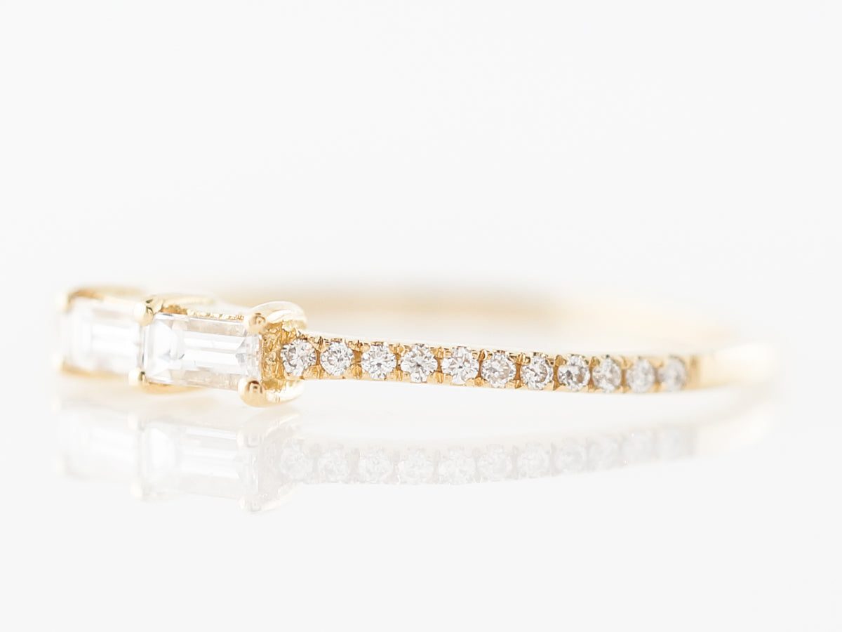 Baguette Round Cut Diamond Wedding Band in Yellow Gold. This modern ring features baguette and round cut diamonds in a unique way. The two baguette cut diamonds are set on the top of the band next directly next to each other and are accented by round cut diamonds. The total diamond weight .24 carats and is finished in yellow gold.