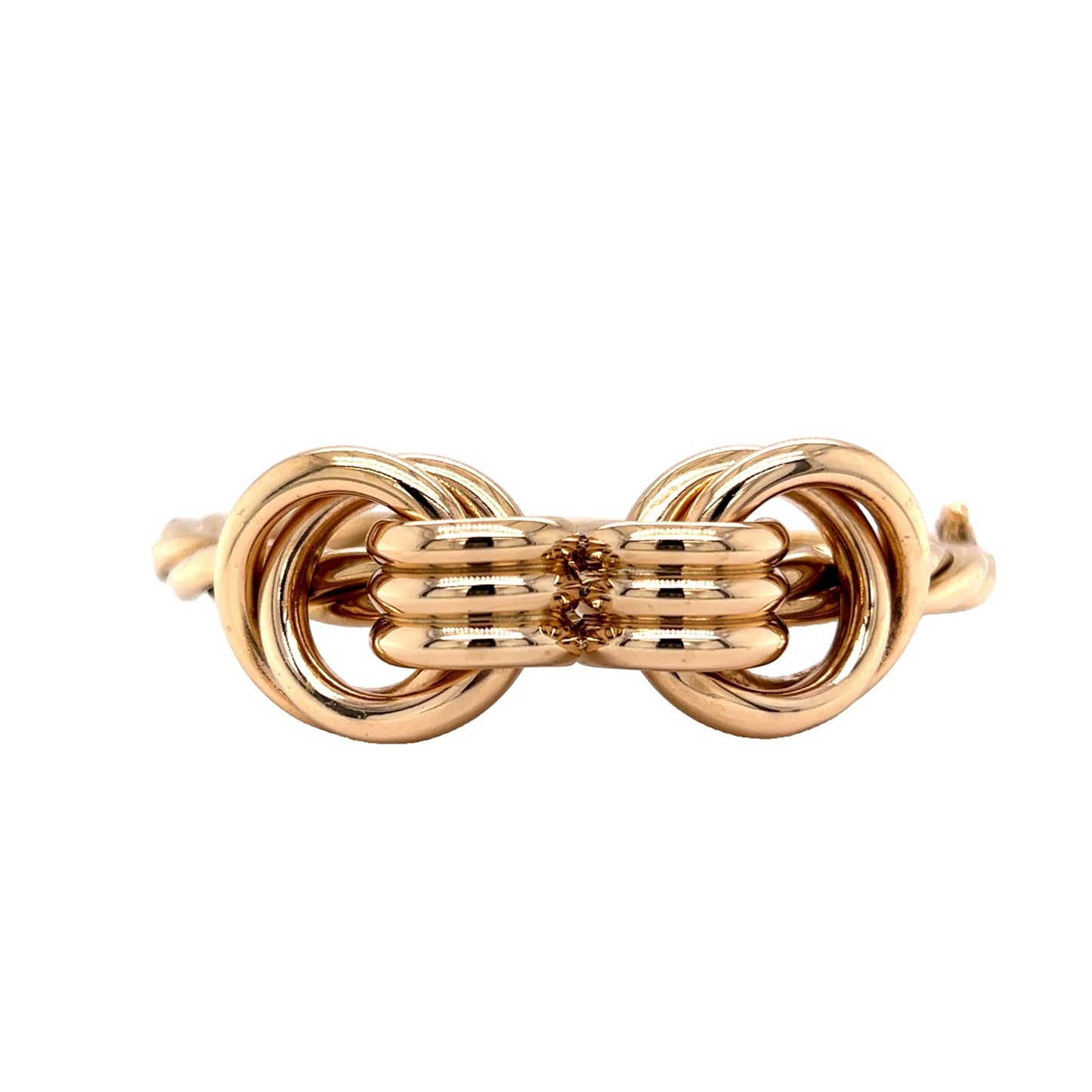 This one of a kind Stephanie Lake Design 14 karat yellow gold bangle bracelet is a classic piece of jewelry. The twisted gold bangle is enhance with two large free form 14 karat yellow gold knots as the center piece. The bangle bracelet glimmers with a high polish creating luster and shine. Fits up to a 7.0 wrist.