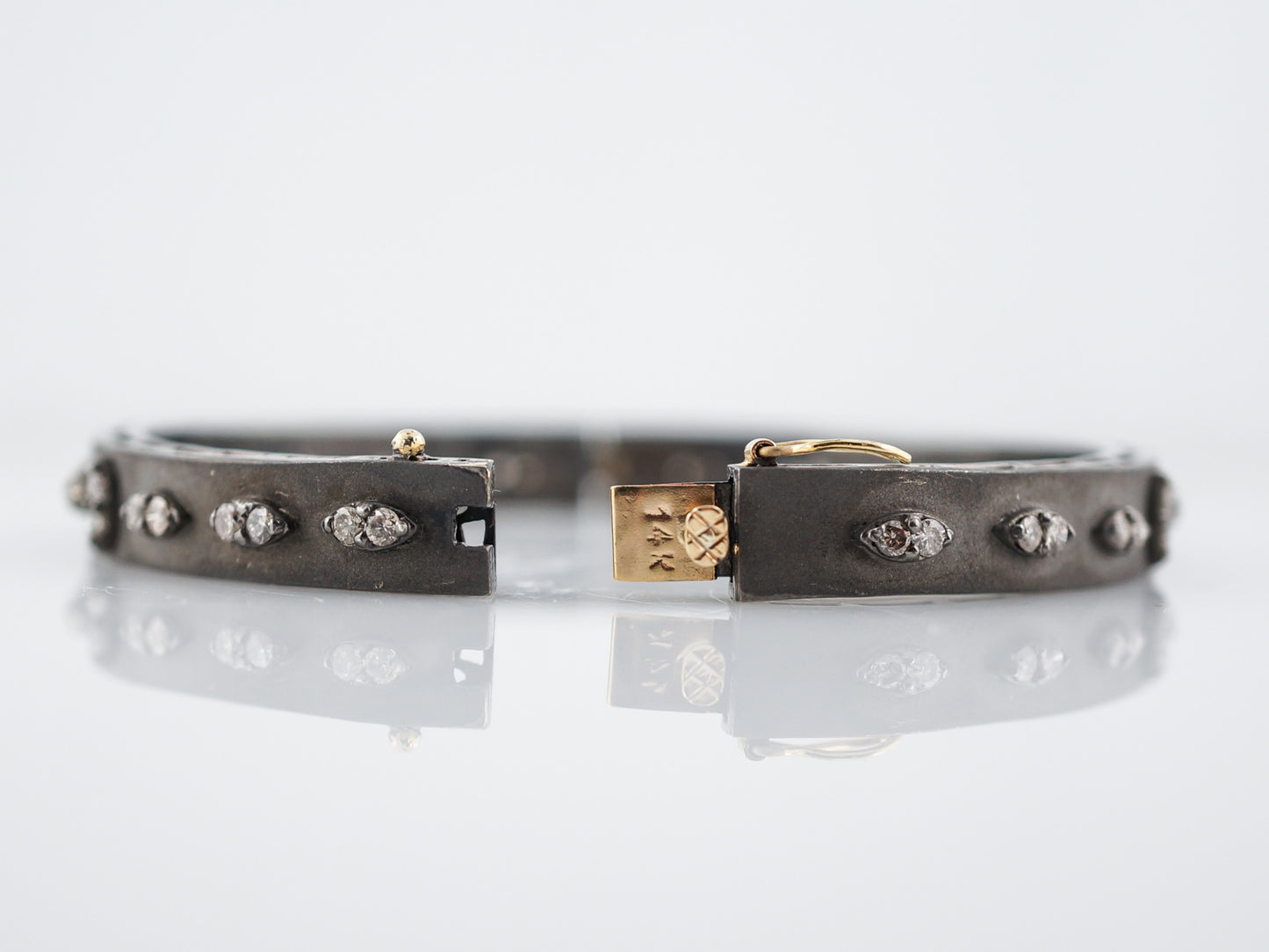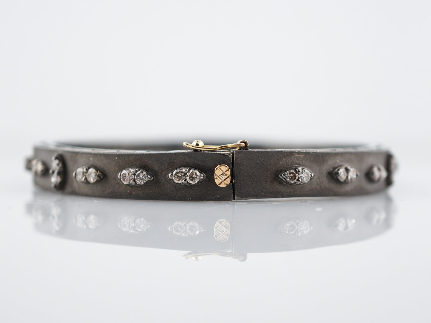 This Modern bangle bracelet is made with sterling silver and round brilliant cut diamonds. This bracelet has been oxidized to give it a patina and it also has a matte finish that gives it an industrial feel. This piece has diamonds set into it in vertical and horizontal stations running the entire length of the bracelet. This bangle has a yellow gold clasp and safety that provide a contrast to the cool silver.