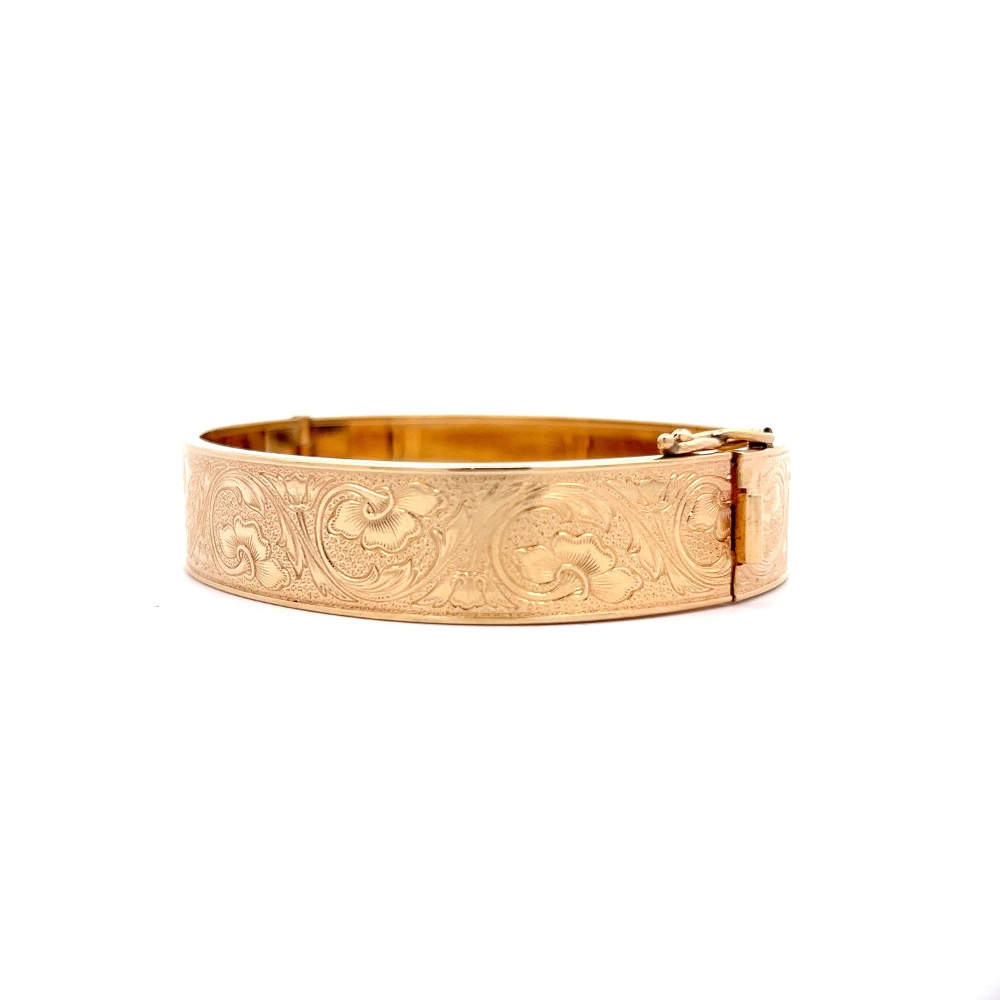 This Antique Victorian bangle bracelet is exquisite. Crafted with 14 karat yellow gold, this bracelet is polished to a brilliant shine. An impeccable floral engraving adorns the outside of the bracelet, making it not just a standard bangle. The bracelet has a comfortable fit and its unique design is sure to turn heads. Whether you are looking for an elegant accessory or a special gift, this bangle bracelet is the perfect choice!