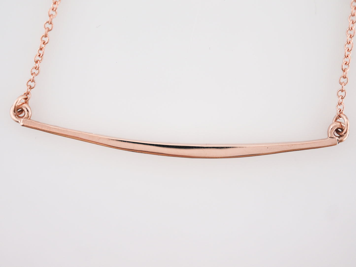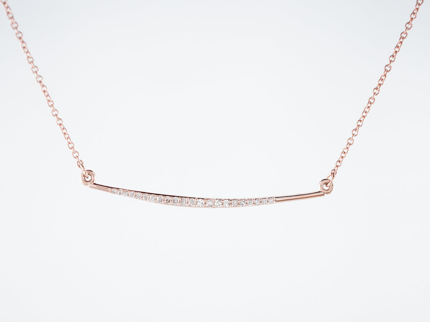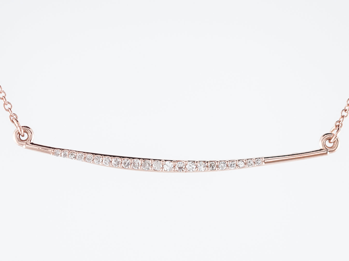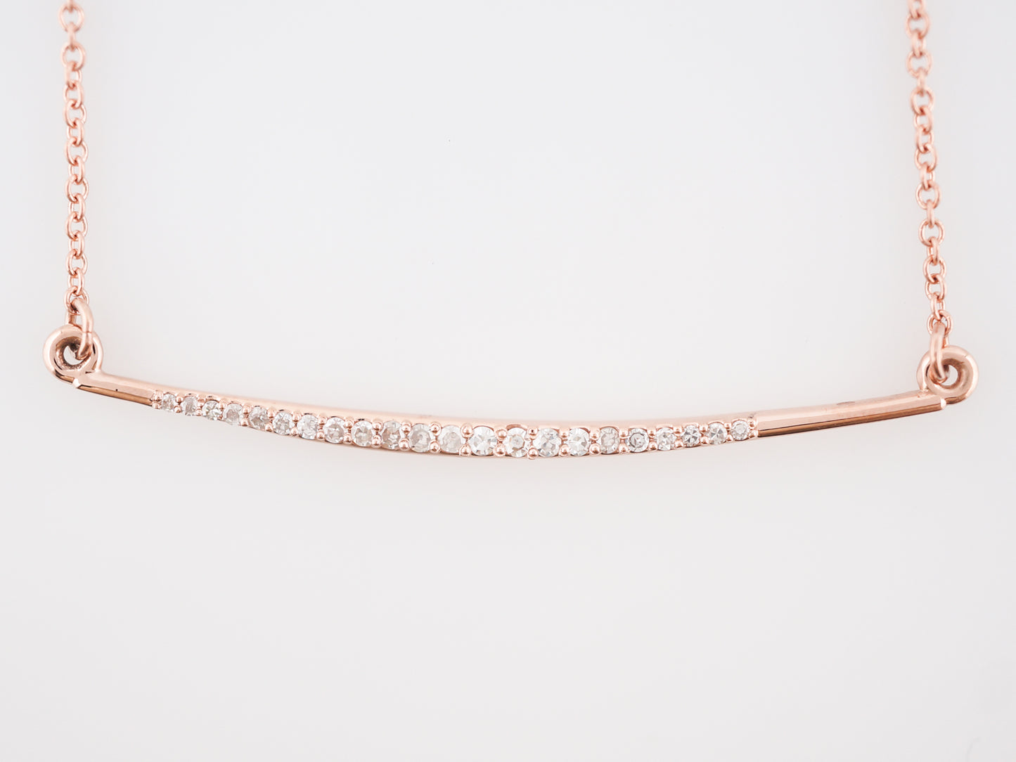 This modern era bar style necklace is a thin, lightweight piece that absolutely glitters with twenty-two (22) single cut diamonds which are prong set and graduate toward the center of the bar. Done in 14 karat rose gold, the bar is fixed into a cable link style chain and the necklace measures 18 inches in total length.