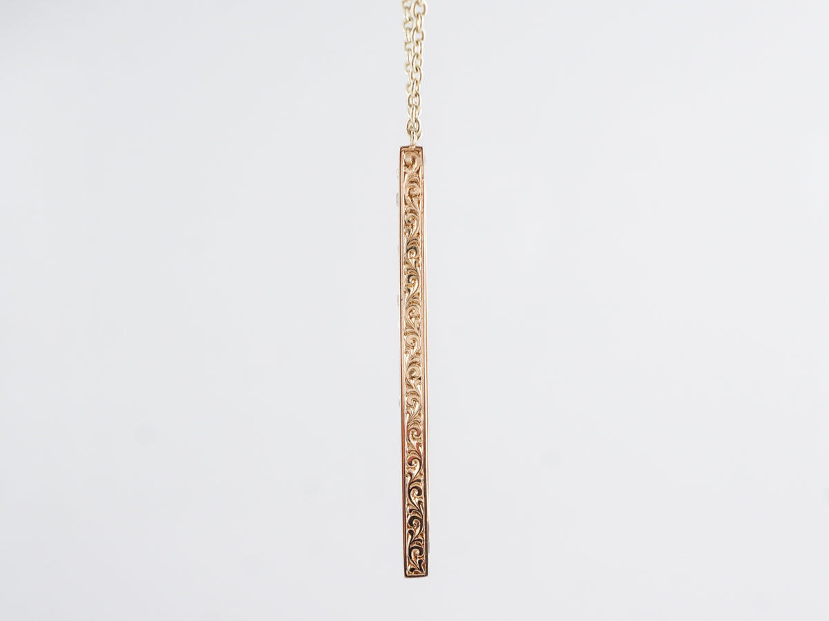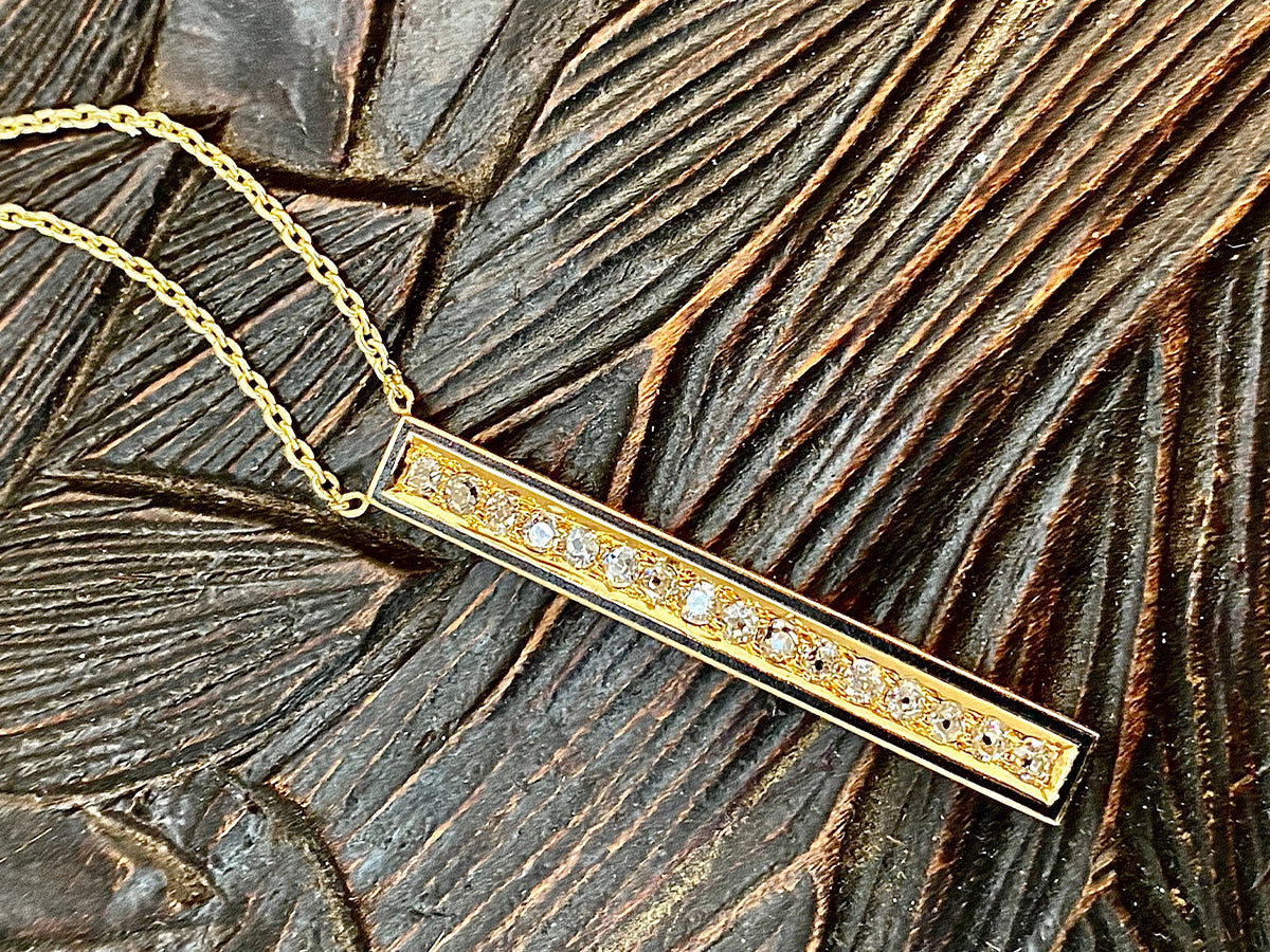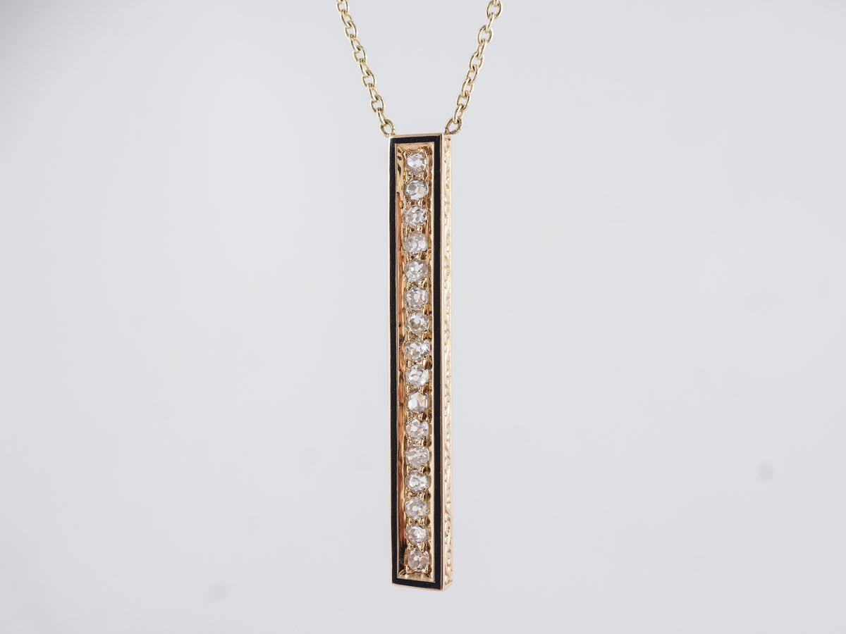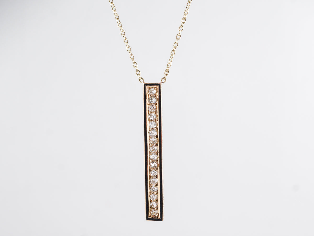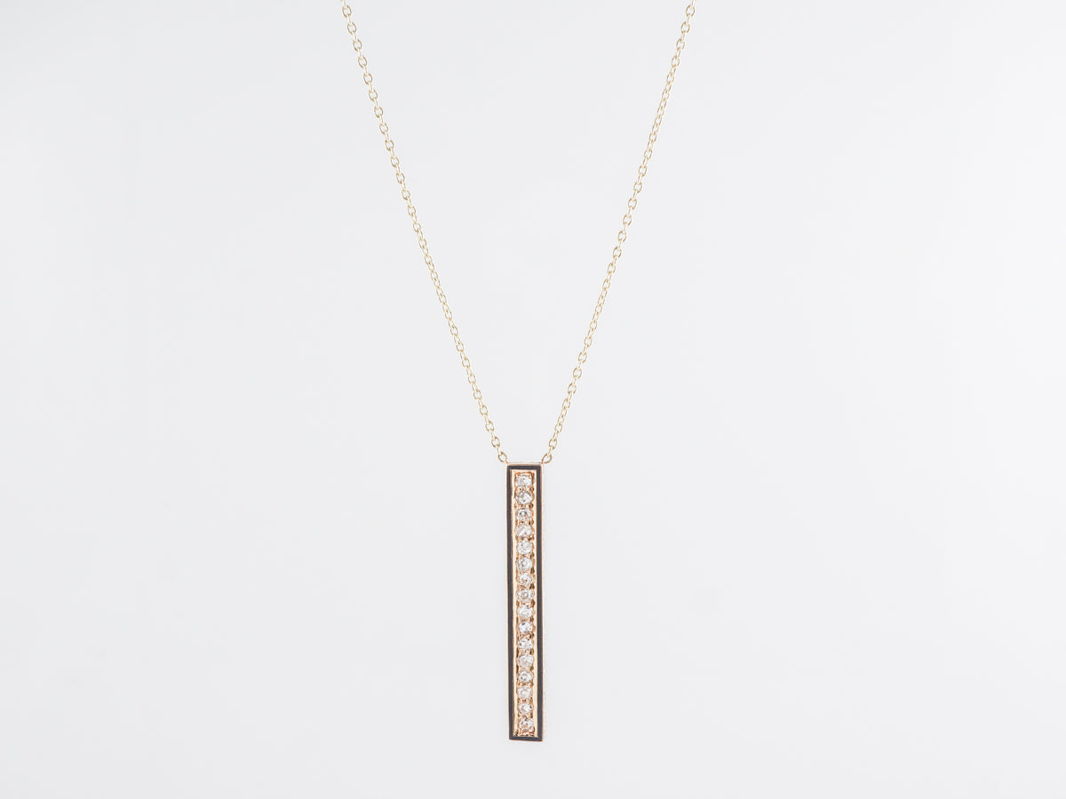 Bar Pendant Necklace w/ Diamonds in 14k. This amazing vertical bar pendant features .64 carats of round brilliant cut diamonds set in 14 karat yellow gold. The pendant sits north-south connected to the dainty yellow gold chain. This would make a wonderful gift for a special person in your life.