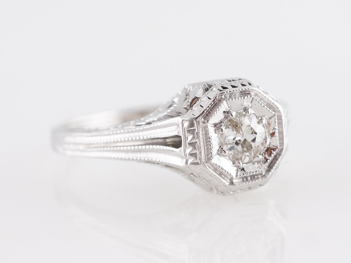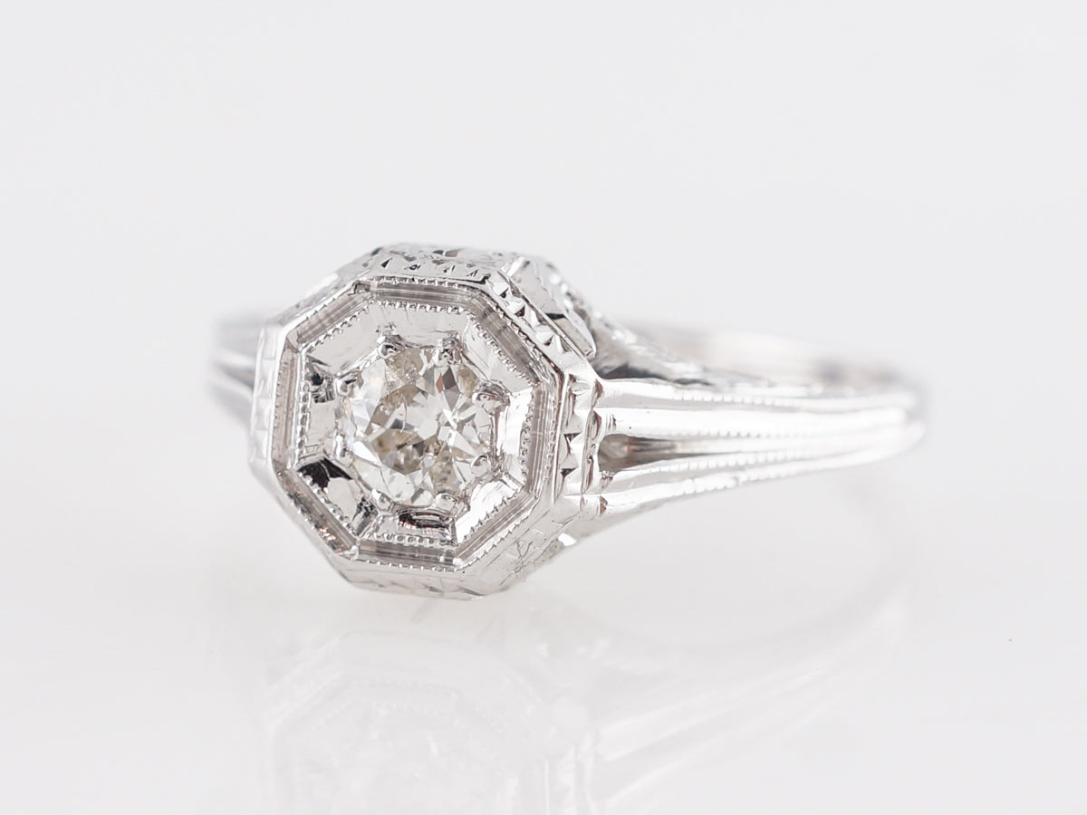 Belais Brothers Diamond Engagement Ring in 18k White Gold. This amazing vintage filigree ring features a .21 carat Old European cut diamond set in 18 karat white gold. The center stone is held in a smooth octagonal section, and leads into polished grooves running down the shoulders. Made by the famous Belais Brothers this special Art Deco engagement ring is as collectable as it is beautiful.