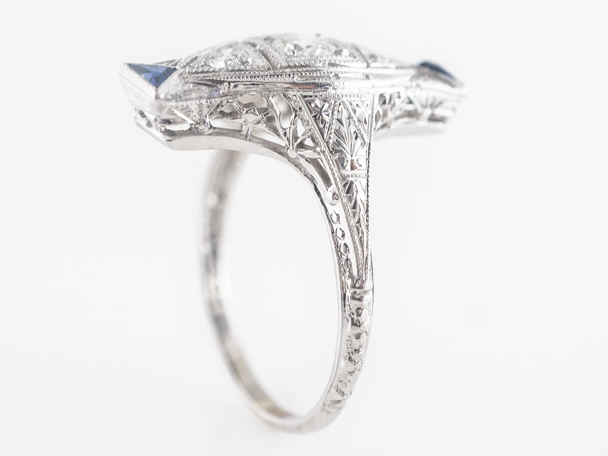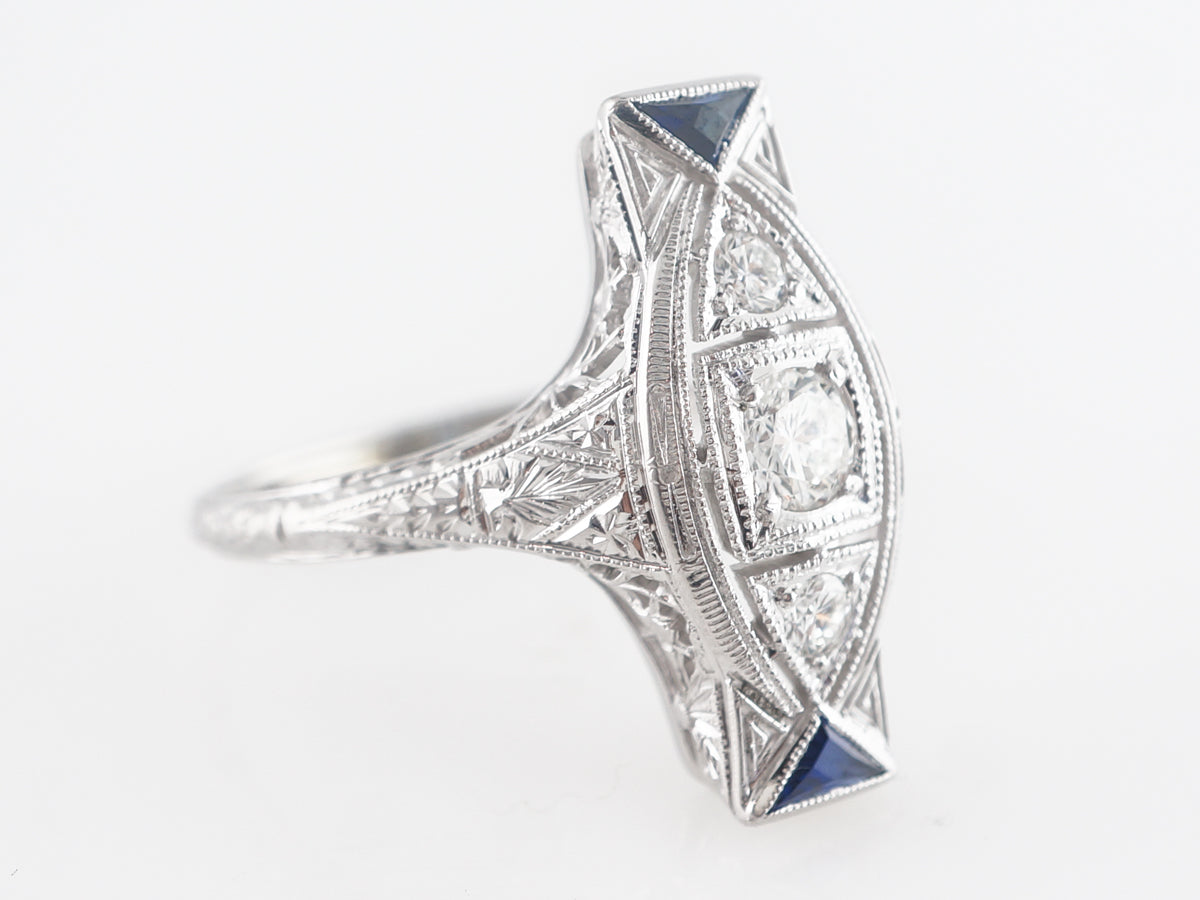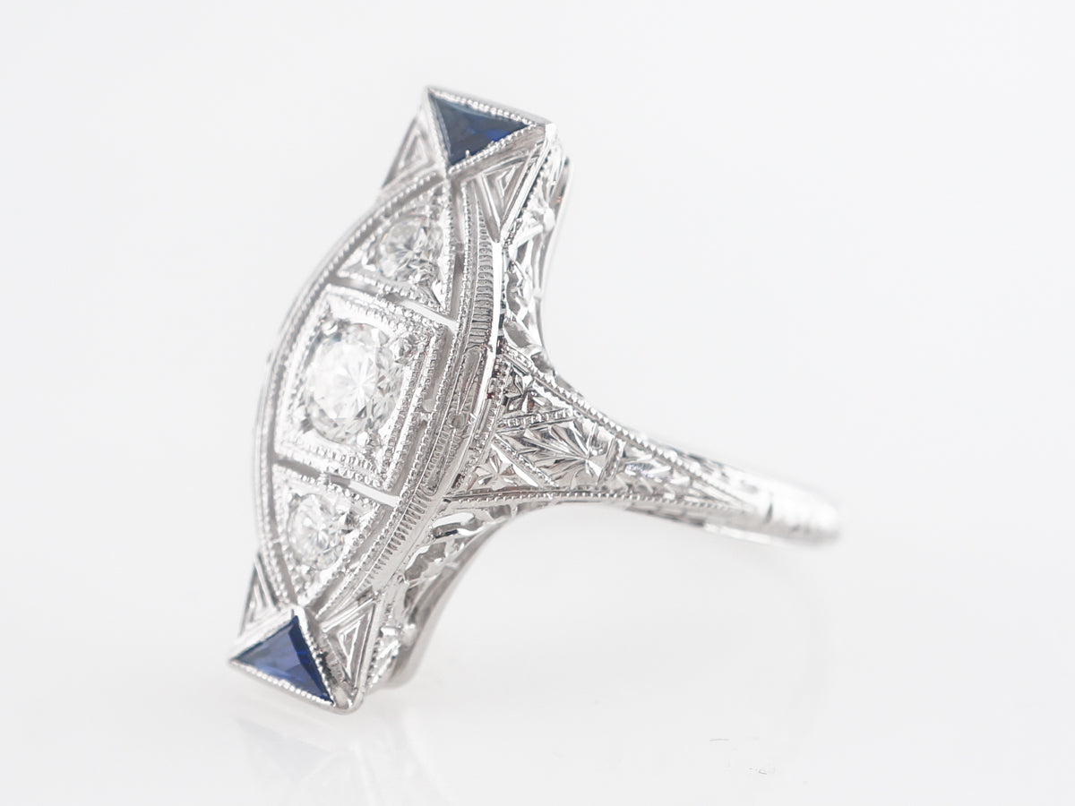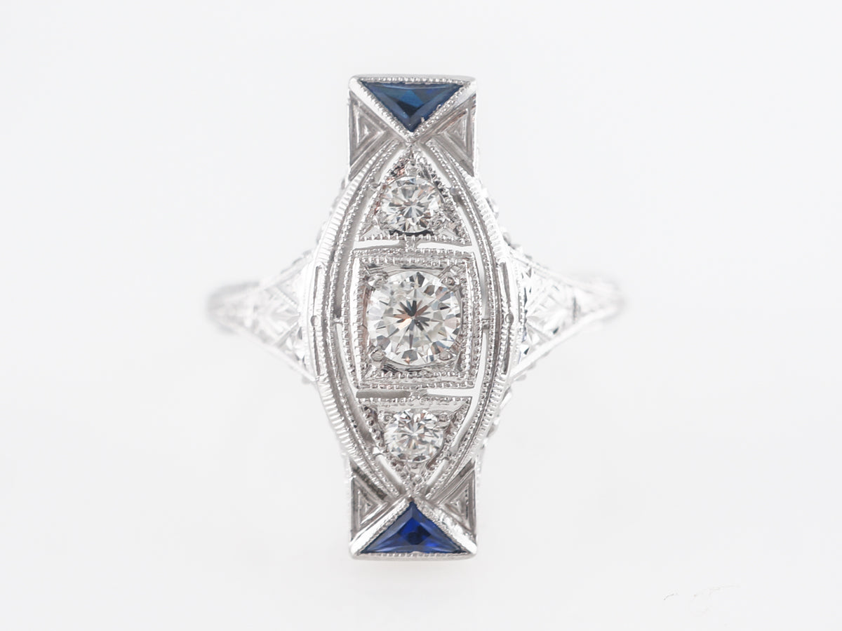 Belais Brothers Vintage Diamond and Sapphire Cocktail Ring. This elegant Art Deco diamond and sapphire ring was made by the famous jewelers, Belais Brothers, in 18 karat white gold. The ring is long and thin and runs along the top of the ring. Featuring .44 carats of round brilliant cut diamonds in the center, with thin open spaces separating them from the outer border. The gemstones are bordered by lines of milgrain, and running down the shoulders the ring presents wonderful filigree details. This is a very beautiful and very collectible Art Deco cocktail ring that will make someone very happy!