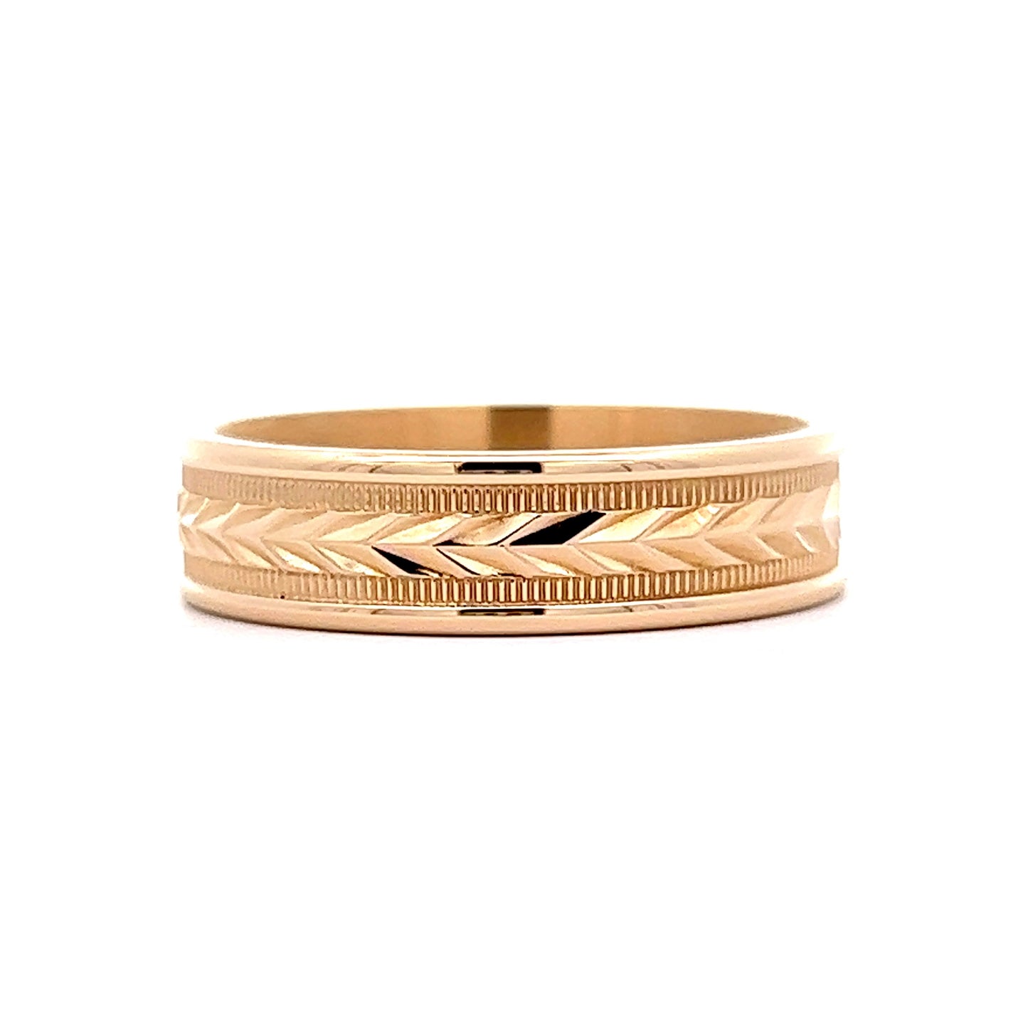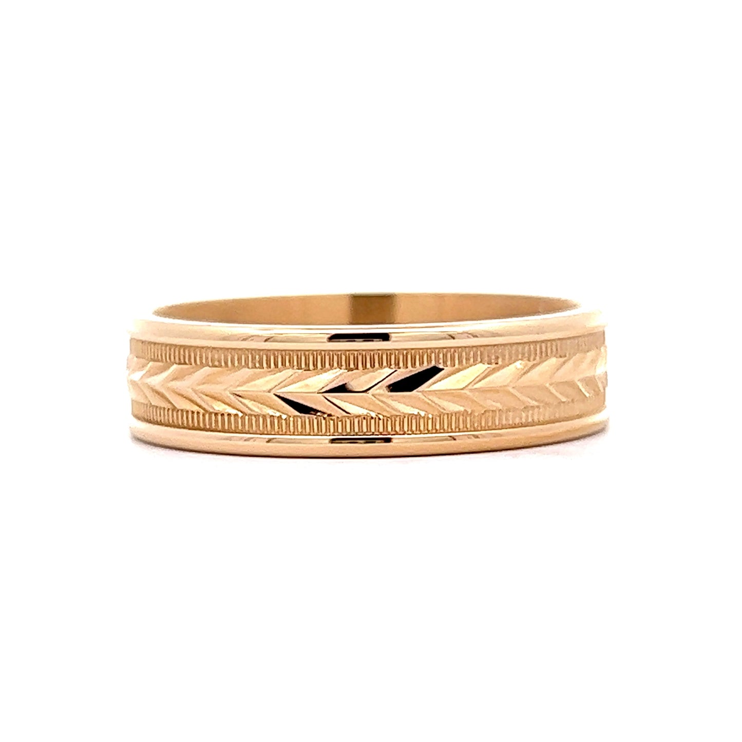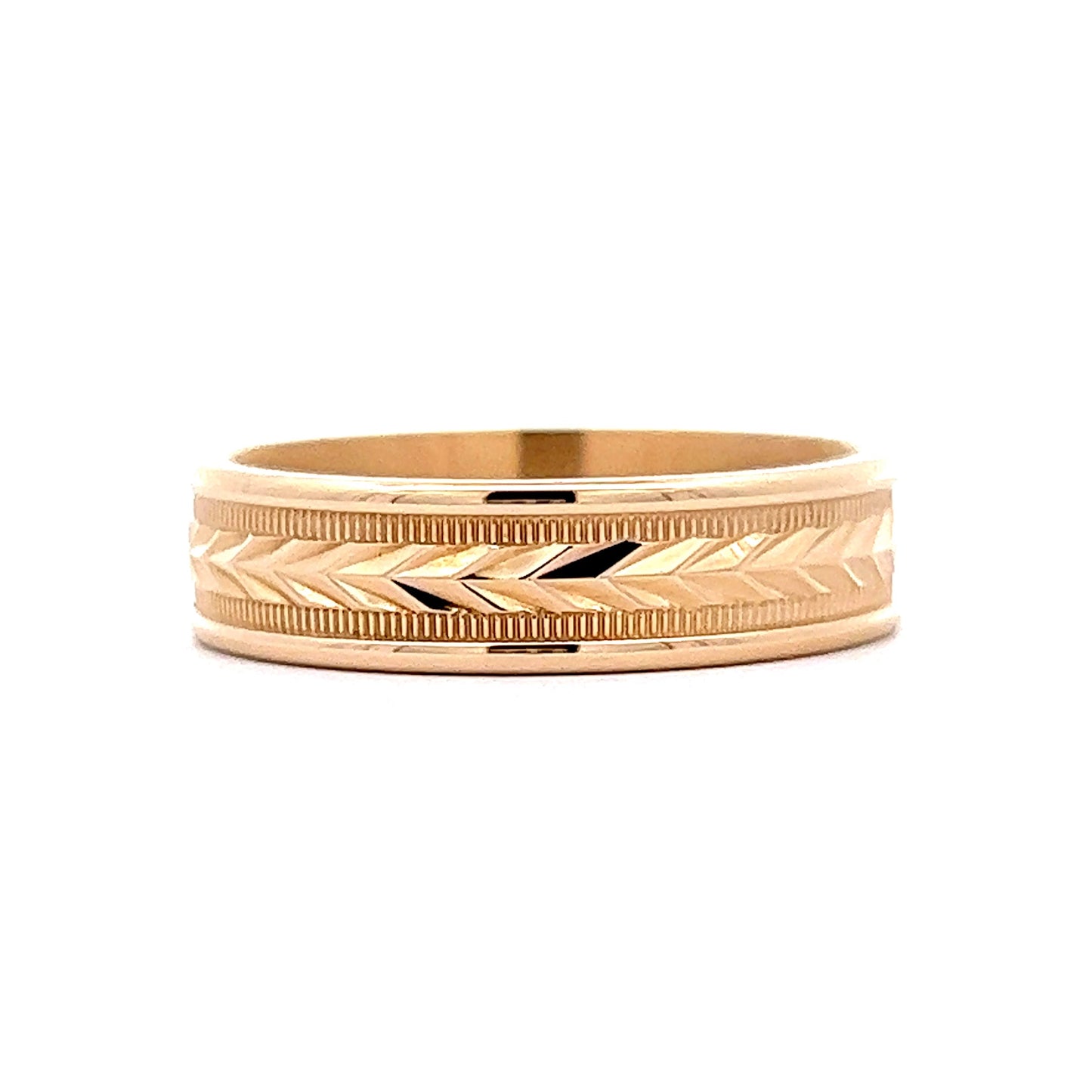 This men's wedding band is expertly crafted from 14 karat yellow gold. It has a flat edge comfort fit design with a modern chevron pattern engraved into the polished gold. The pattern is highlighted by the bright and warm tones of the yellow gold. This stunning wedding band is perfect for those looking for a classic and timeless piece that will stand the test of time.