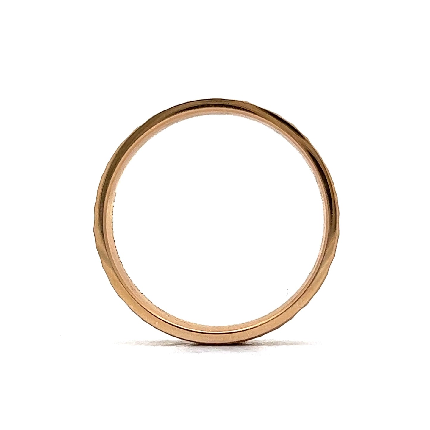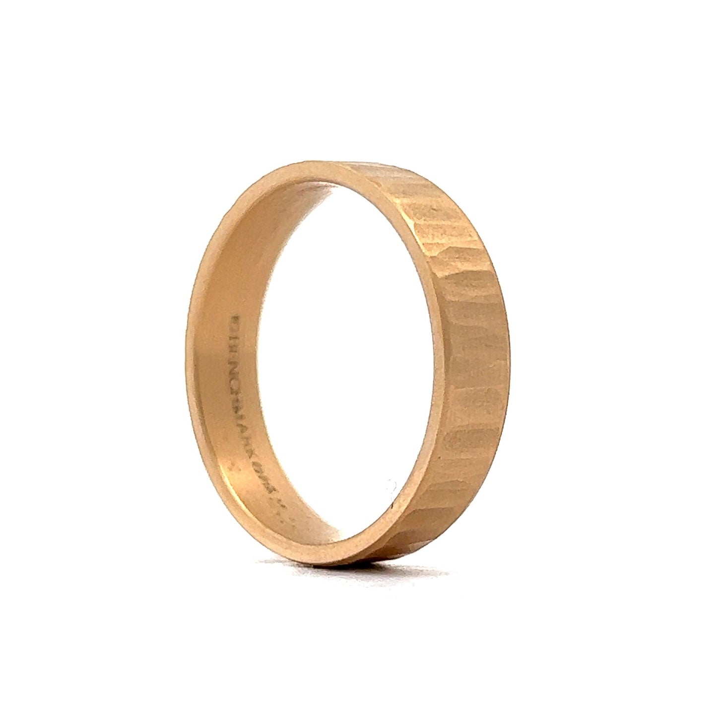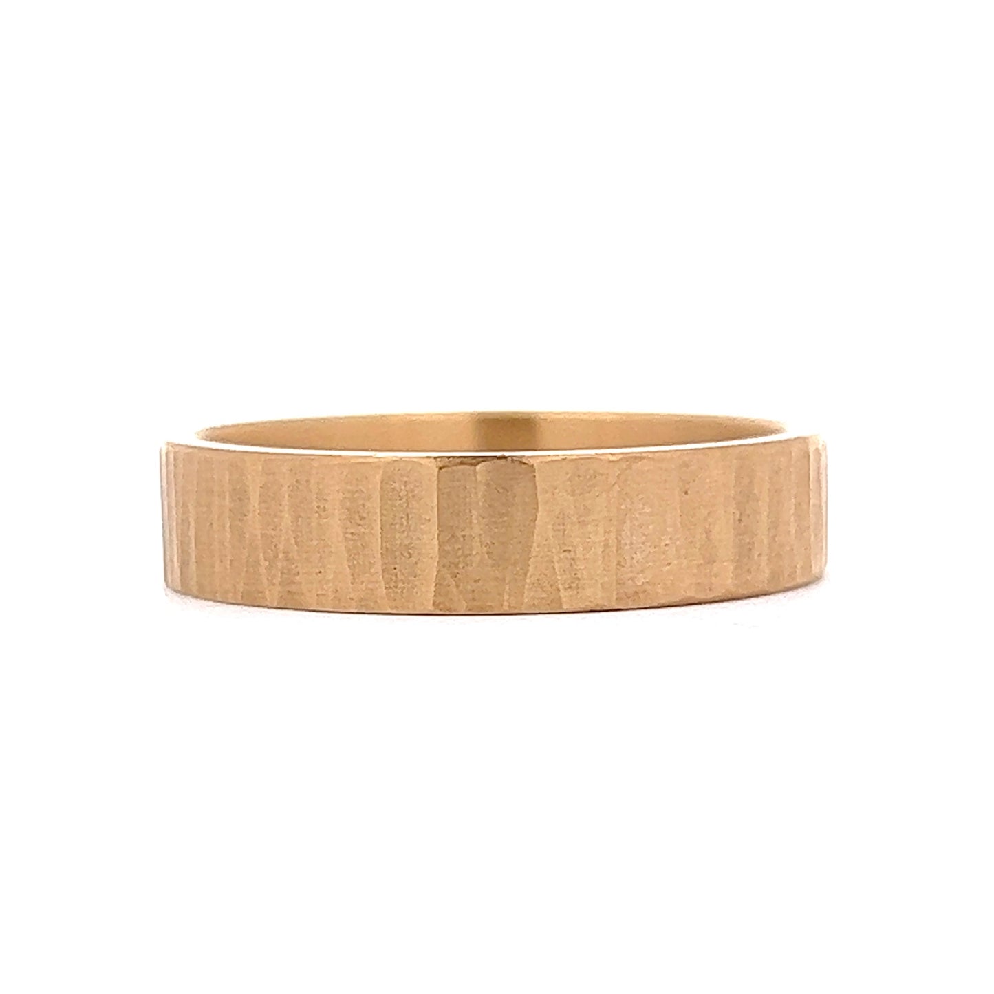 This modern men's wedding band is crafted from 14 karat yellow gold and features a flat edge comfort fit and a hammered texture. The brushed gold finish gives the ring a unique look that will stand out on any hand. This piece is perfect for someone looking for a unique and contemporary wedding band. The texture and flat edge provide a comfortable fit that will last a lifetime.