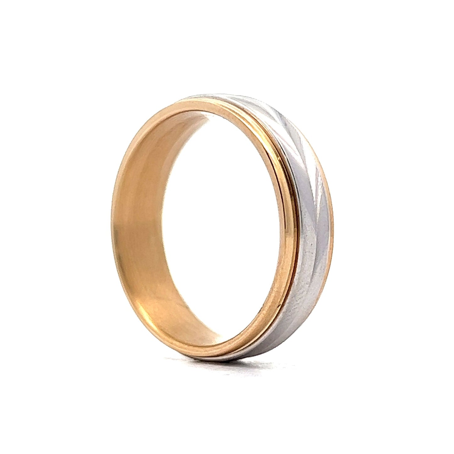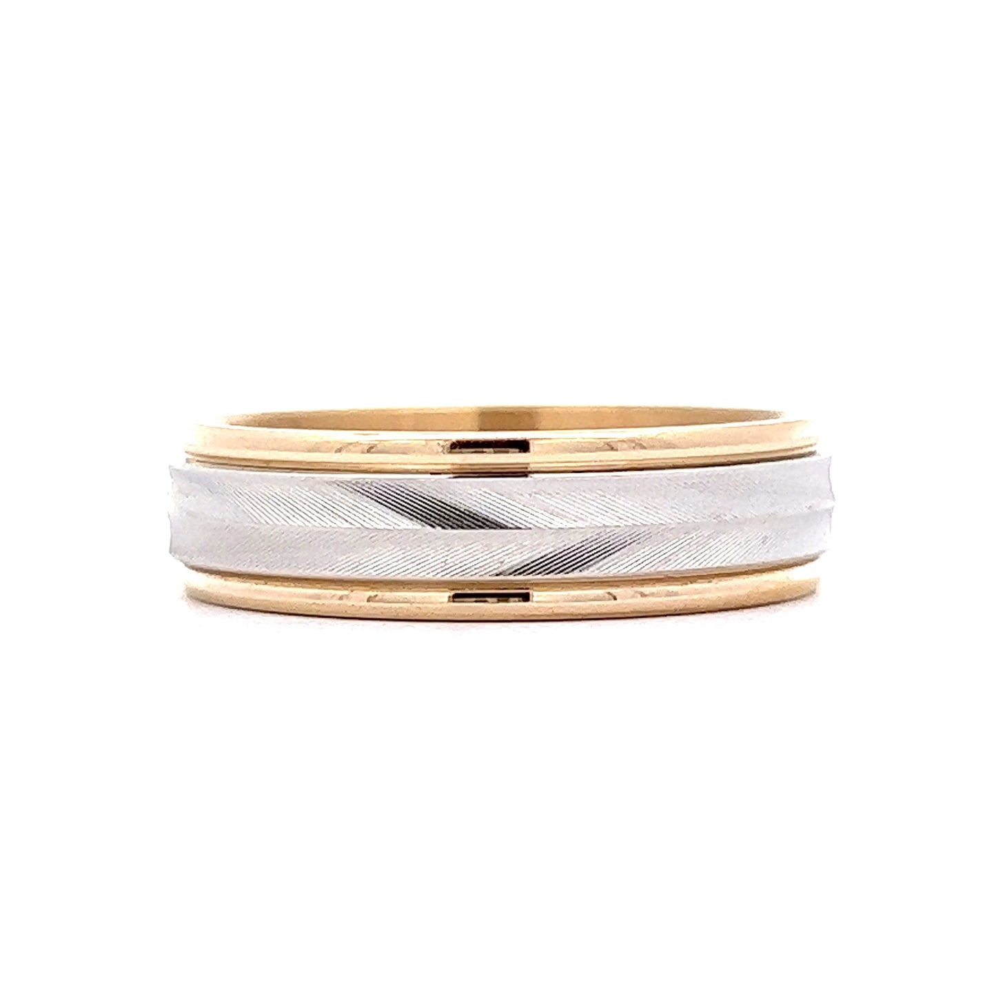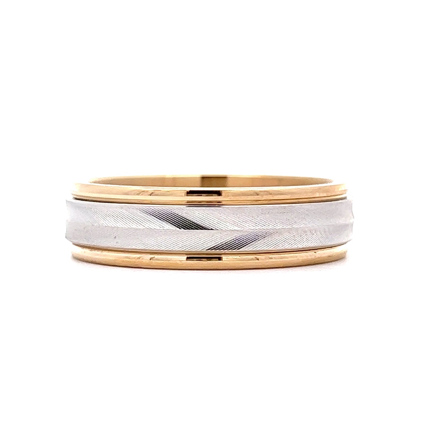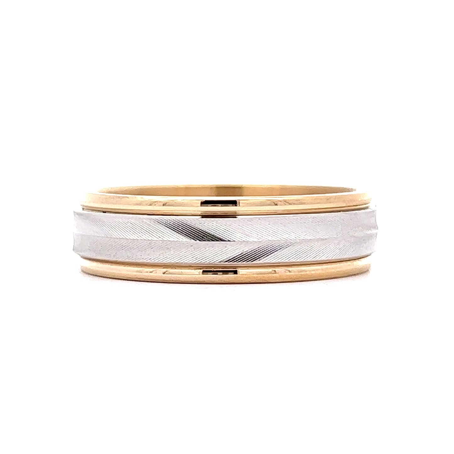 This impressive two-tone men's wedding band boasts modern style. The 14 karat yellow gold base features a chevron texture that runs along the width of the band, and is bordered by a thin 14 karat white gold beveled edge. The flat edge design and comfort fit provide extra comfort and a sleek look. This wedding band is perfect for a groom looking for a unique and stylish piece.