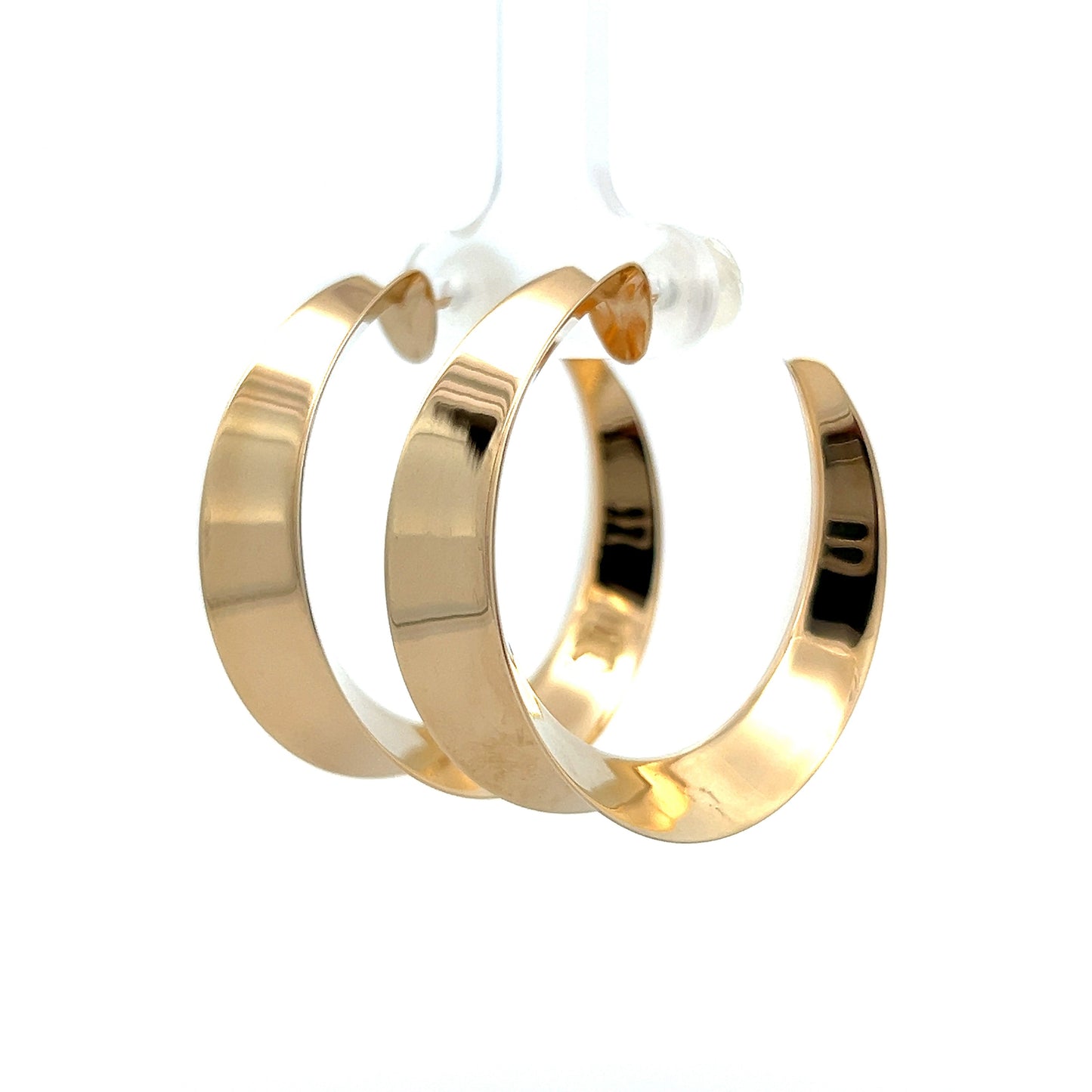 These stunning hoop earrings feature a beveled design that adds a touch of texture to the classic hoop style. Crafted in high polished 14 karat yellow gold, these earrings will be a timeless addition to your jewelry collection. Each earring measures 15mm in length, making it the perfect size for everyday wear. The hoops are expertly designed to catch the light and sparkle from every angle.