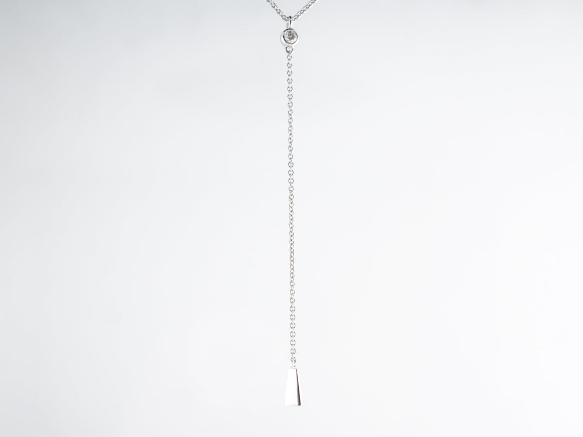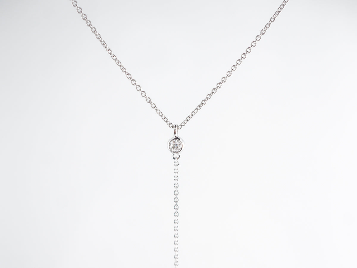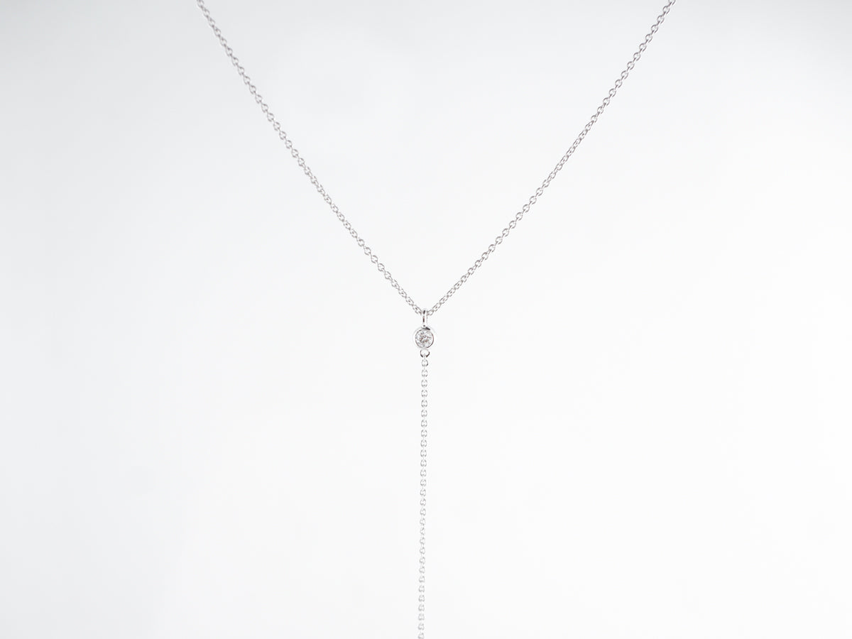 Bezel Diamond Y Necklace in 18K White Gold. This beautiful Y necklace is finished in 18 karat white gold and contains a small round brilliant cut diamond. The chain measures 18 inches in length and has a tail running down from the diamond. This elegant design would look great on its own or layered with other chains.