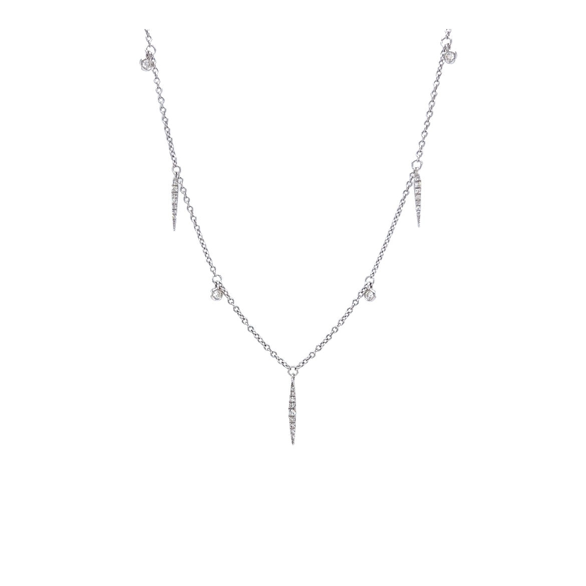 This modern diamond necklace is finished in 18 karat white gold. The diamonds are set in a magical layout with some hanging in little tapered lines off jump rings and others in bezel settings. This mixture gives a sparkling appearance of icicles on a frosty winter morning, what a wonderful gift this could be! A diamond station necklace with personality!