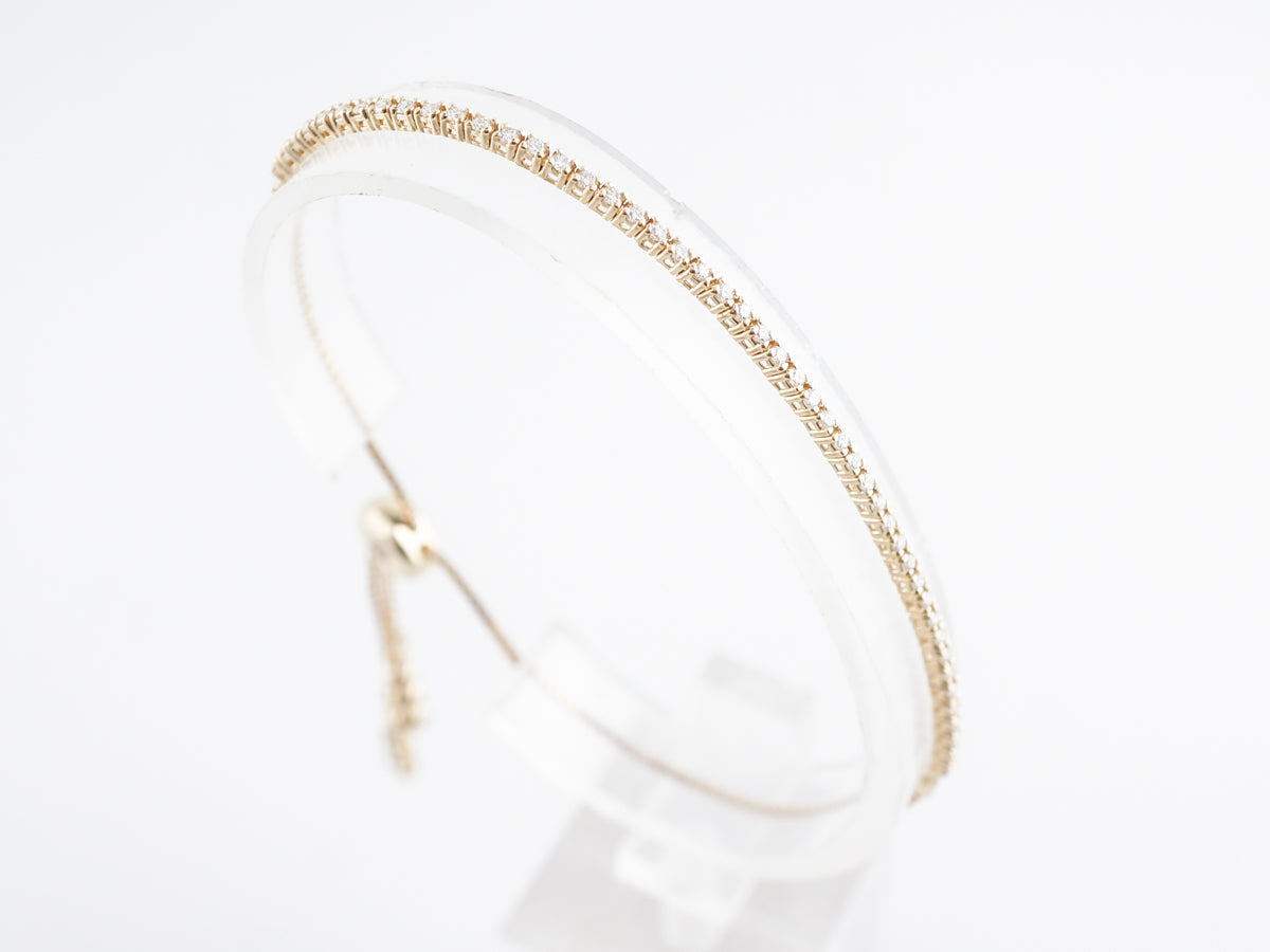 Bezel Set Diamond Bracelet in 14k Yellow Gold. This fascinating bracelet features .62 carats of round brilliant cut diamonds and is set in 14 karat yellow gold. The design of this thin bracelet is very modern with a string of diamonds running down part of the way and ending with a large gold mounting that holds a diamond and two small strings of bezel set diamonds. A very stylish piece that would make an amazing gift to yourself or someone special in your life.