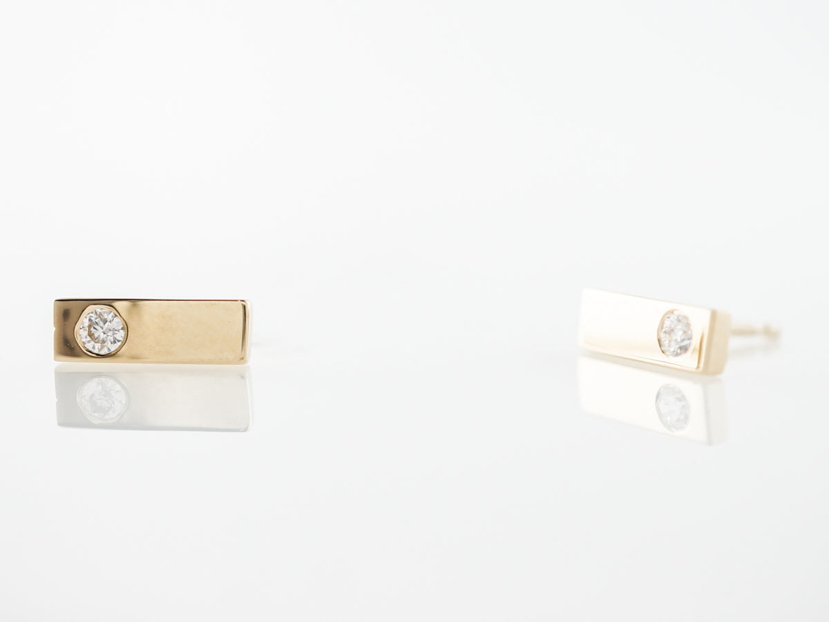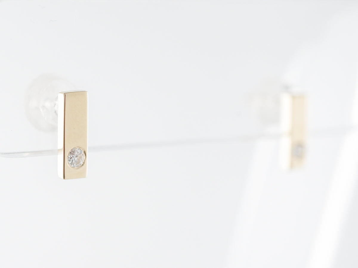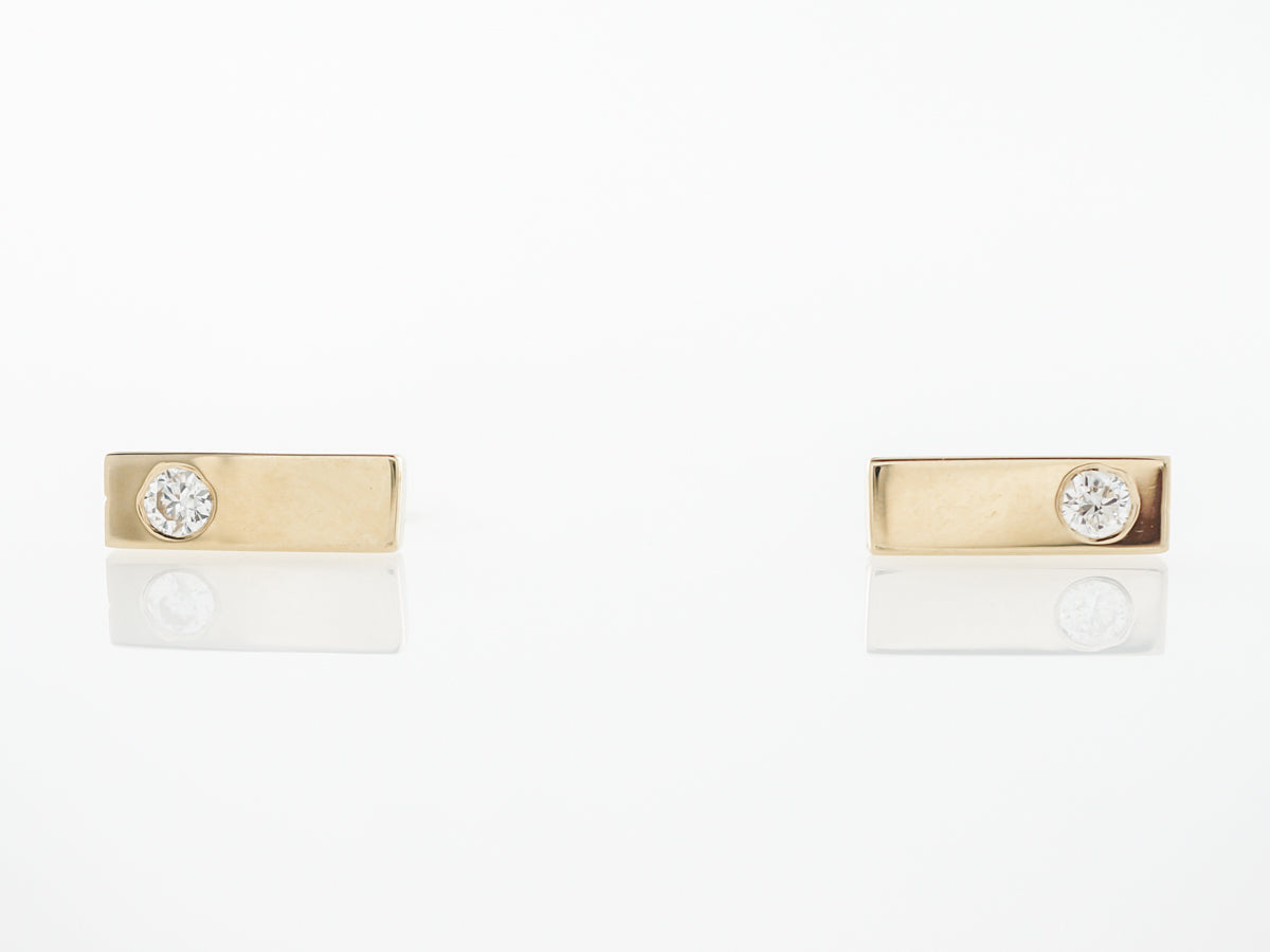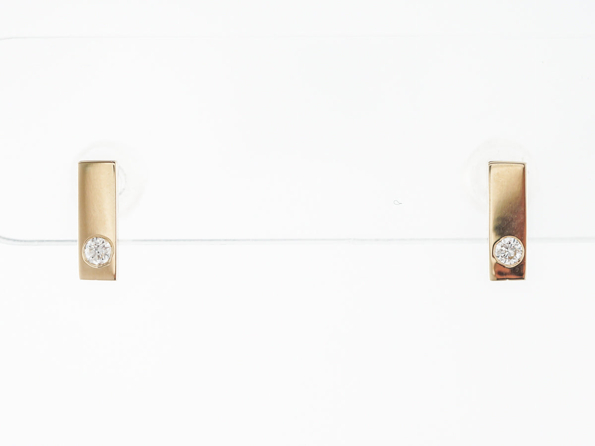 Bezel Set Diamond Stud Earrings in Yellow Gold. These modern diamond earrings have a very linear look. Each earring features a .04 carat round brilliant cut diamond that is bezel set into a yellow gold rectangle. Fun and versatile, these earrings can be worn everyday for any occasion.