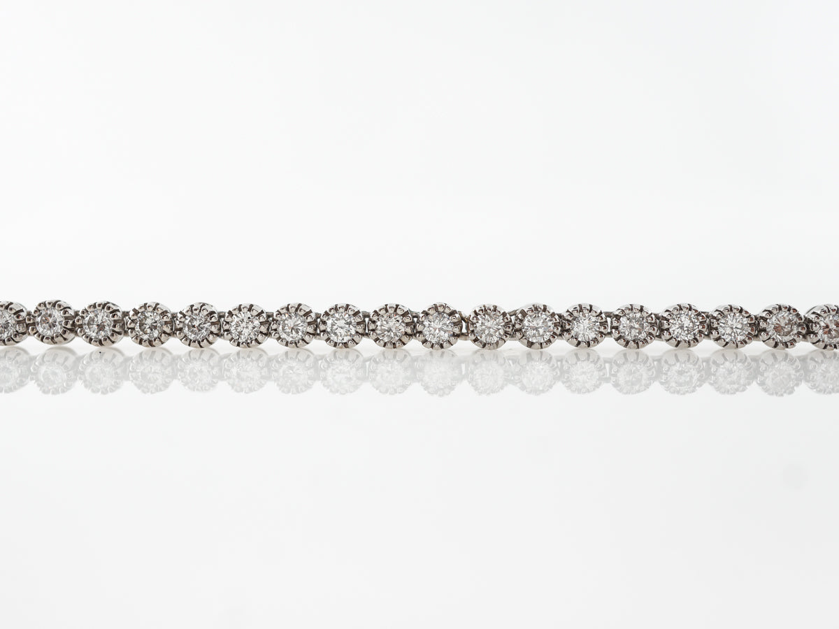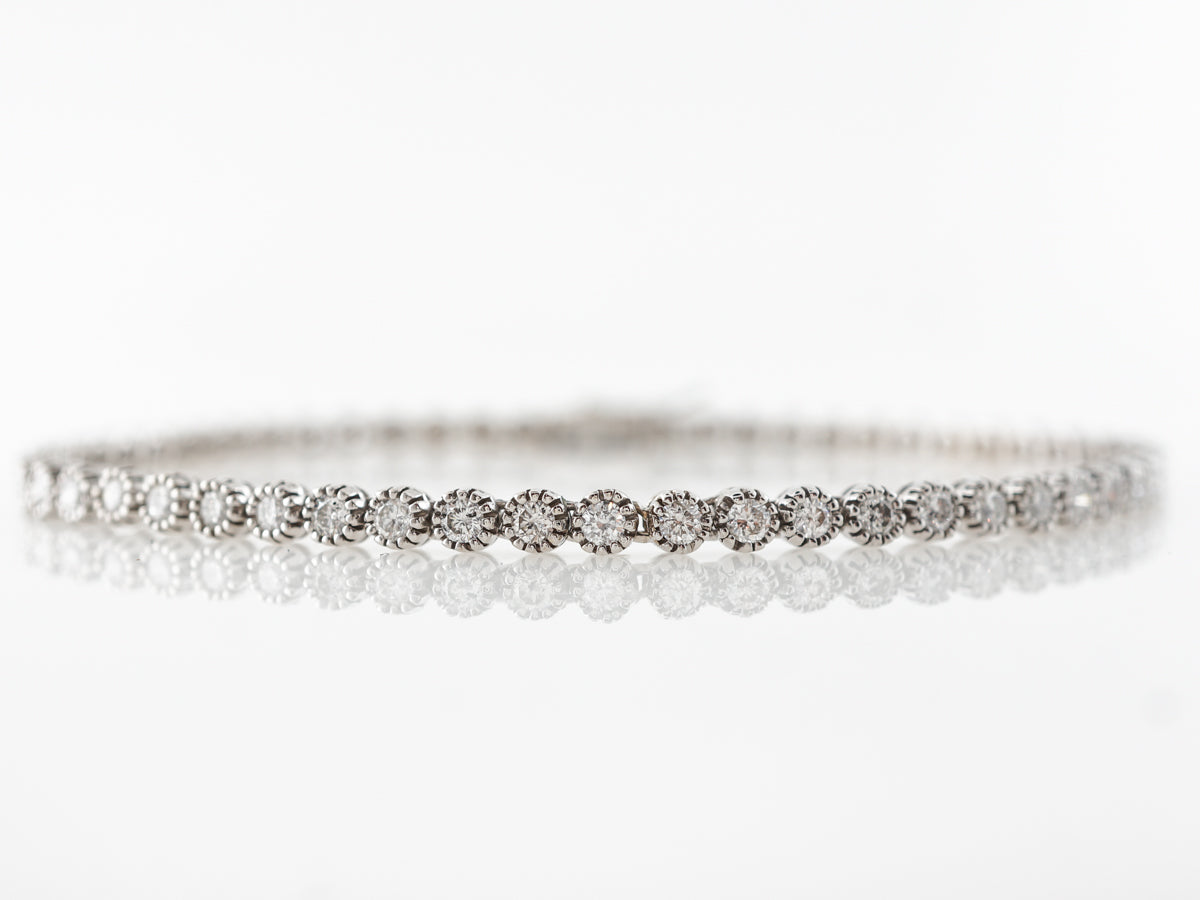 Bezel Set Diamond Tennis Bracelet in White Gold. This modern tennis bracelet features 2.25 carats of Round Brilliant Cut diamonds in 14 karat white gold. Tennis bracelets are a staple of any jewelry collection and this one manages to put a slightly different twist on the classic look with its spaced out bezel setting on each stone. This bracelet would make an excellent gift and will be passed down for generations.