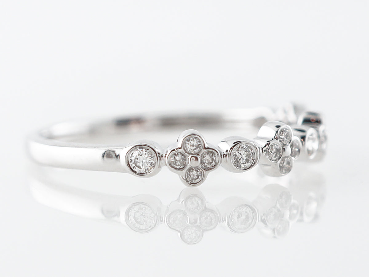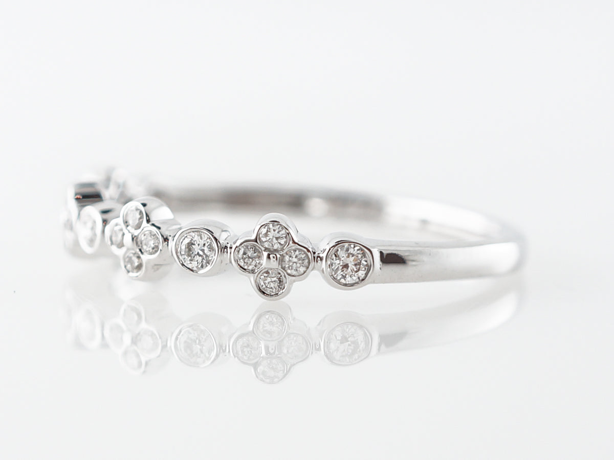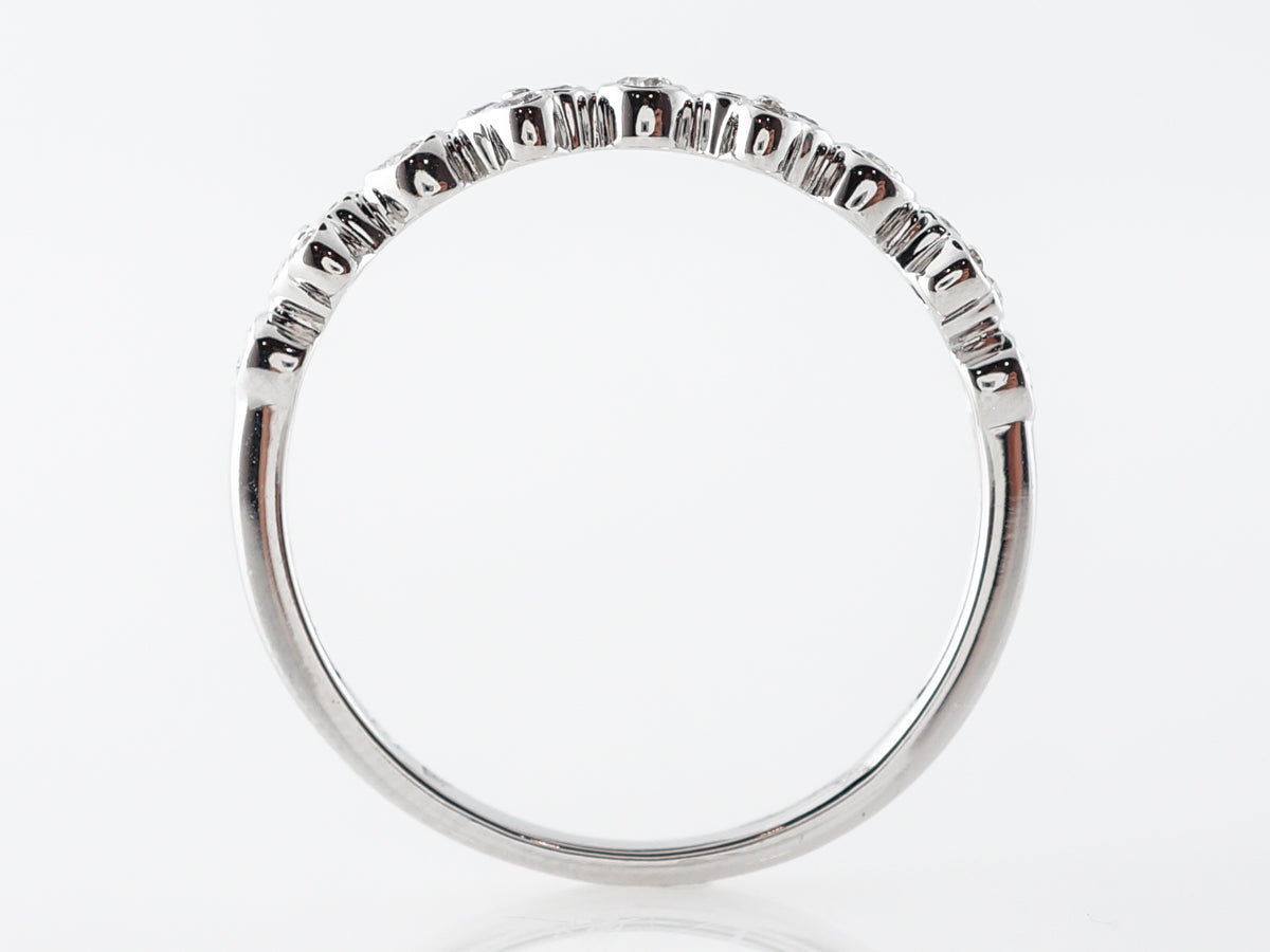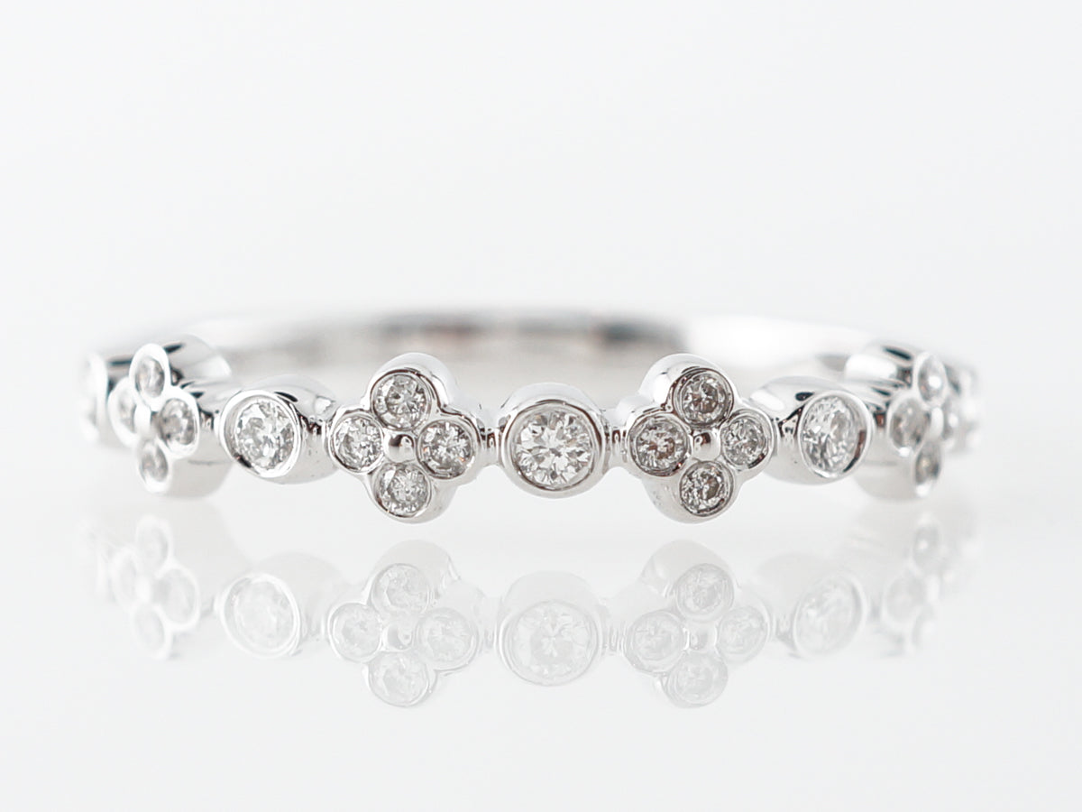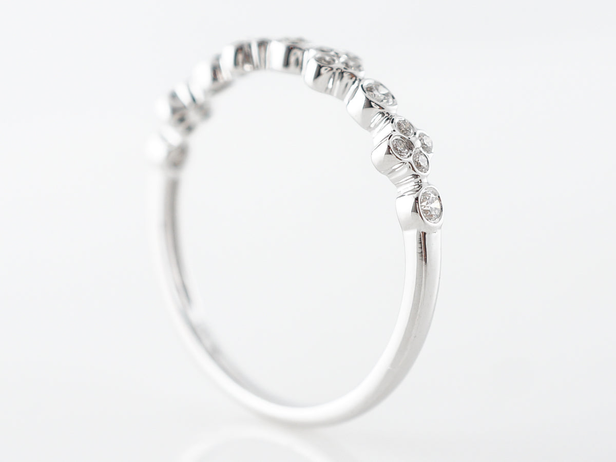 Bezel Set Diamond Wedding Band in 14k White Gold. This modern wedding band features .16 carats of round brilliant cut diamond set across the top of the band. The bezel set diamonds in clusters of four (4) set apart from larger bezel set diamonds alone give this ring a nice repeating pattern across the top. This ring will pair nicely with an engagement ring or in a stack of bands.