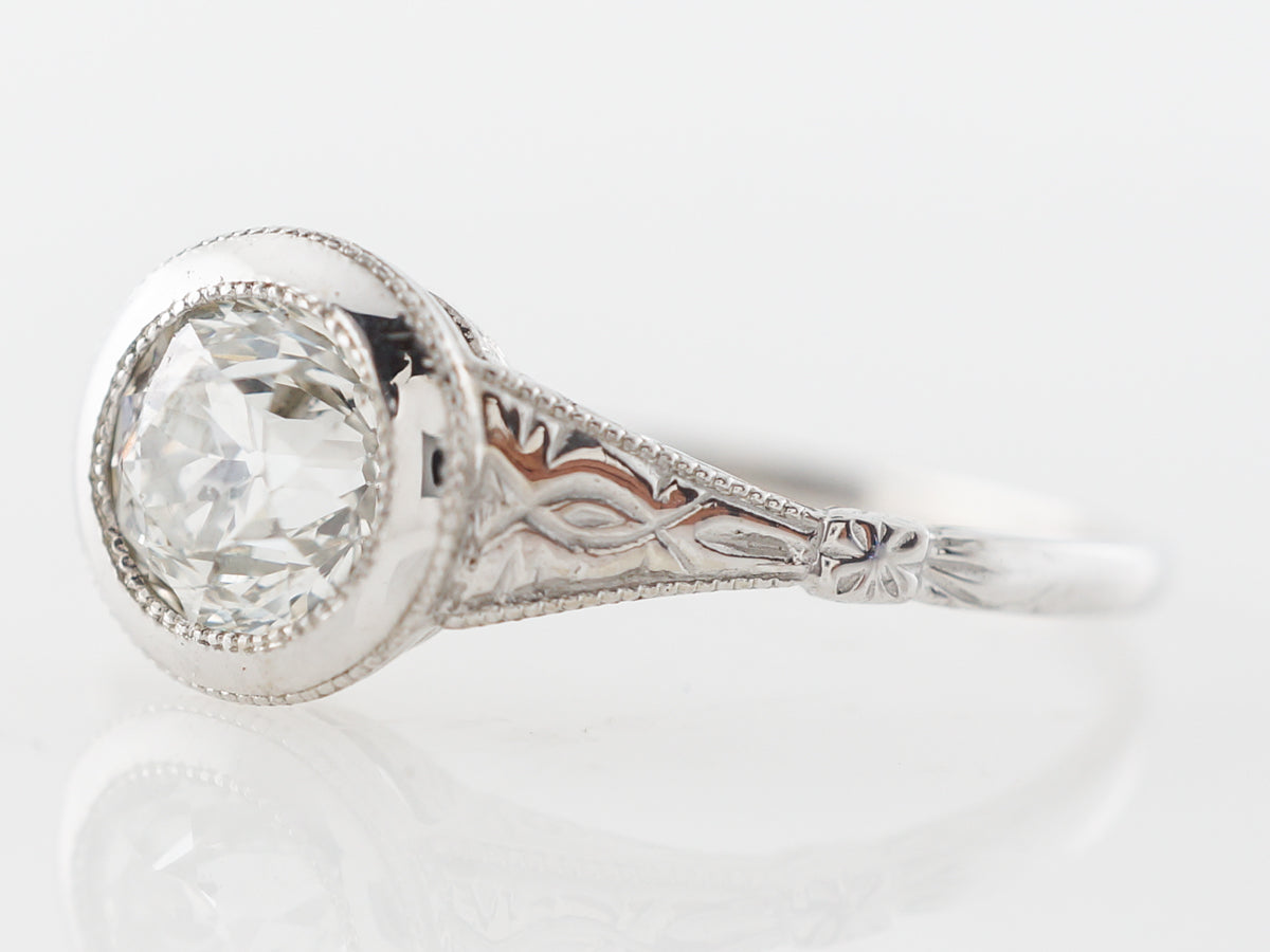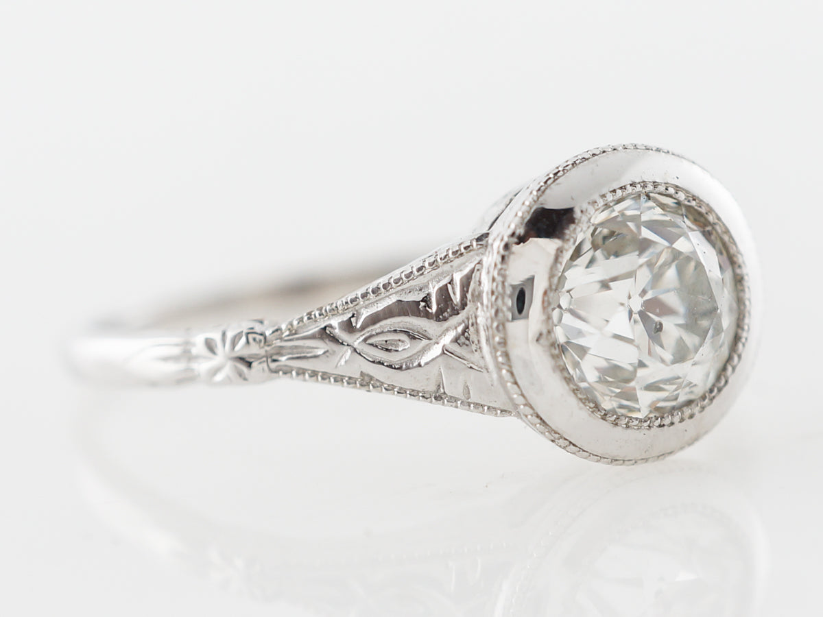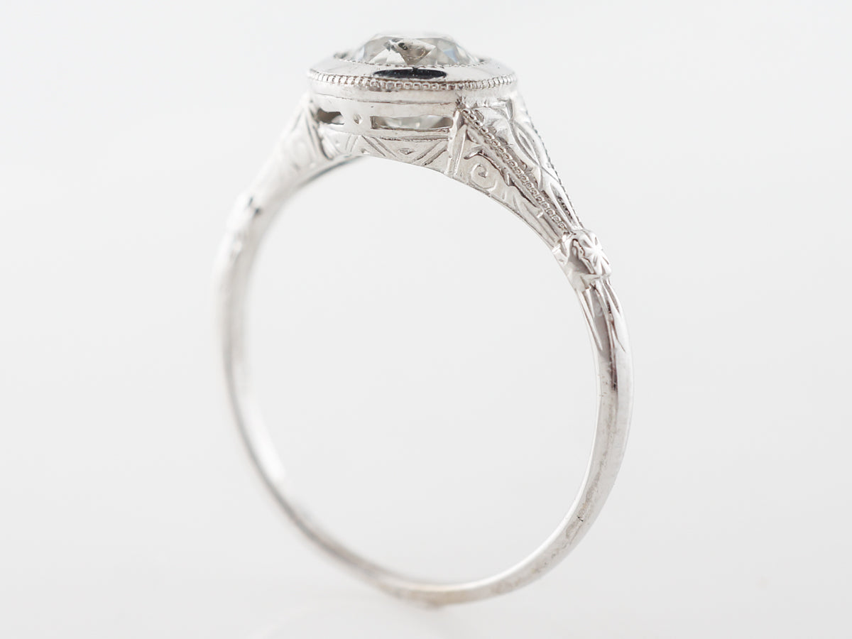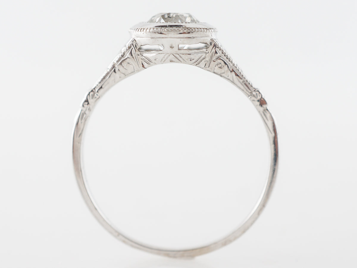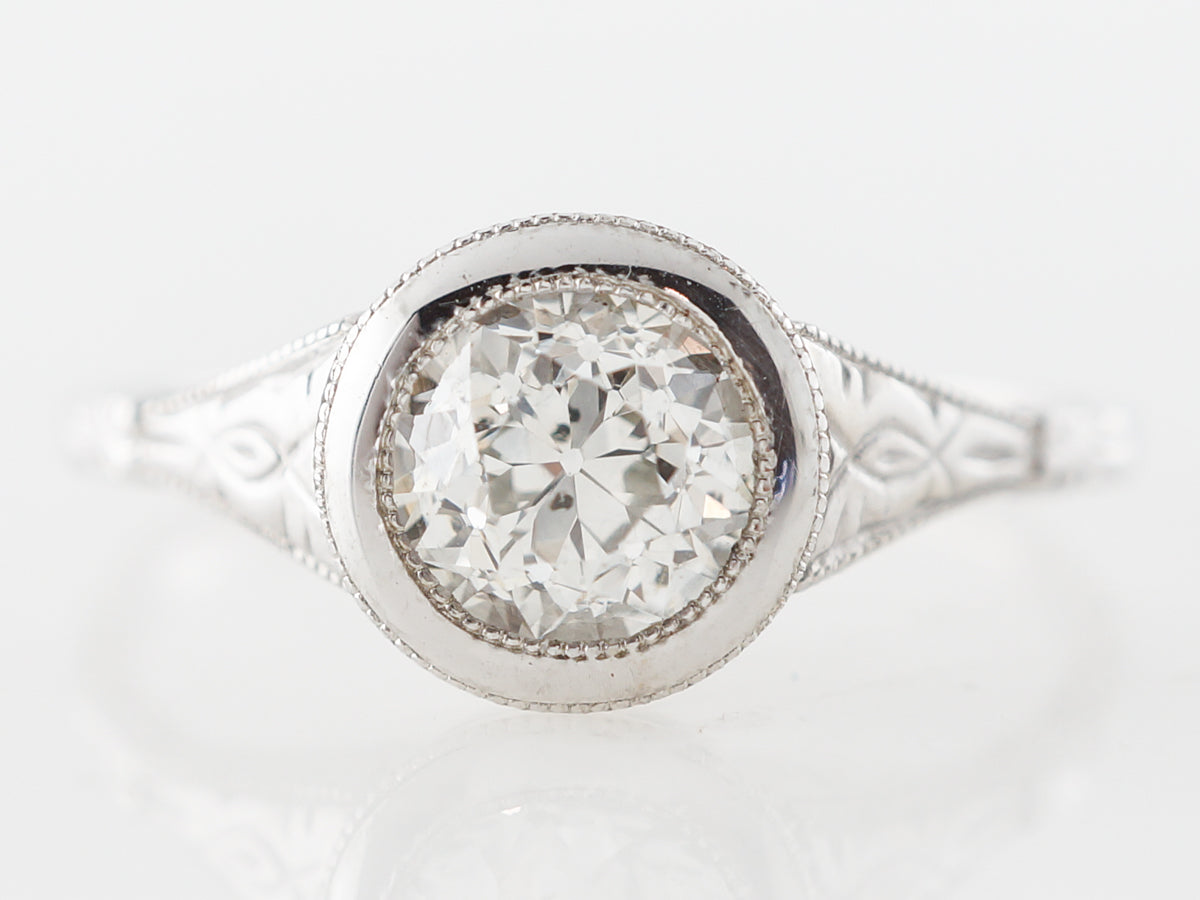 Bezel Set Euro Cut Diamond Solitaire in White Gold. This Old European cut diamond solitaire engagement ring is set in 14 karat white gold and features fine engraving on the shoulders and milgrain edge work. The elegant thin shank expands to shoulders with wonderful detail and ultimately the bezel set old European cut diamond. This ring has a relatively low profile and is subtle and elegant.
