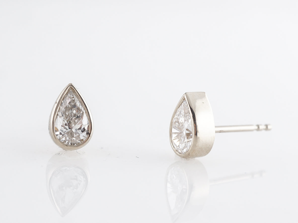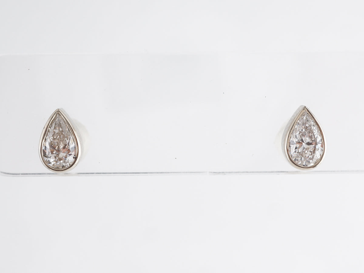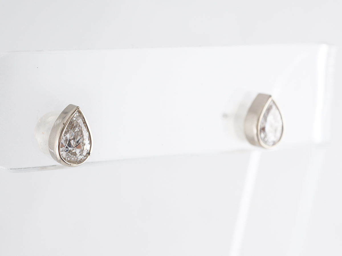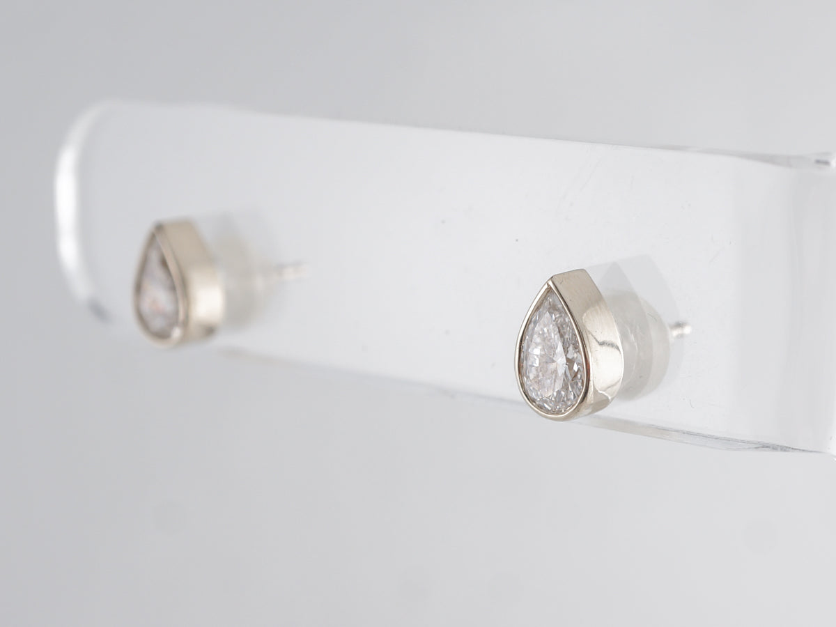 Bezel Set Pear Diamond Earrings in 14k White Gold. These custom sustainable pear shape diamond stud earrings are set in light 14 karat white gold bezels. The pear shape diamond weigh .50 carats each with a total weight of 1.00 carats.The high polish of the white gold bezels transitions seamlessly to the brilliance of these lovely pear shaped diamond studs.