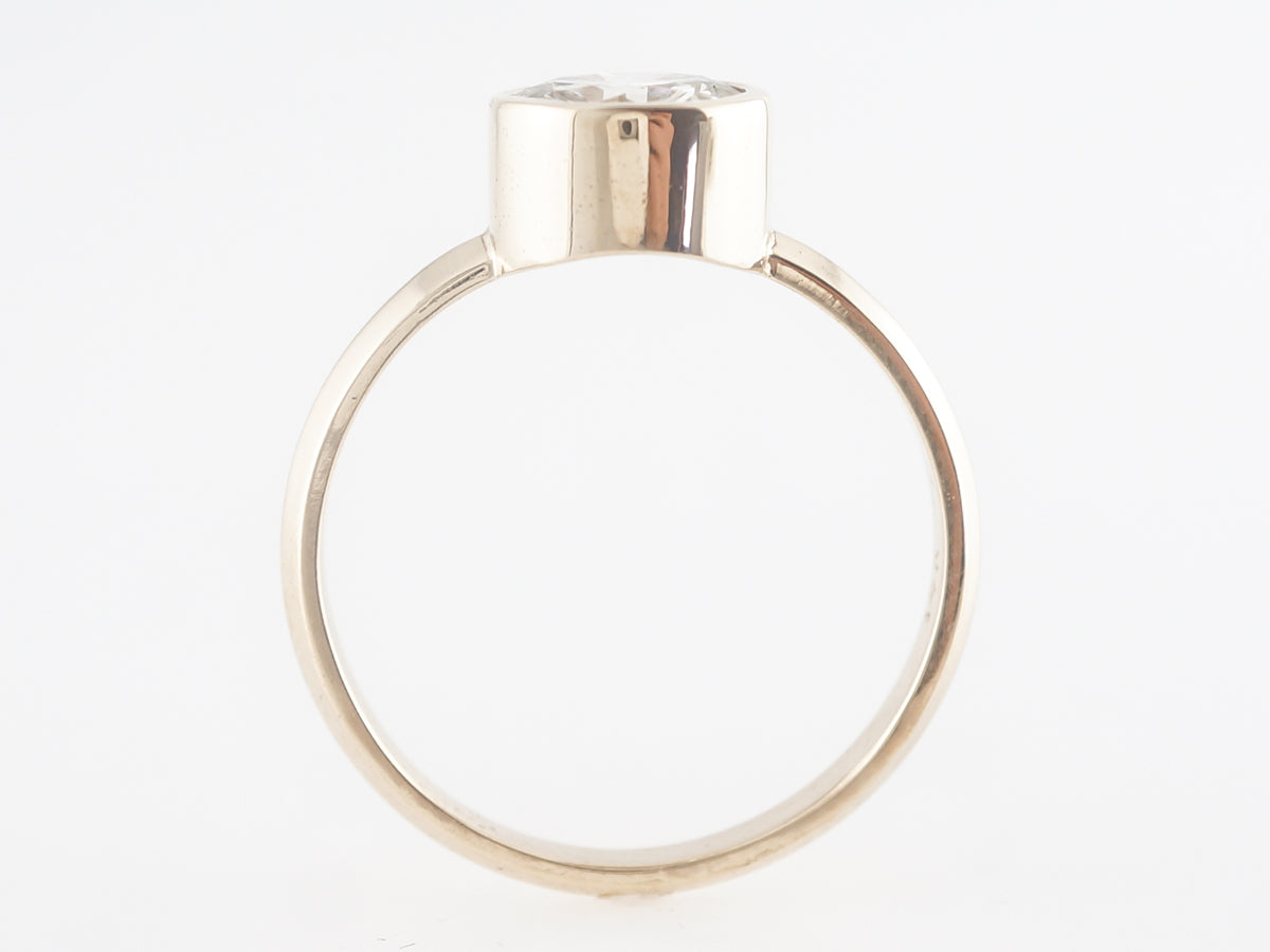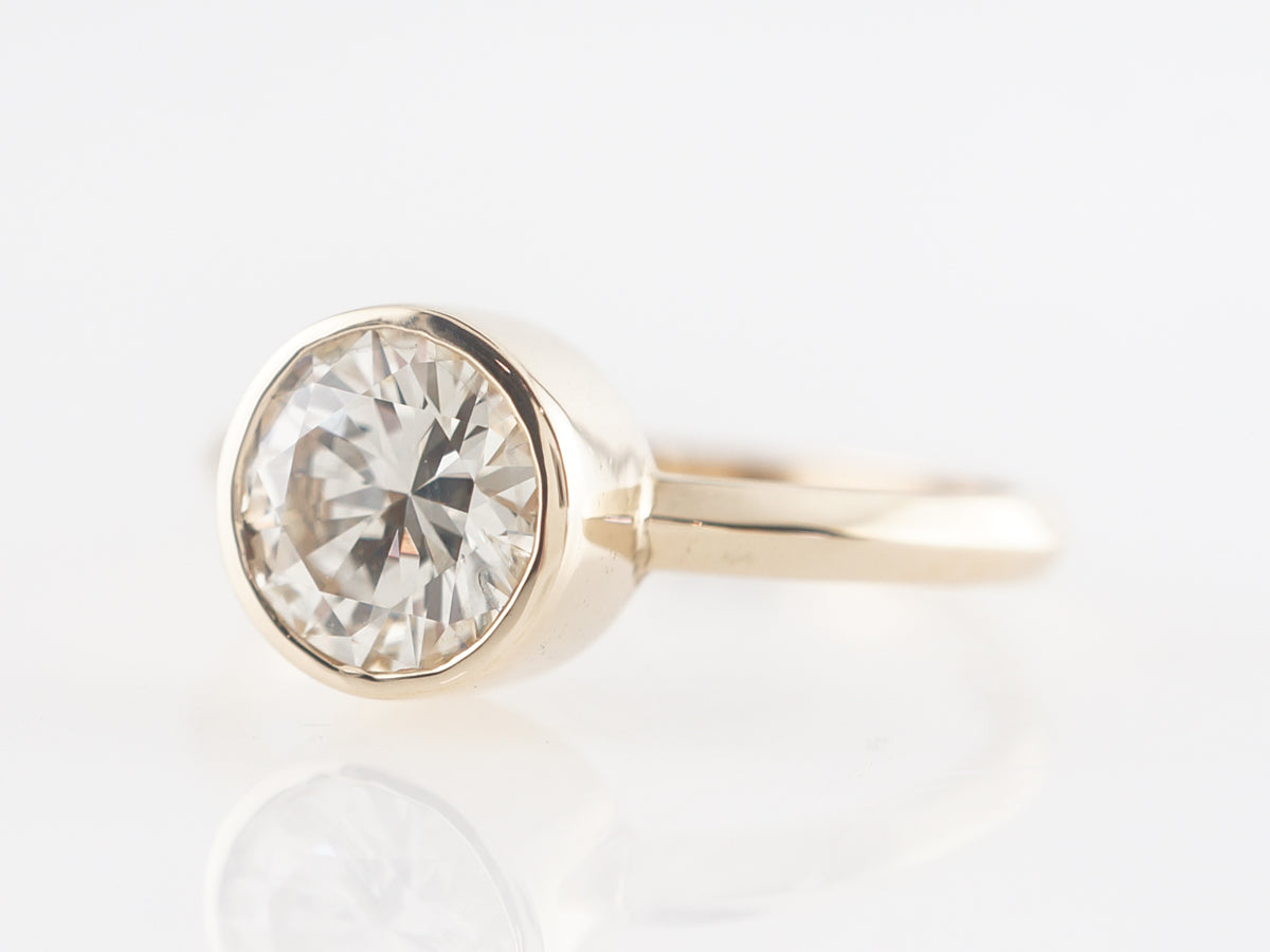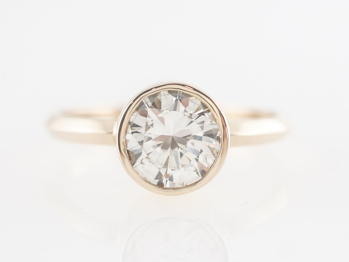 Bezel Set Solitaire Diamond Engagement Ring in 14K Yellow Gold. This modern yellow gold solitaire engagement ring features a bezel set 1.01 carat round brilliant cut diamond. This brilliant diamond is set in a simply designed mounting that has a big yellow gold appearance and nice contrast with the high quality diamond.