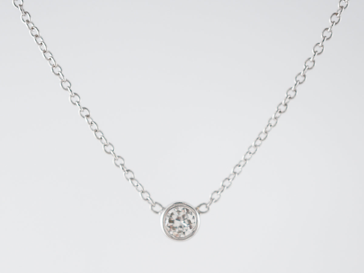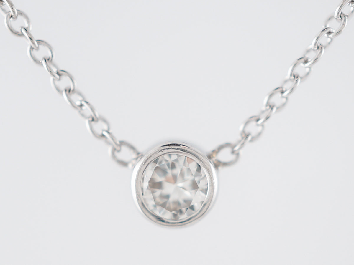 Bezel Set Solitaire Diamond Necklace in 14k White Gold. This modern necklace features a .10 carat round brilliant cut diamond. The diamond is set into a custom bezel and attached to an 18 gold chain. This diamond necklace is perfect for everyday wear and a staple of any jewelry collection.